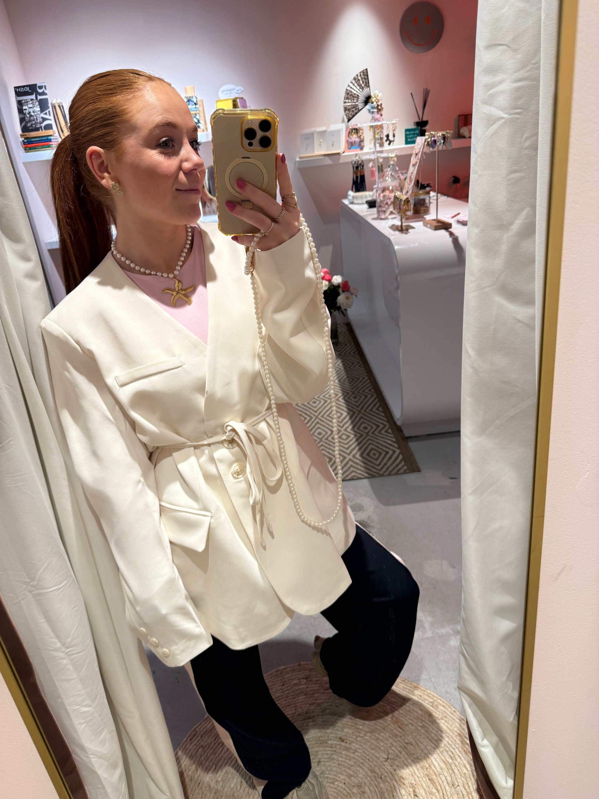 Deze witte blazer is minimal chic met een twist. Het kraagloze design en de oversized fit geven 'm een moderne, effortless look. Je kunt ’m los dragen voor die nonchalante vibe, of tailleren met het bijpassende striklint voor een vrouwelijk silhouet. Gemaakt van een soepele, nette stof die comfortabel valt. Stijlvol, clean en super easy te combineren, van business casual tot city strolls. Een classy must-have voor je wardrobe!