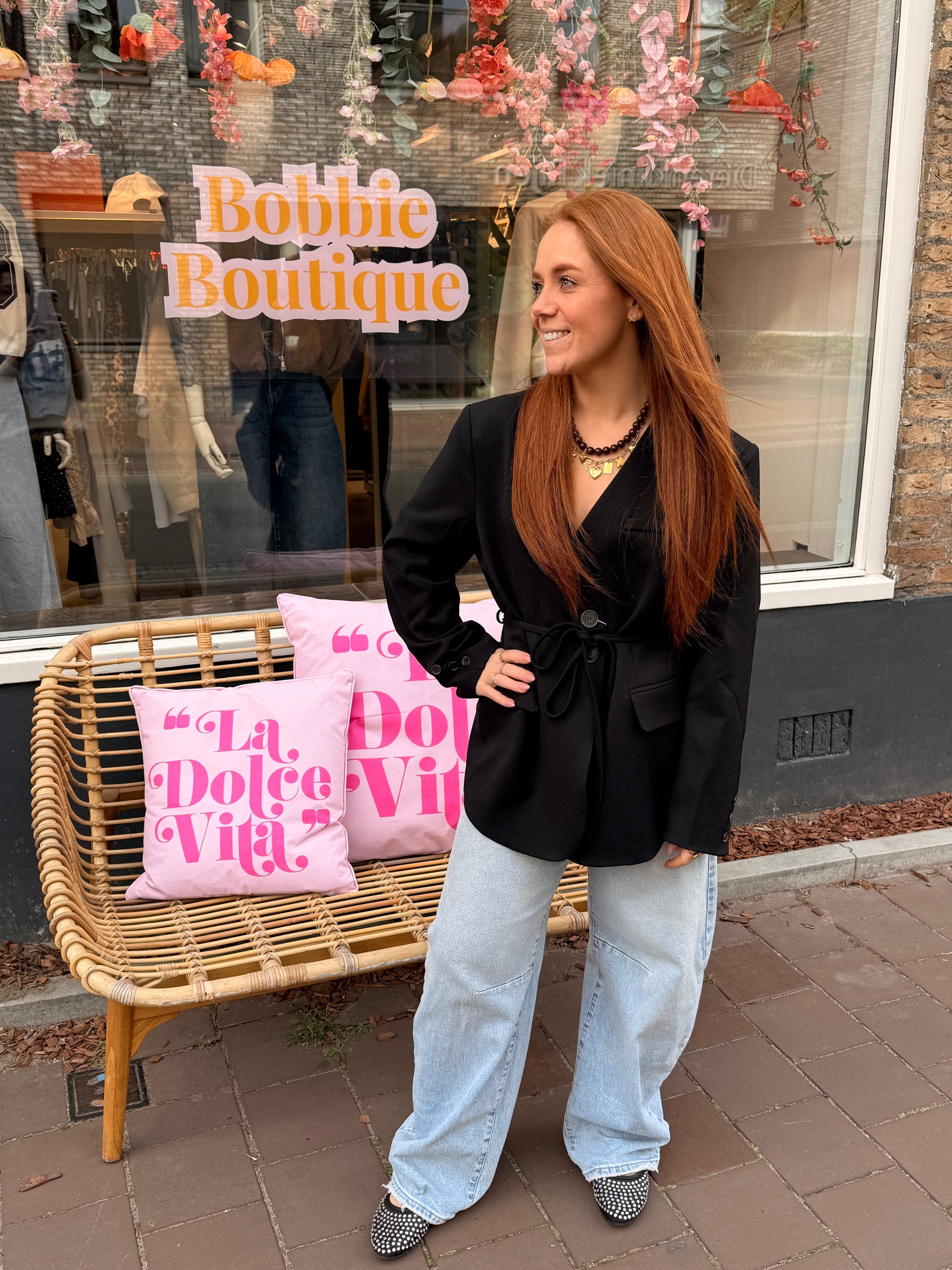 Deze zwarte blazer is minimal chic met een twist. Het kraagloze design en de oversized fit geven 'm een moderne, effortless look. Je kunt ’m los dragen voor die nonchalante vibe, of tailleren met het bijpassende striklint voor een vrouwelijk silhouet. Gemaakt van een soepele, nette stof die comfortabel valt. Stijlvol, clean en super easy te combineren, van business casual tot city strolls. Een classy must-have voor je wardrobe!