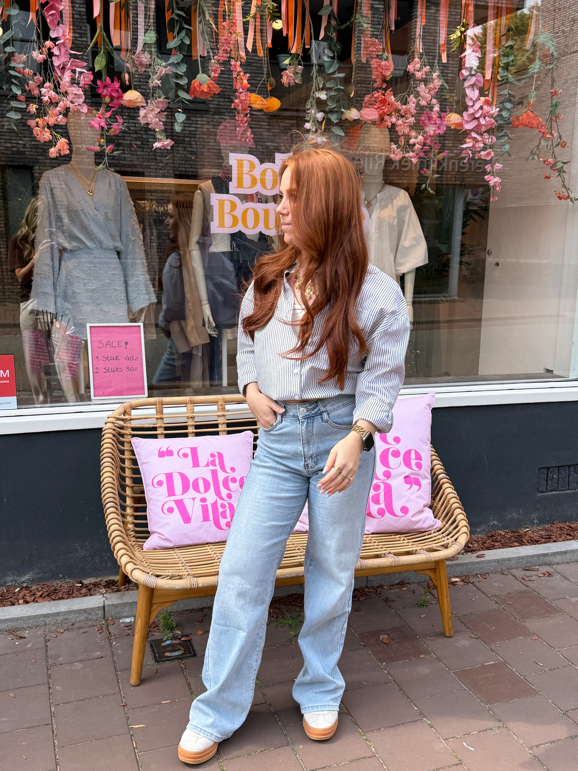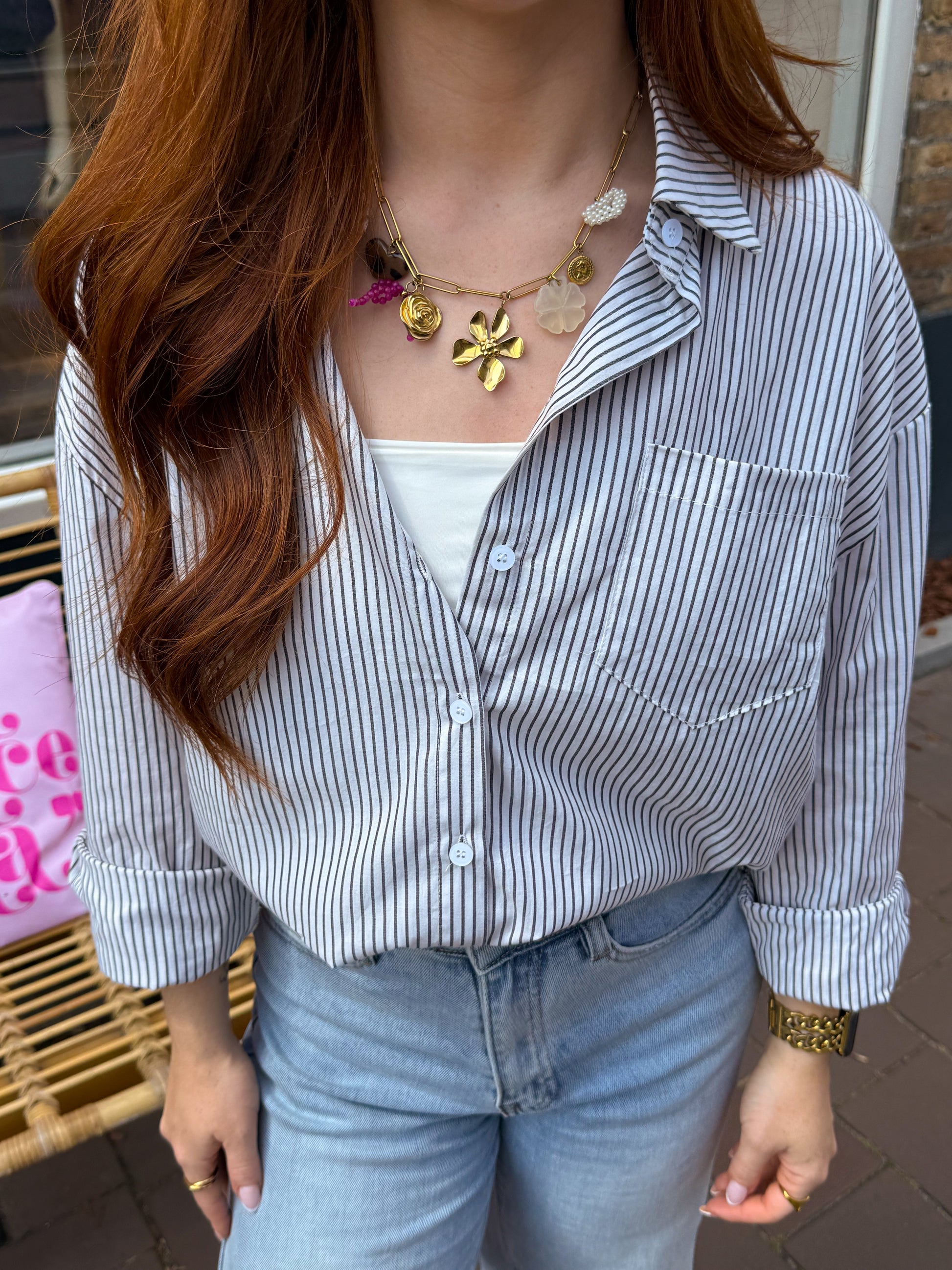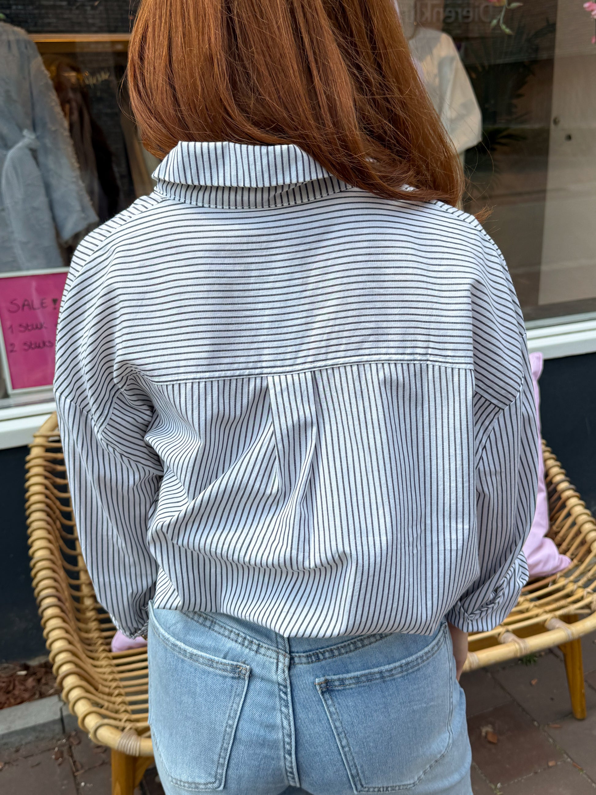 Deze grijs-wit gestreepte blouse is een echte allrounder! De iets langere pasvorm geeft een elegant en relaxed effect, terwijl je hem ook makkelijk in je broek kunt dragen voor een stoere, casual look. De subtiele streepjes en zachte grijstinten maken het een tijdloze must-have die je zowel op kantoor als in je vrije tijd stijlvol draagt.
