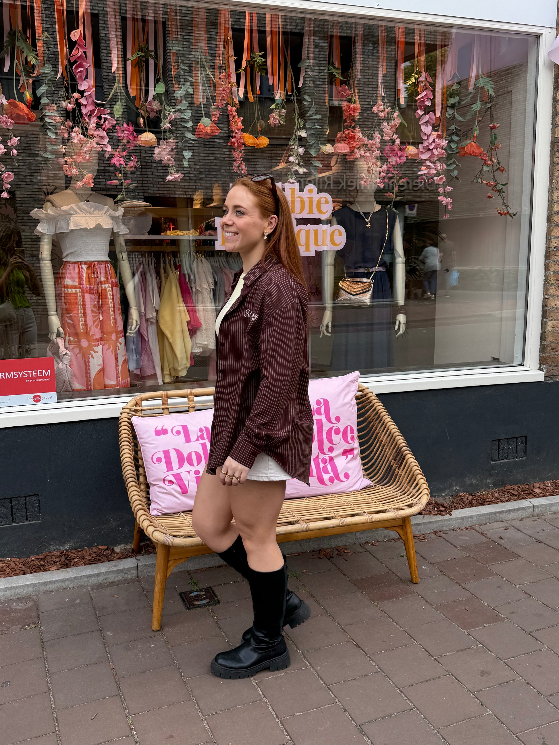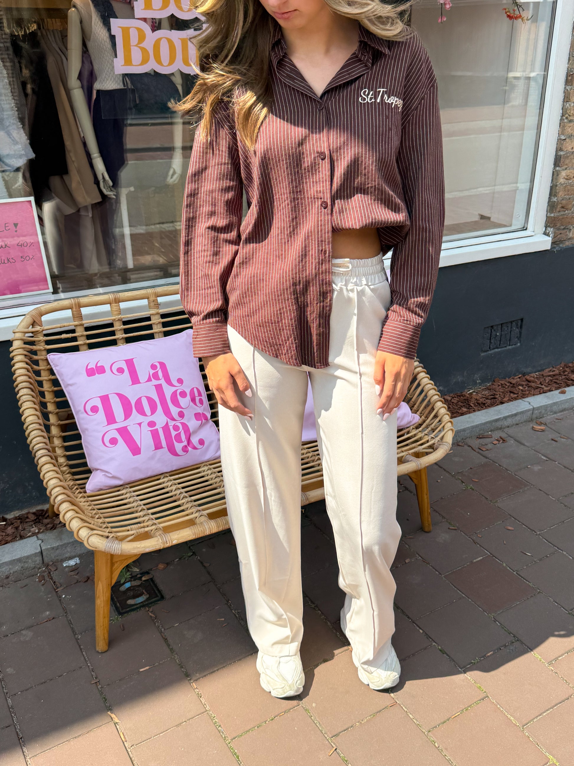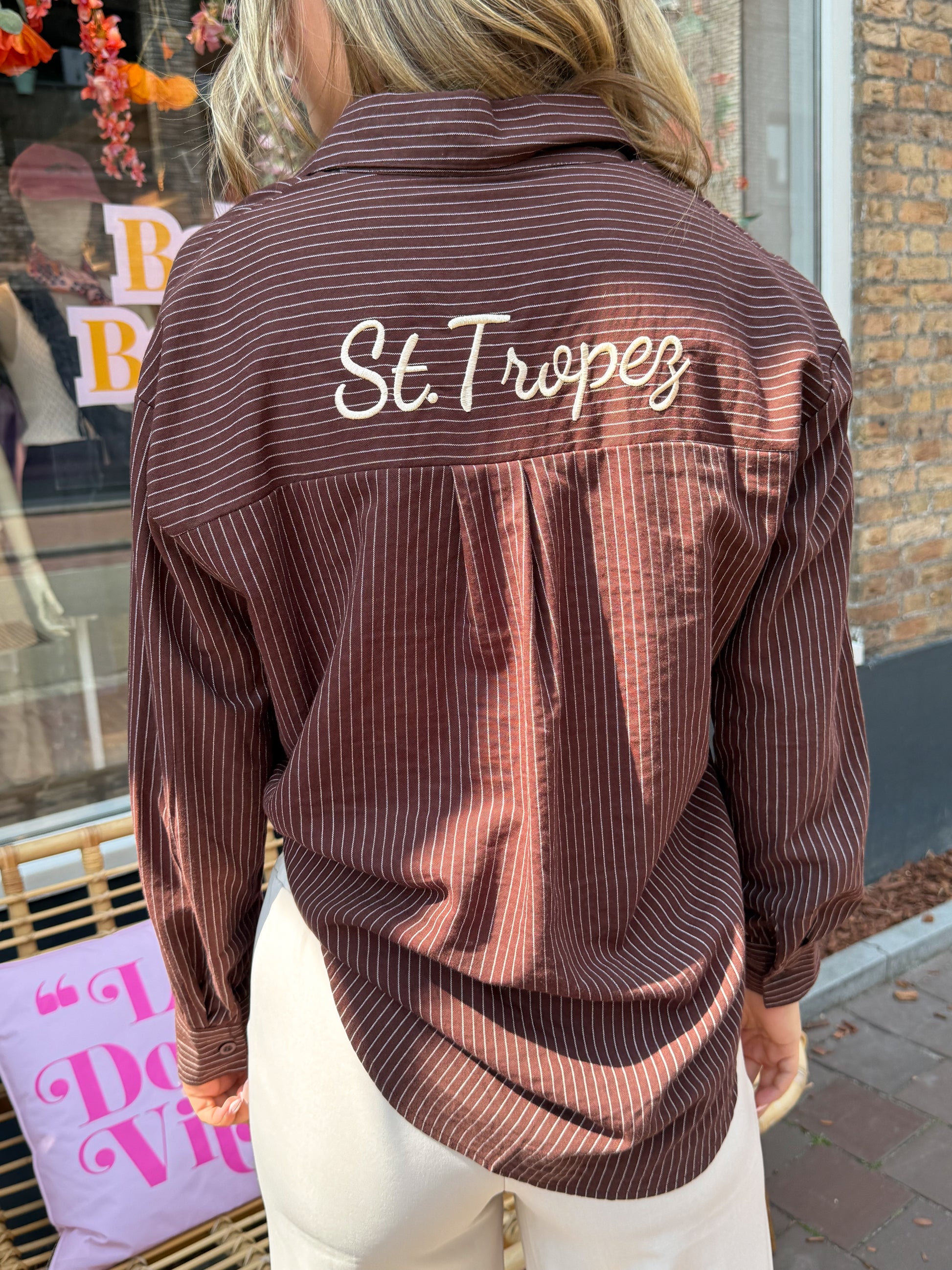 Een choco-kleurige blouse met een subtiel beige streepje en opvallende ST. Tropez print op de voor en achterkant. De luchtige pasvorm en korte mouwen geven de blouse een sportieve, maar toch stijlvolle uitstraling. Ideaal om casual te dragen met een jeans of short, of losjes over je bikini voor een zomerse, beachy look.