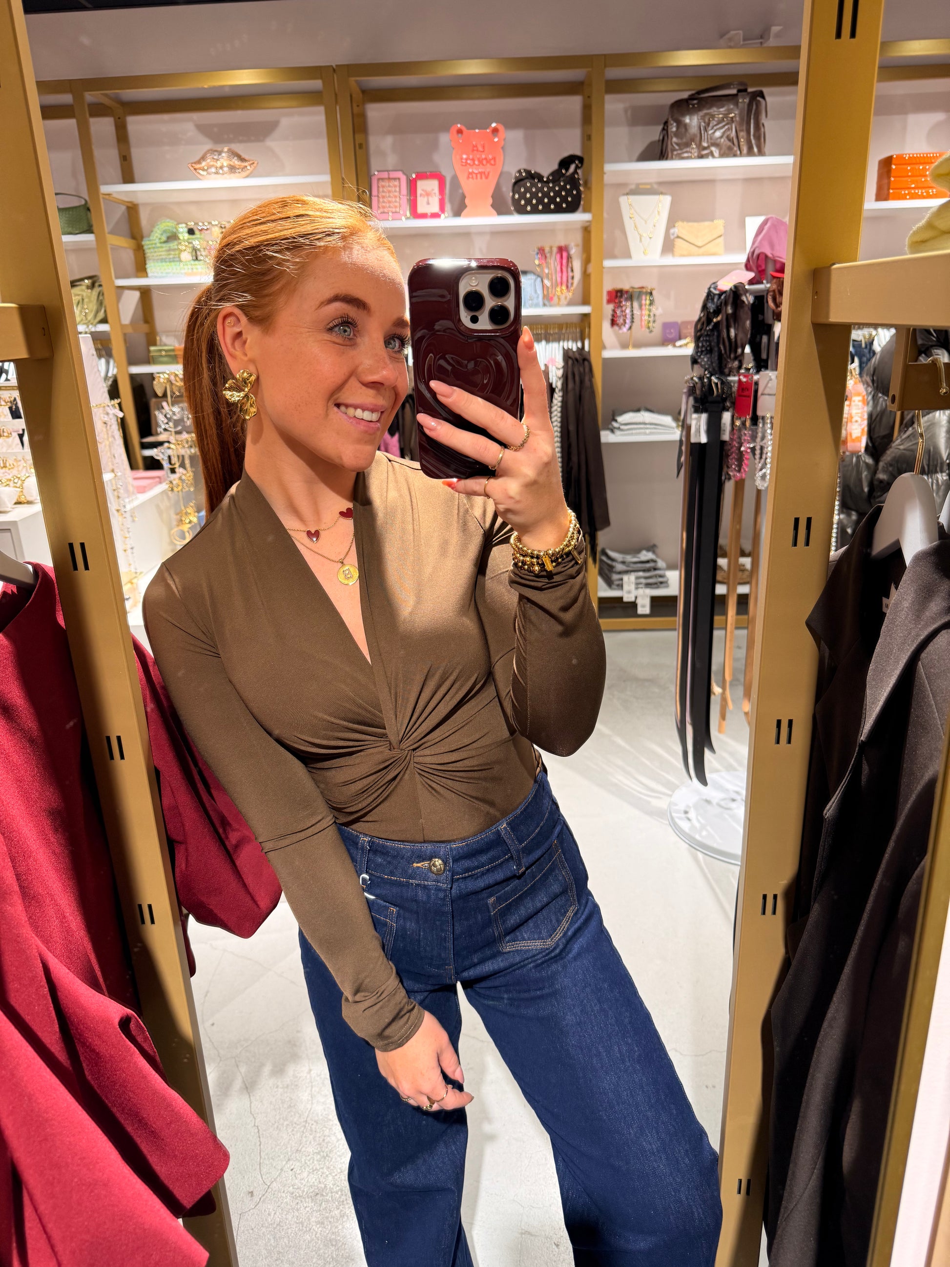 Elegant, vrouwelijk en nét dat beetje extra! Deze bruine body heeft een diepe V-hals die eindigt in een speels knoopdetail voor een stijlvolle touch. Perfect om te dragen onder een blazer, met een rok of je favoriete jeans voor een classy en trendy look.