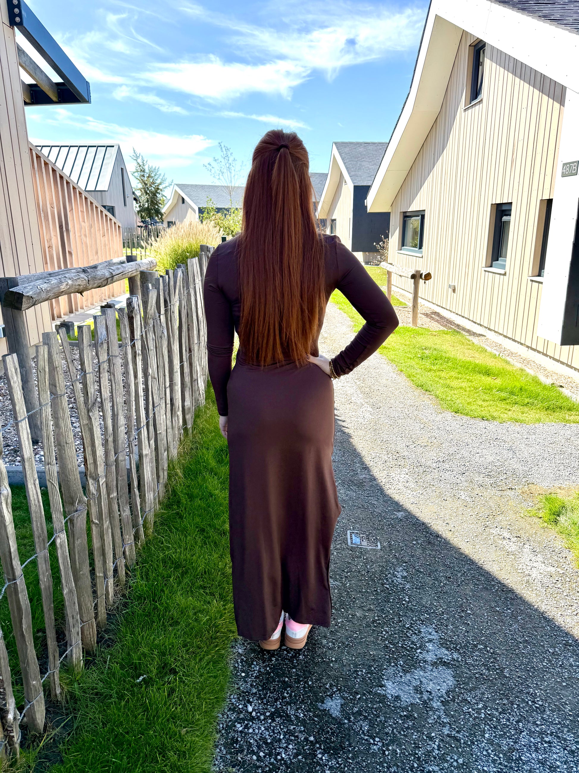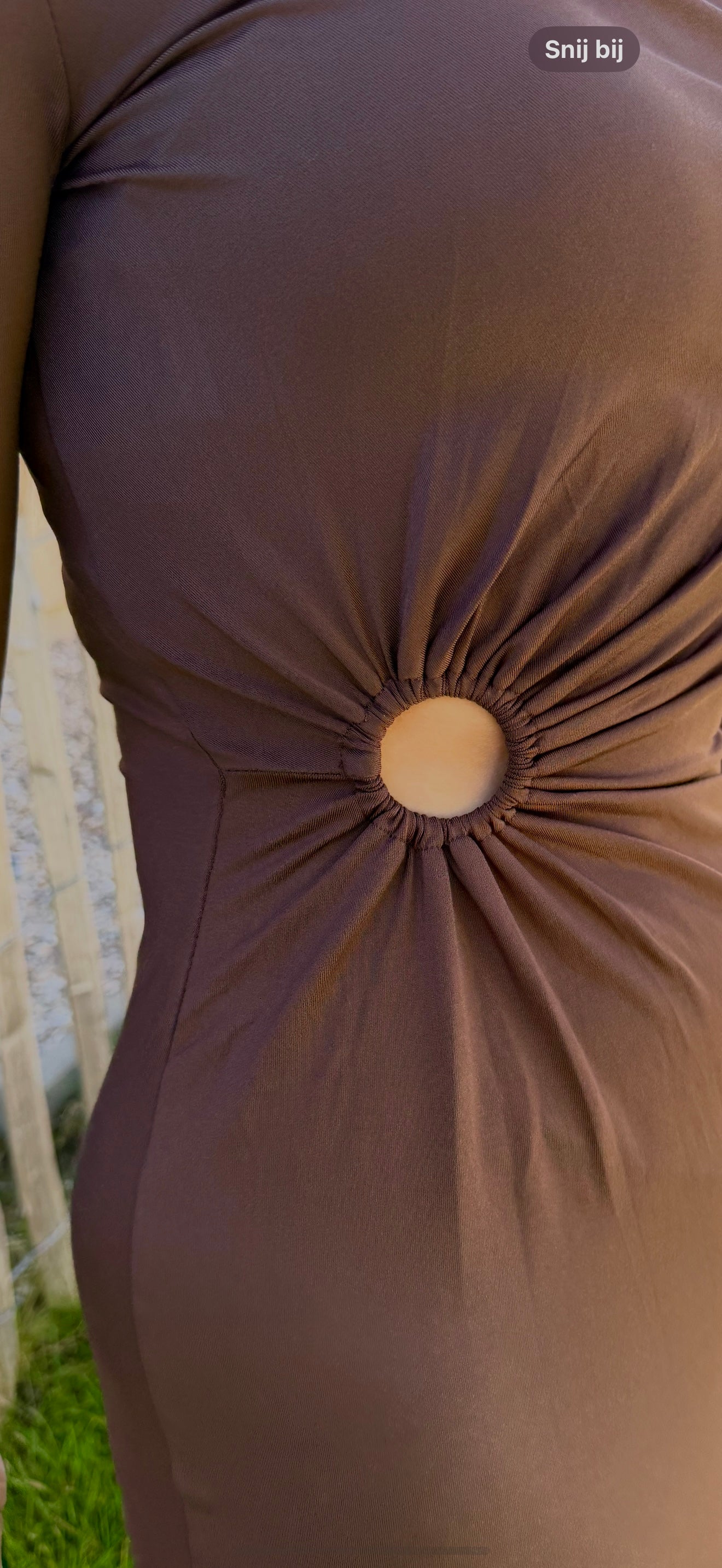 Stijlvol en supercomfortabel! Deze lange, strakke jurk in een warme bruine kleur is gemaakt van een stretchy stof die mooi aansluit op het lichaam. Het ronde open detail aan de zijkant geeft de jurk een speelse, feminine touch, terwijl de split zorgt voor een elegante en vrouwelijke uitstraling. Perfect voor een avondje uit, een diner of een feestje waar je nét dat beetje extra wilt stralen. Combineer met hakken en een clutch voor een classy look, of met sneakers en een leren jasje voor een stoere twist.