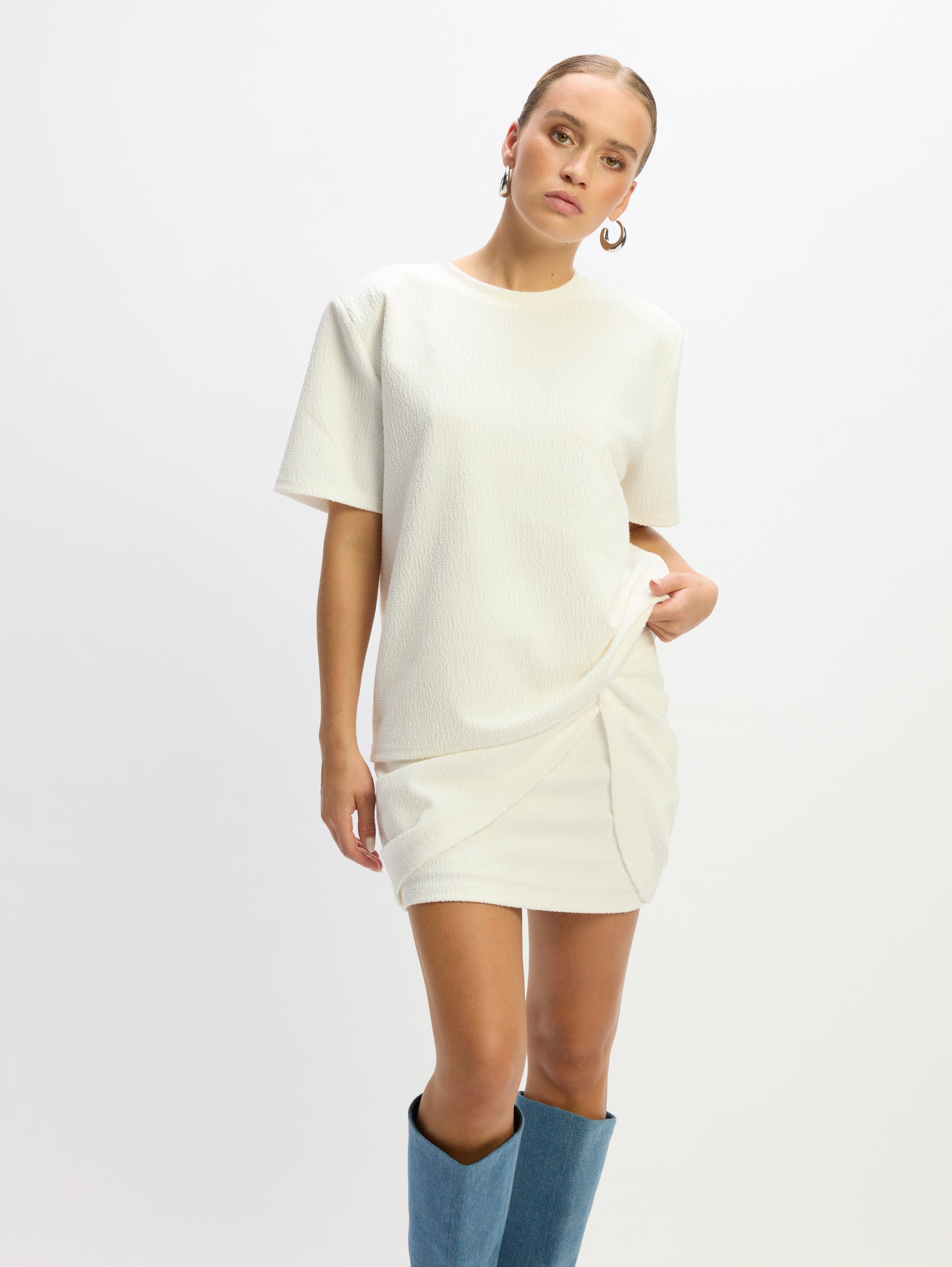 Dit witte T-shirt heeft een relaxte, oversized pasvorm voor een casual en comfortabele look. Het T-shirt heeft een bouclé stof wat het unieke touch geeft. Perfect te combineren met jeans, shorts of een rok voor een moeiteloze en trendy outfit.