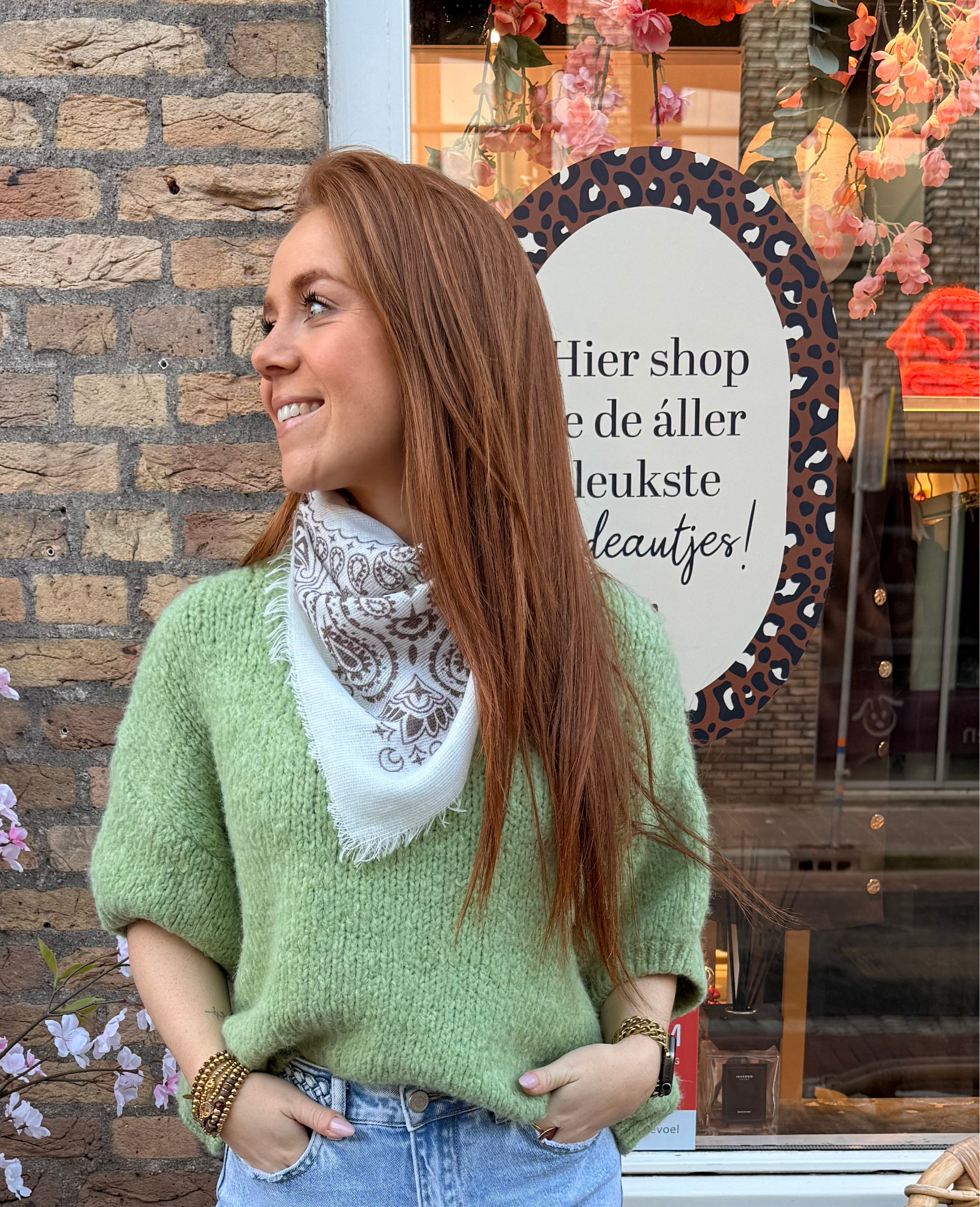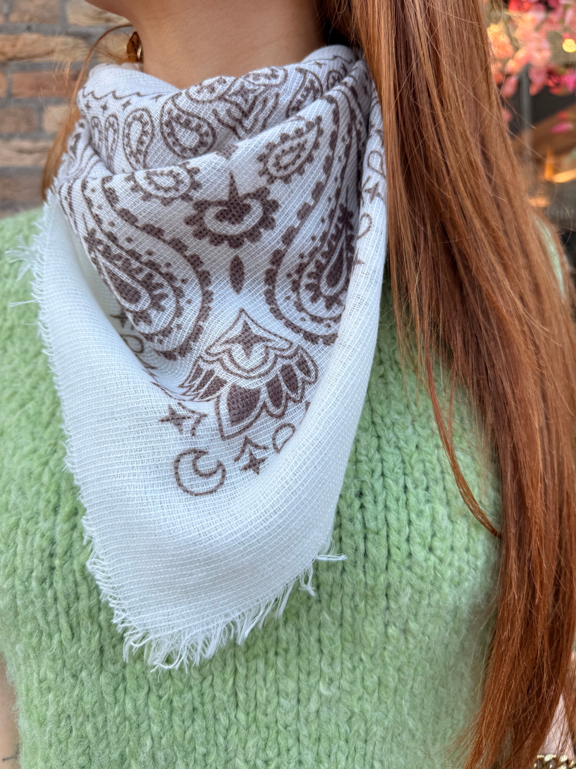 Deze stoffen driehoek sjaal van Fee Teatro is de perfecte finishing touch voor elke outfit. Licht, soepel en makkelijk te dragen – knoop ’m nonchalant om je hals, in je haar of aan je tas voor een extra styling detail.