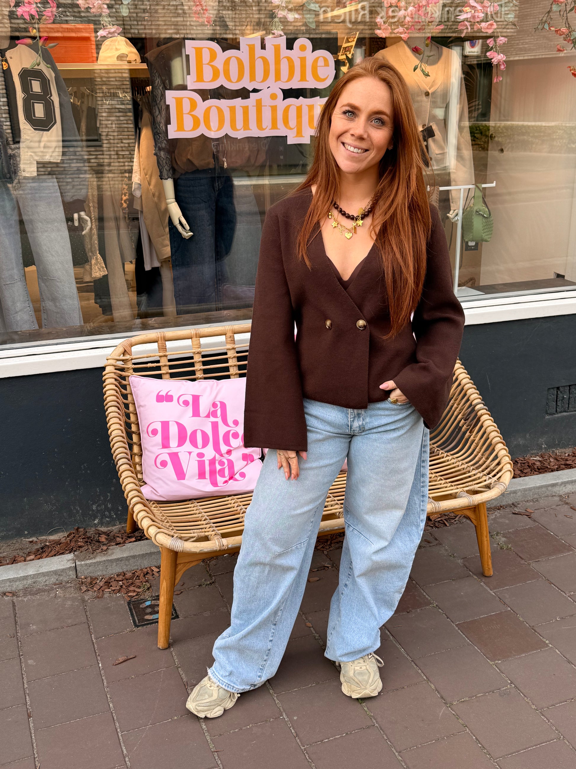 Chic, cosy en supervrouwelijk! Dit gebreide vest heeft een beetje wijd uitlopende mouwen en een rij stijlvolle knopen, waardoor het een speelse en trendy touch krijgt. Perfect om met een jeans te combineren of als statement piece over een jurkje of top.