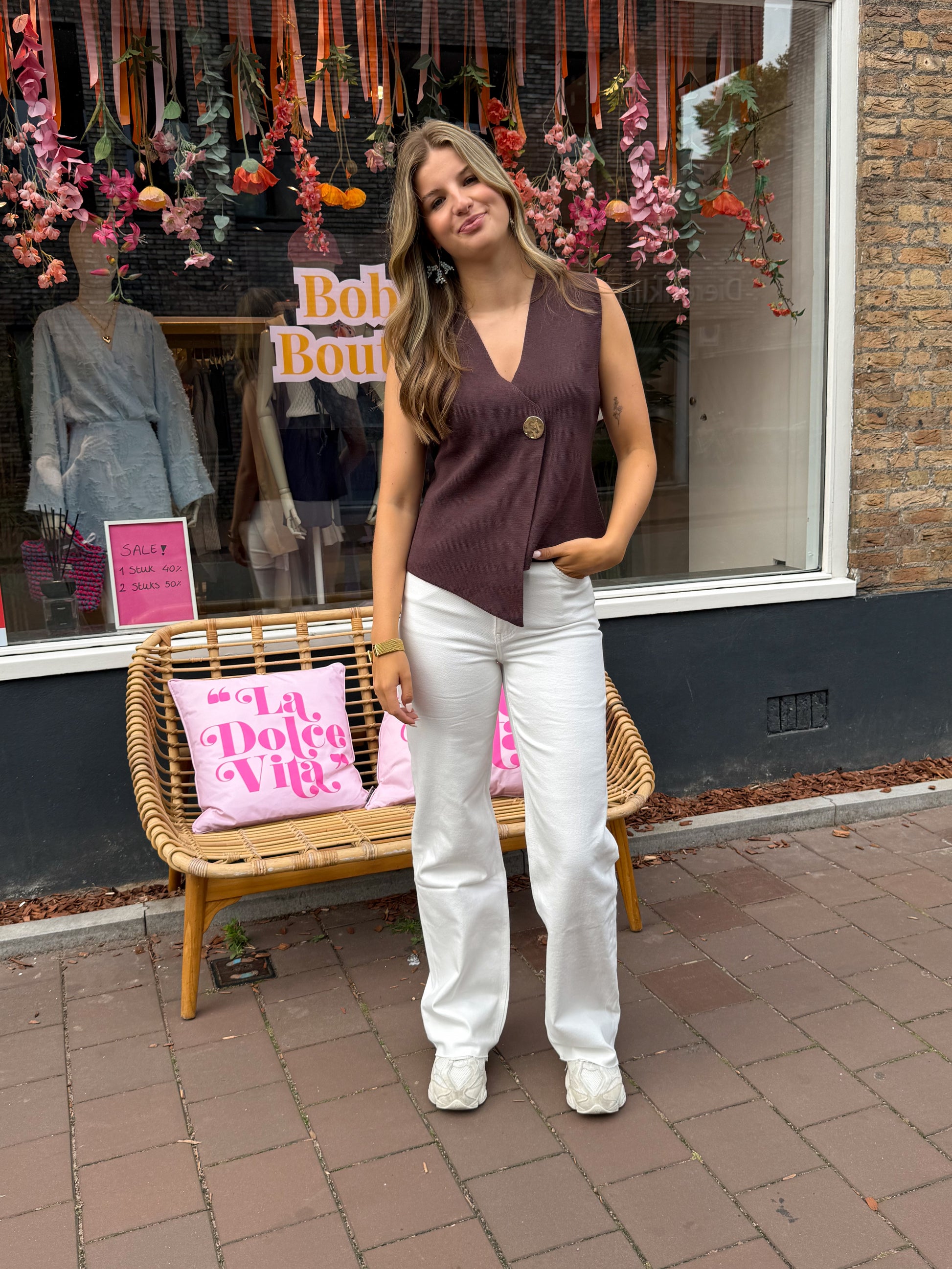 Dit gebreide gilet in een warme choco kleur heeft een elegante, iets schuine onderkant en een opvallende gouden knoop voor een chique touch. Het zachte, comfortabele materiaal zorgt voor een cozy en stijlvolle look. Perfect te combineren met een blouse, T-shirt of bijpassende broek voor een complete en trendy outfit.