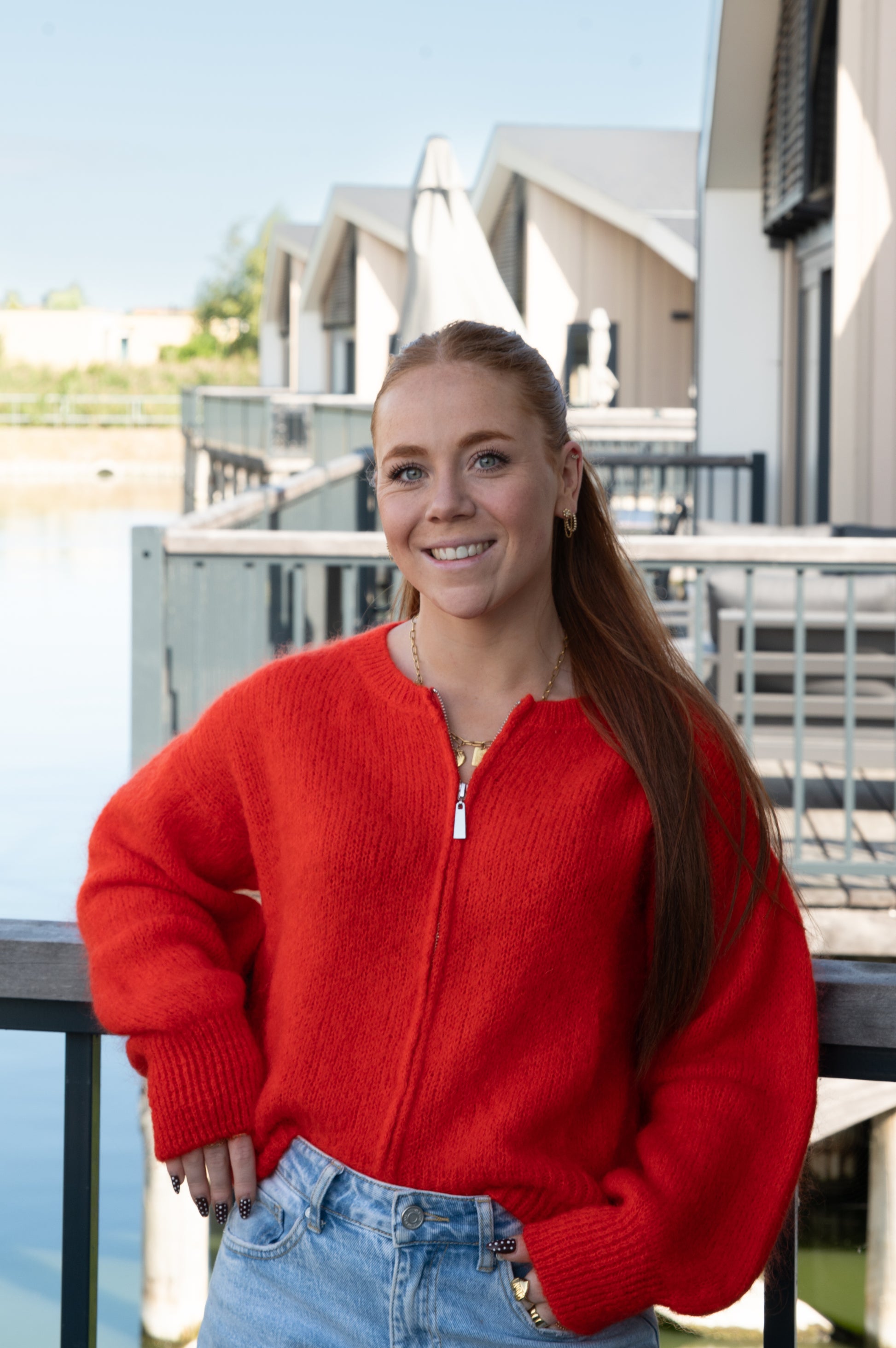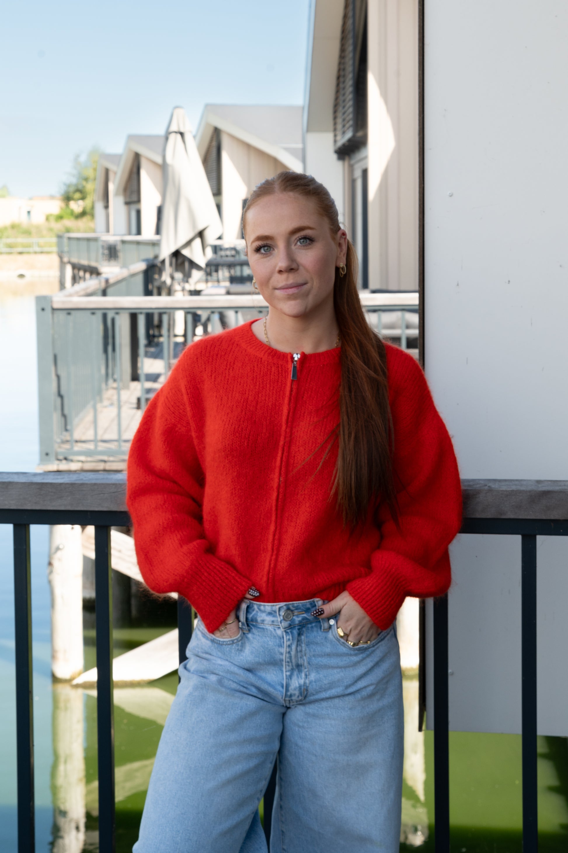 Zacht, cosy en toch een tikkeltje stoer! Dit fijngebreide vestje in een warme oranje-rode kleur voelt heerlijk comfortabel aan en heeft een rits voor een moderne, stoerdere uitstraling. Perfect om casual te dragen met een jeans of juist stijlvol te combineren over een jurk.