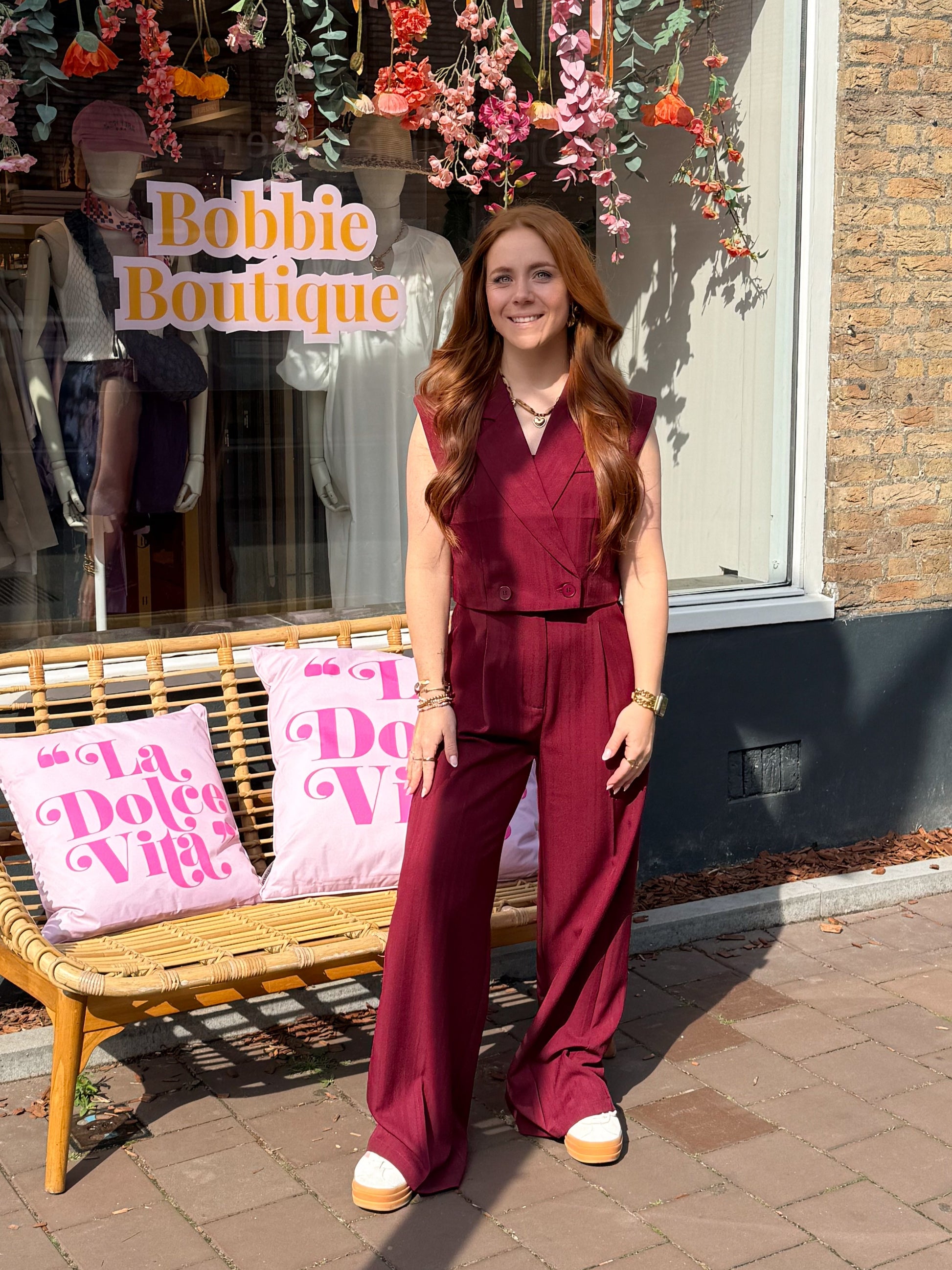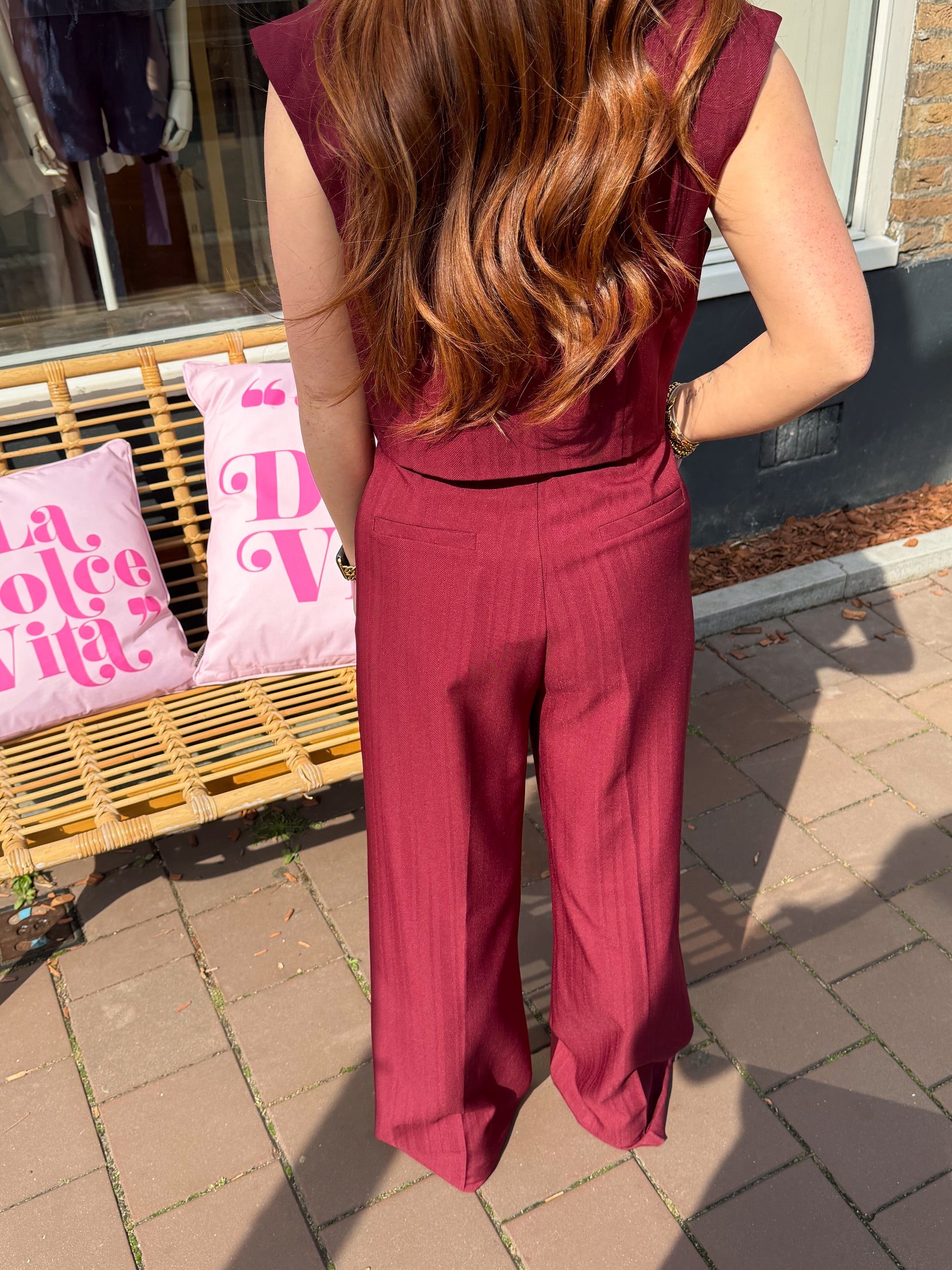 Dit bordeaux gilet is stijlvol, en helemaal on trend kleur. De subtiele streep geeft het een chique touch, terwijl de klassieke snit en nette knoopsluiting zorgen voor een elegante uitstraling. Gemaakt van stevige stof met een lichte stretch, waardoor het comfortabel zit en mooi in model blijft. Perfect te combineren met de bijpassende pantalon voor een complete, on-trend set, of los te dragen over een blouse of T-shirt voor een casual-chic look.