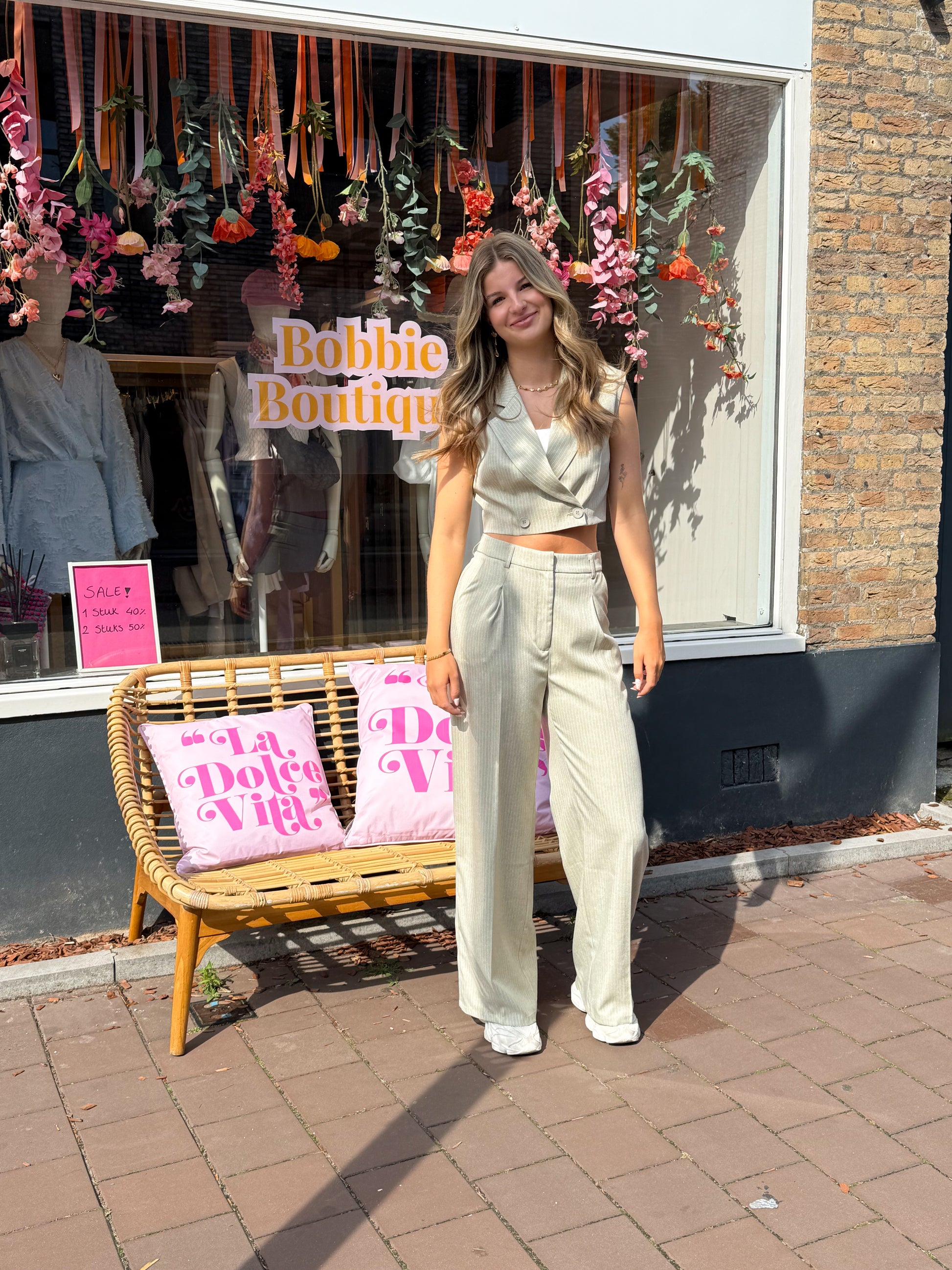 Dit lichtgroene gilet is stijlvol, fris en helemaal van nu. De subtiele streep geeft het een chique touch, terwijl de klassieke snit en nette knoopsluiting zorgen voor een elegante uitstraling. Gemaakt van stevige stof met een lichte stretch, waardoor het comfortabel zit en mooi in model blijft. Perfect te combineren met de bijpassende pantalon voor een complete, on-trend set, of los te dragen over een blouse of T-shirt voor een casual-chic look.