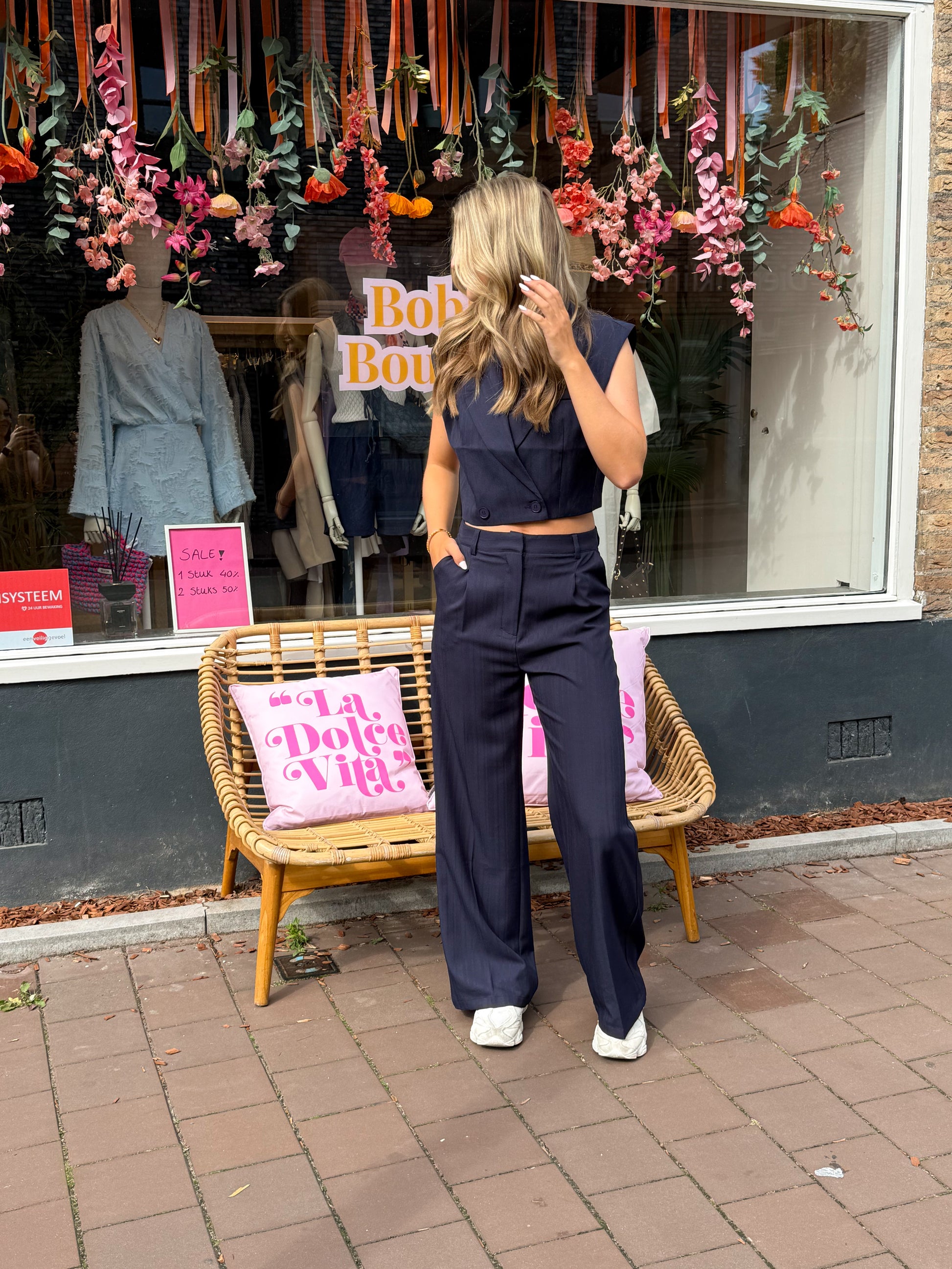 Dit navy gilet is stijlvol, fris en helemaal van nu. De subtiele streep geeft het een chique touch, terwijl de klassieke snit en nette knoopsluiting zorgen voor een elegante uitstraling. Gemaakt van stevige stof met een lichte stretch, waardoor het comfortabel zit en mooi in model blijft. Perfect te combineren met de bijpassende pantalon voor een complete, on-trend set, of los te dragen over een blouse of T-shirt voor een casual-chic look.