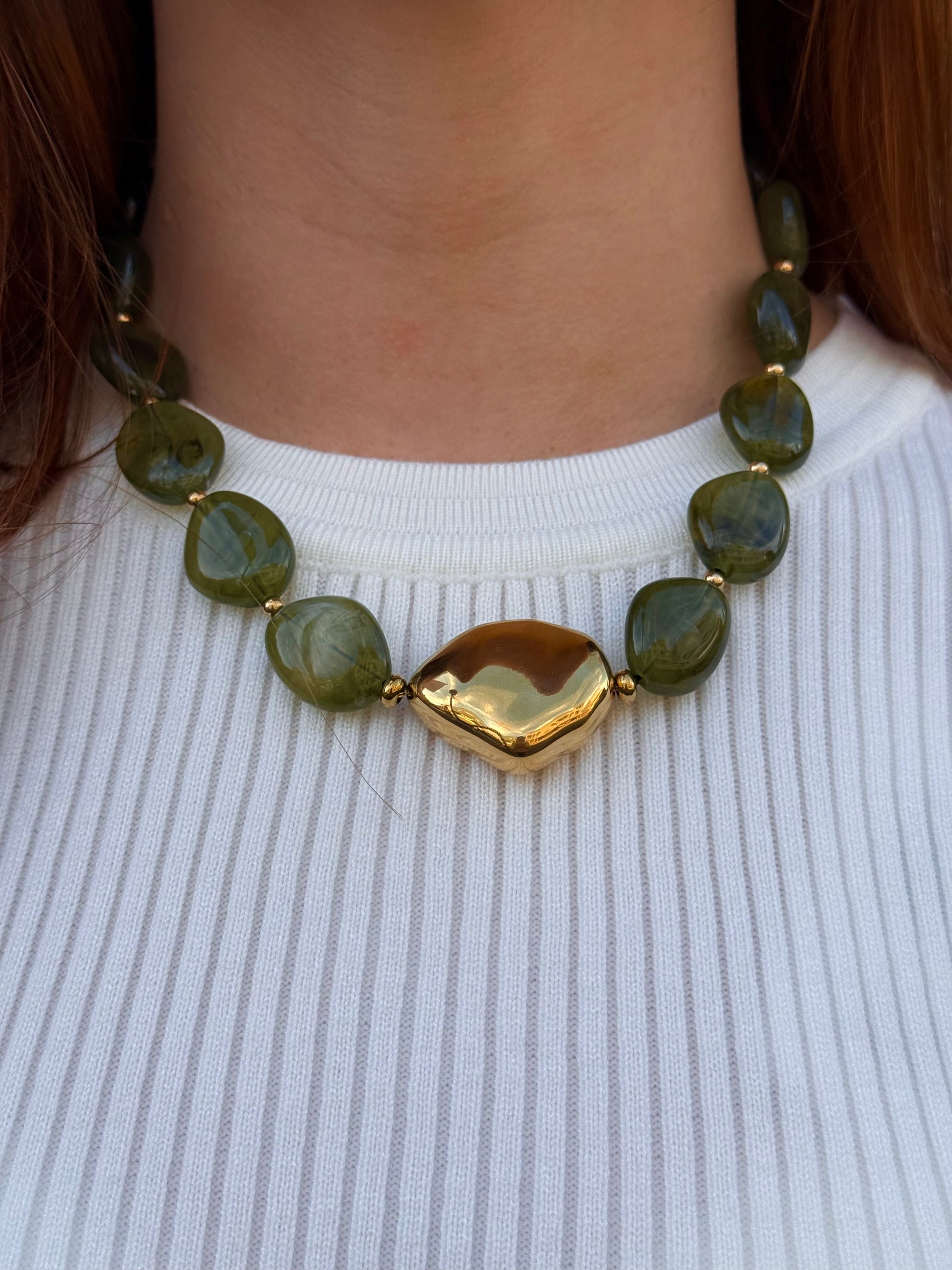 Maak je outfit compleet met deze prachtige ketting! De opvallende groene ‘stenen’ geven een stijlvolle en luxe uitstraling, terwijl het gouden detail zorgt voor een elegante finishing touch. Een echte statement piece die je look laat stralen – of je hem nu draagt bij een simpele top of een chique avondjurk.