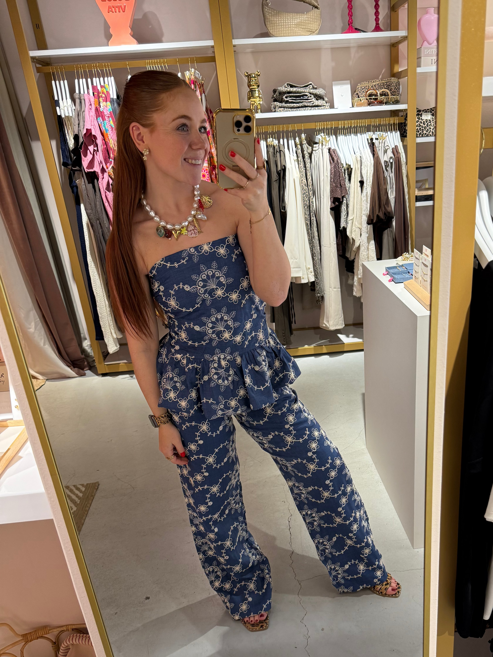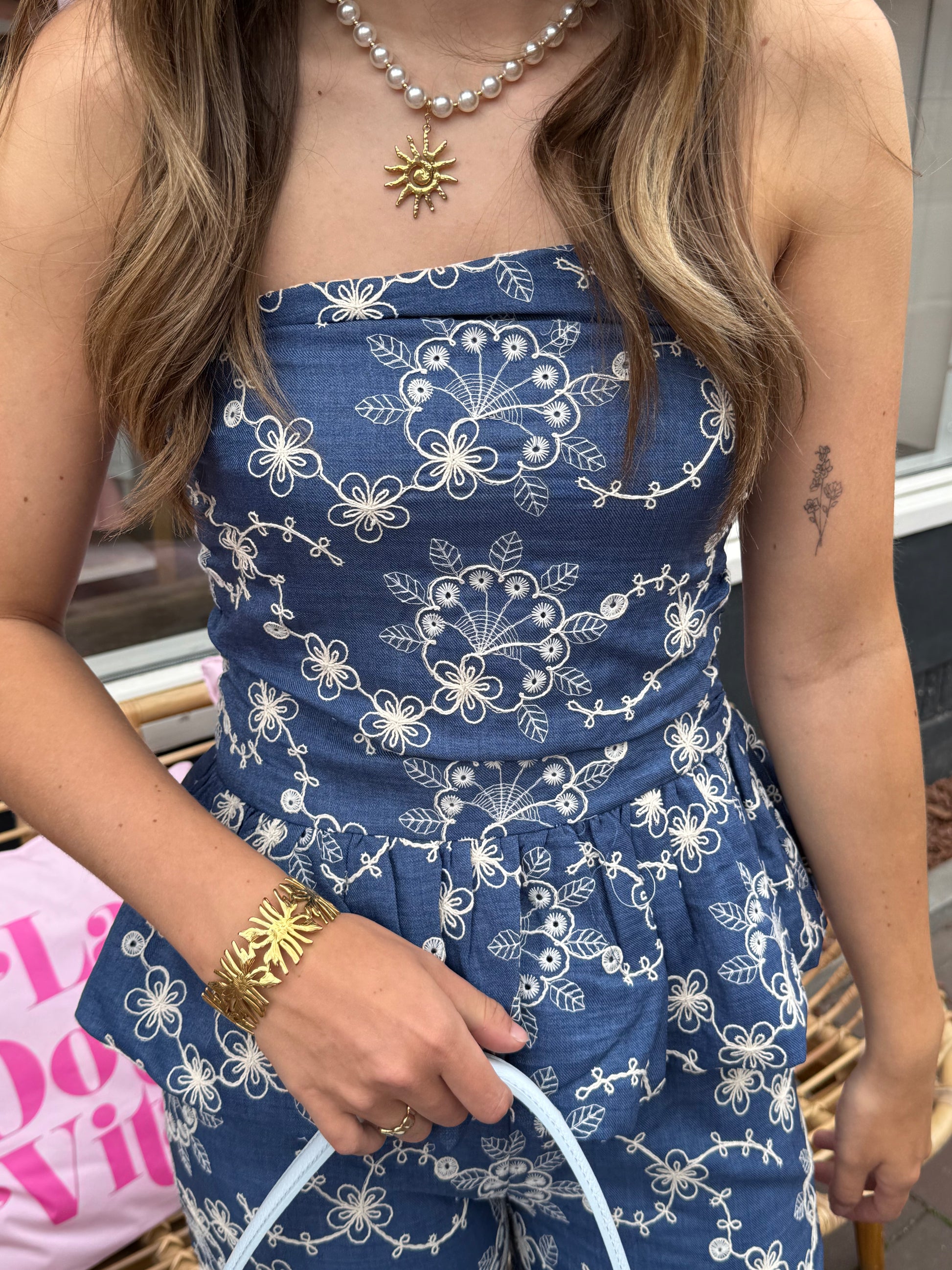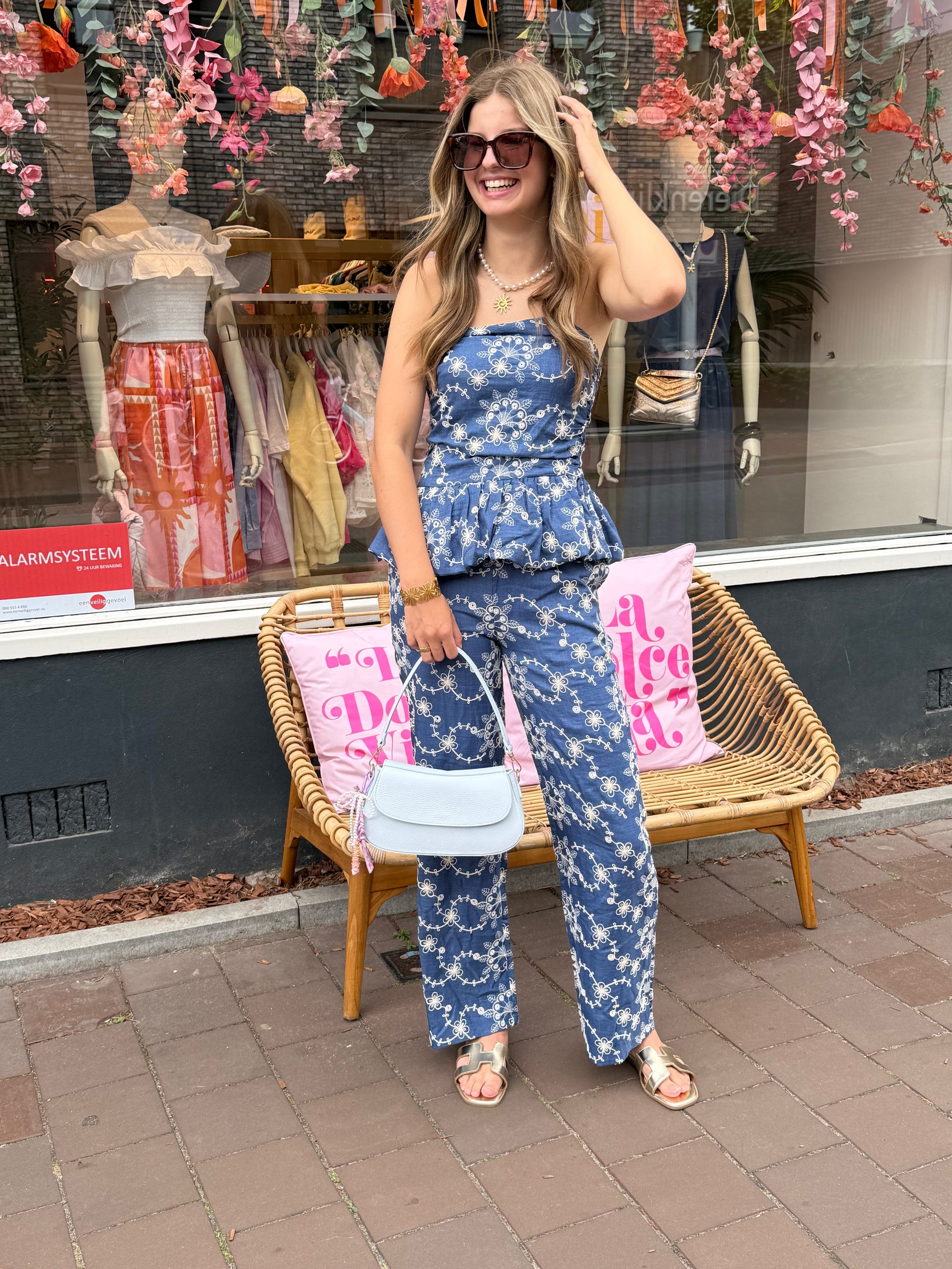 Deze zomerse off shoulder top in helderblauw straalt bohemian charme uit. De witte, sierlijke borduursels geven een speelse en elegante touch, terwijl de luchtige stof zorgt voor optimaal draagcomfort. Perfect te combineren met de bijpassende broek voor een complete set, of draag hem los met jeans of een rok voor een casual, stijlvolle look.