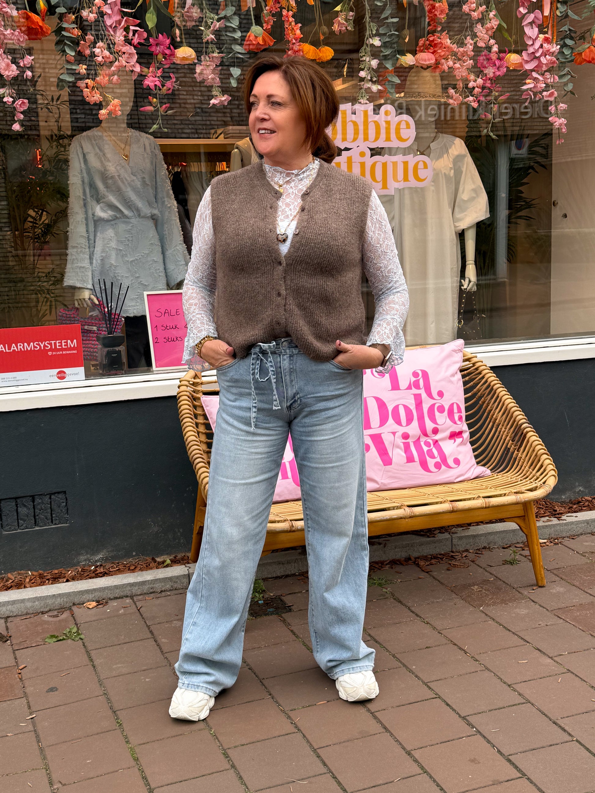 Dit veelzijdige gebreide vest in een warme bruine kleur kan zowel als gilet of als vest gedragen worden. Het heeft een zachte, comfortabele stof en een tijdloze uitstraling met knoopjes aan de voorkant. Perfect om los te dragen over een top of dichtgeknoopt voor een cozy en stijlvolle look.