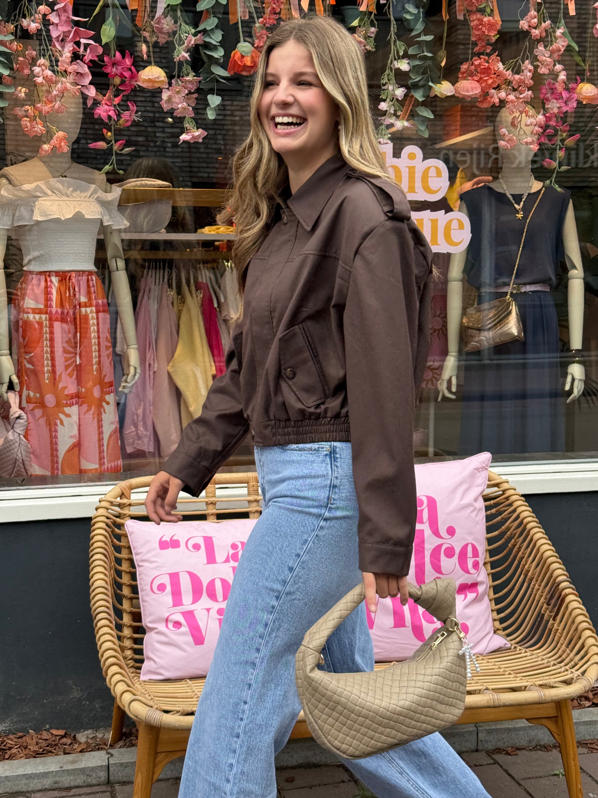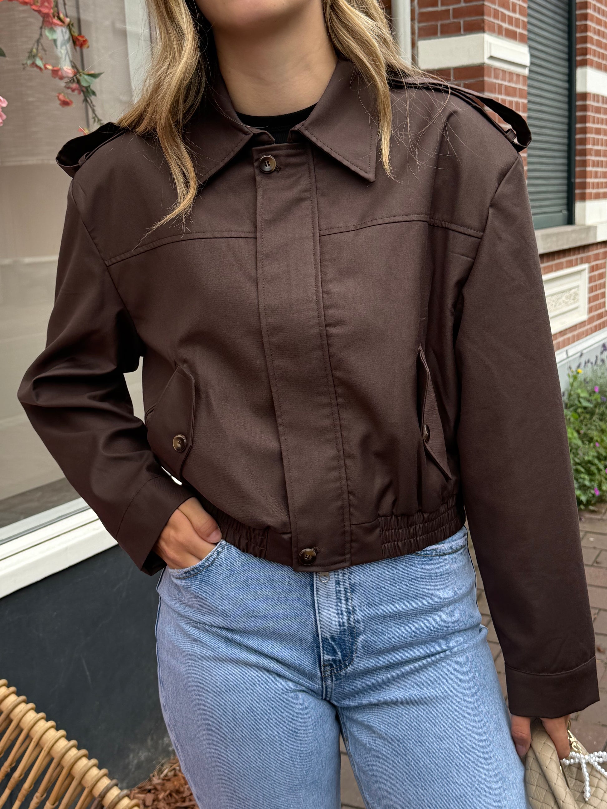 Dit cropped jasje in een warme, bruine tint is de perfecte mix van stoer en stijlvol. De korte fit accentueert je taille en combineert moeiteloos met zowel een high-waisted jeans als een zwierige rok. Gemaakt van een zachte, stevige stof met een comfortabele pasvorm. Draag ‘m open over een basic top of dicht als eyecatcher van je outfit. Een must-have laagje voor elk seizoen!
