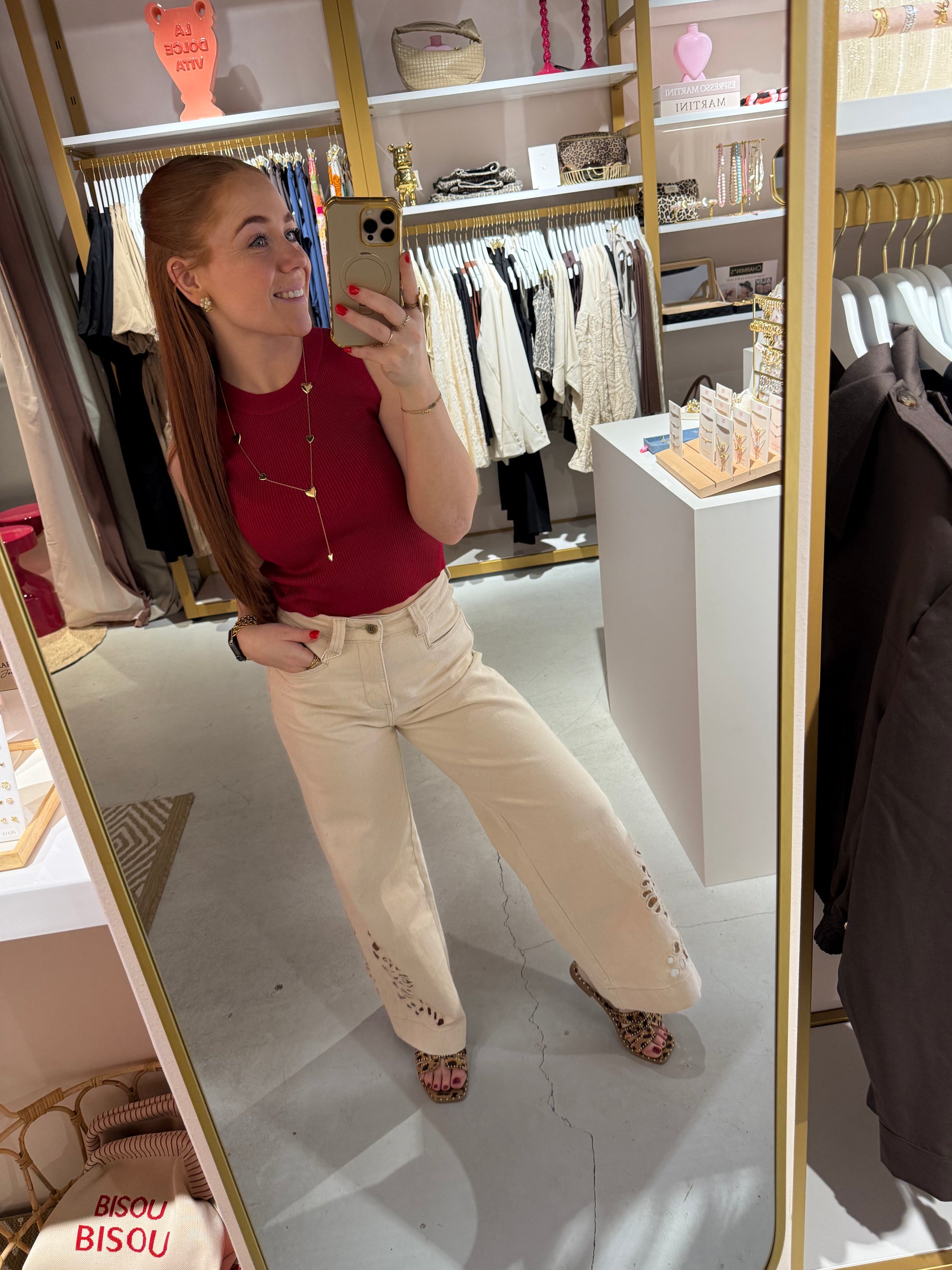 Deze broderie jeans heeft een comfortabele stof die perfect aansluit op je lichaam. De mooie pasvorm combineert moeiteloos stijl en draagcomfort, ideaal voor een trendy en edgy look. Combineer met een basic T-shirt, blouse of top voor een complete outfit.