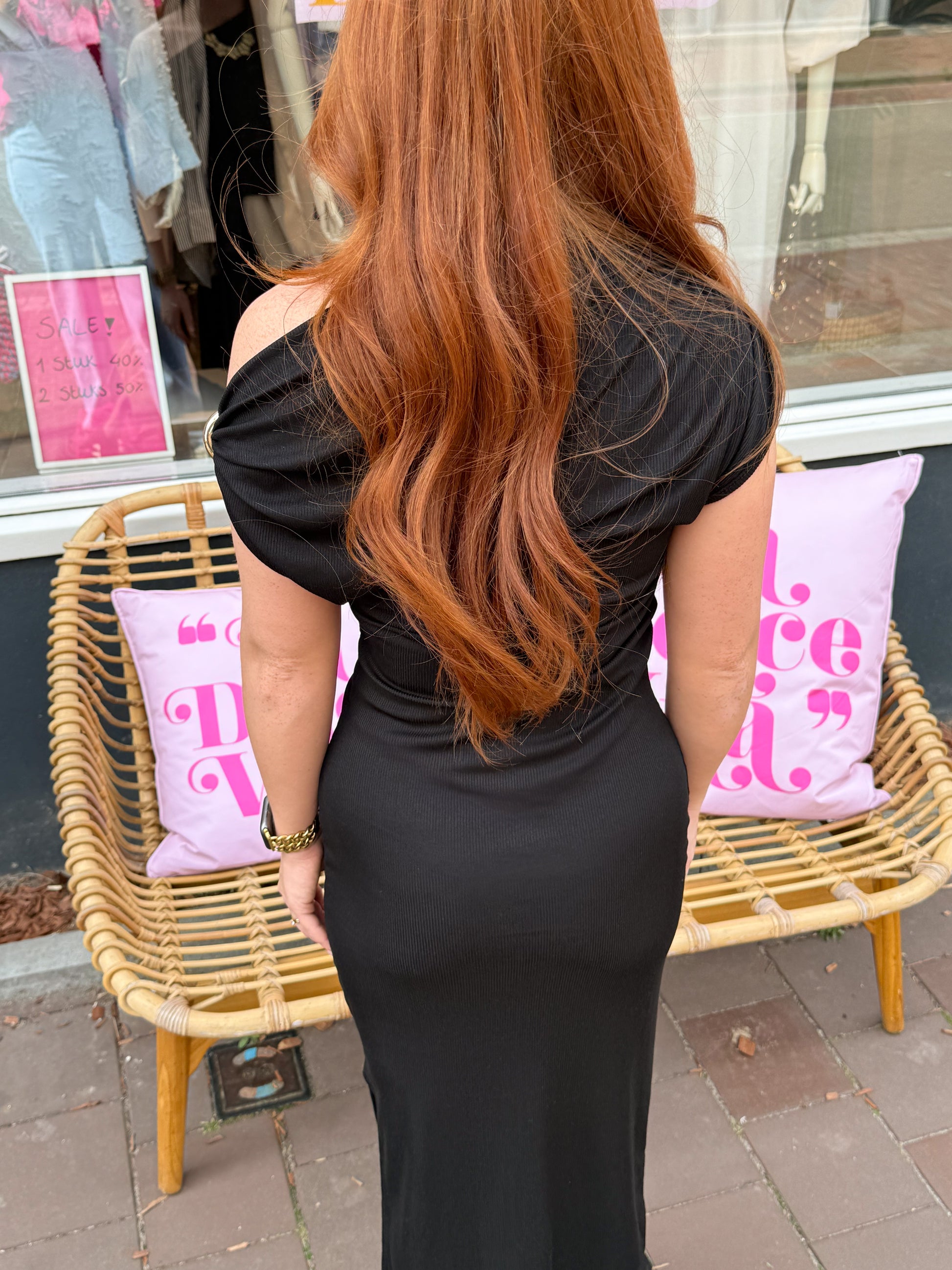 Deze lange, strakke jurk is een echte eyecatcher! Het opvallende open-schouderdetail aan één kant en het subtiele gouden accent geven een elegante, luxe touch. Perfect voor een feestelijke gelegenheid, een diner of een avondje uit. Aangesloten, stijlvol en met net dat beetje extra glamour dat jouw look compleet maakt.
