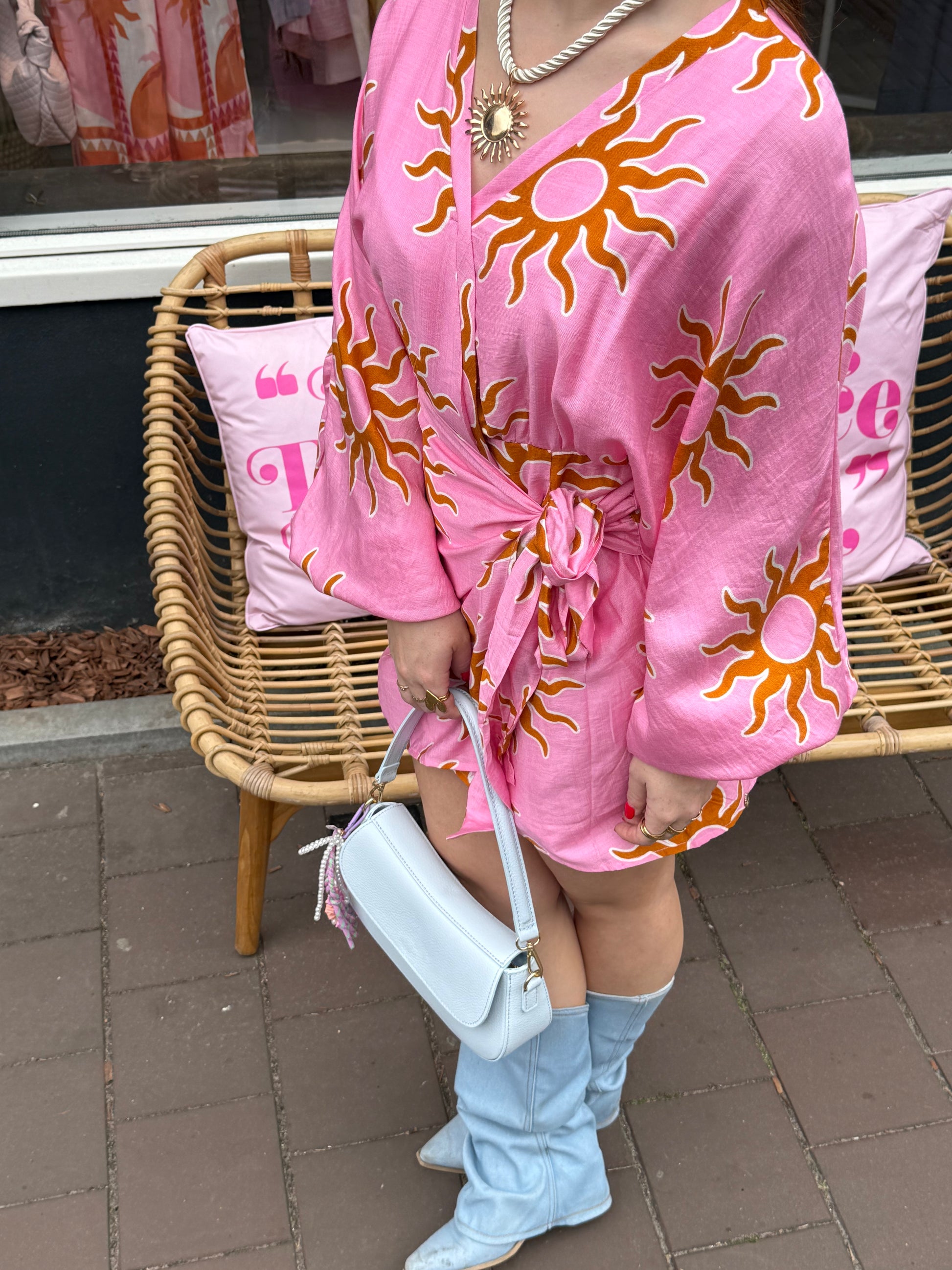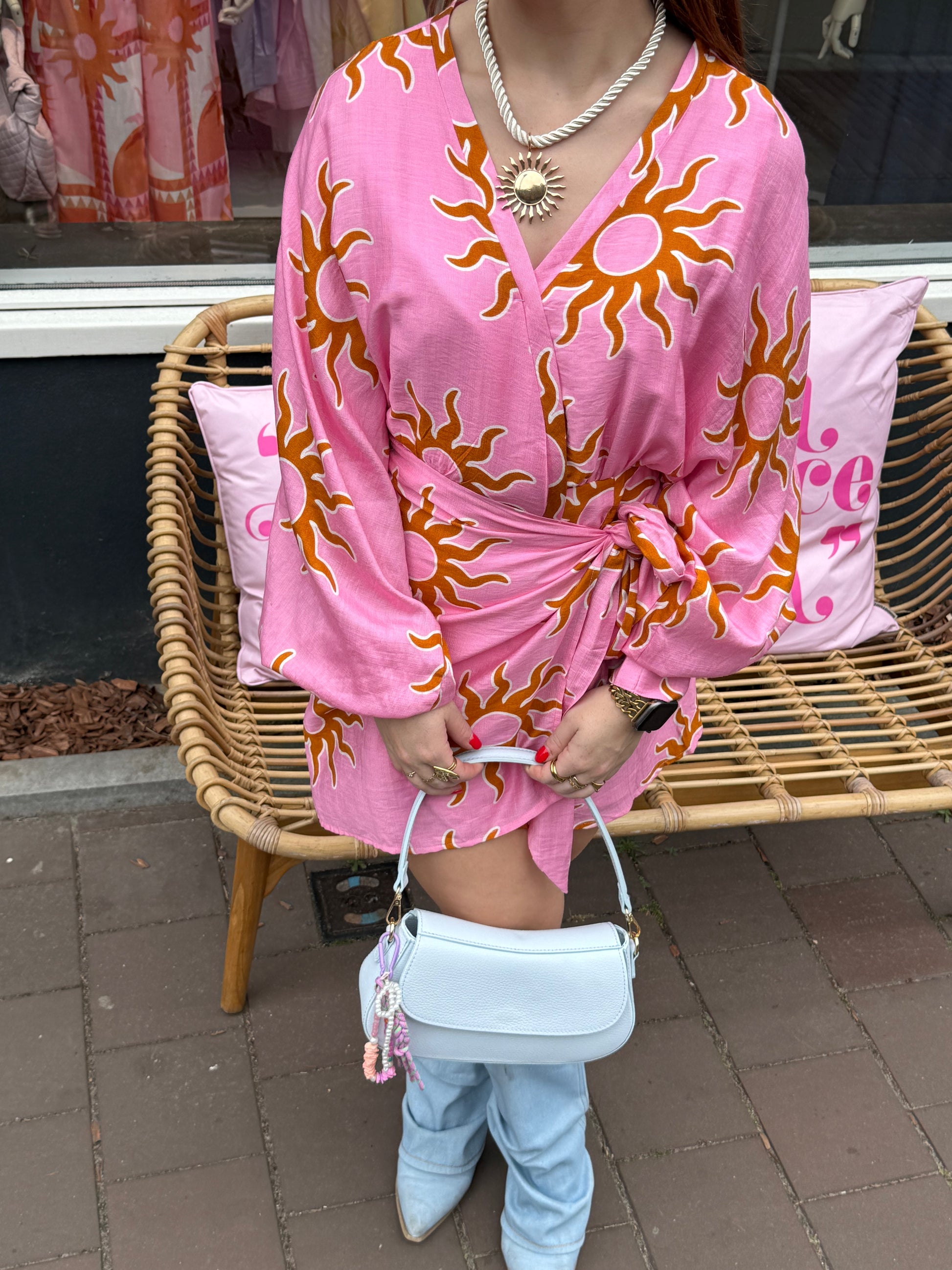 Dit schattige overslagjurkje is een echte eyecatcher! De zachte roze kleur en het zonnetjesprintje geven een speelse, zonnige vibe. Met de lange mouwen en de elegante strik in de taille creëer je een flatterende en vrouwelijke look. Perfect voor een dagje uit, een lunchdate of een speciale gelegenheid. Comfortabel, stijlvol en onweerstaanbaar!