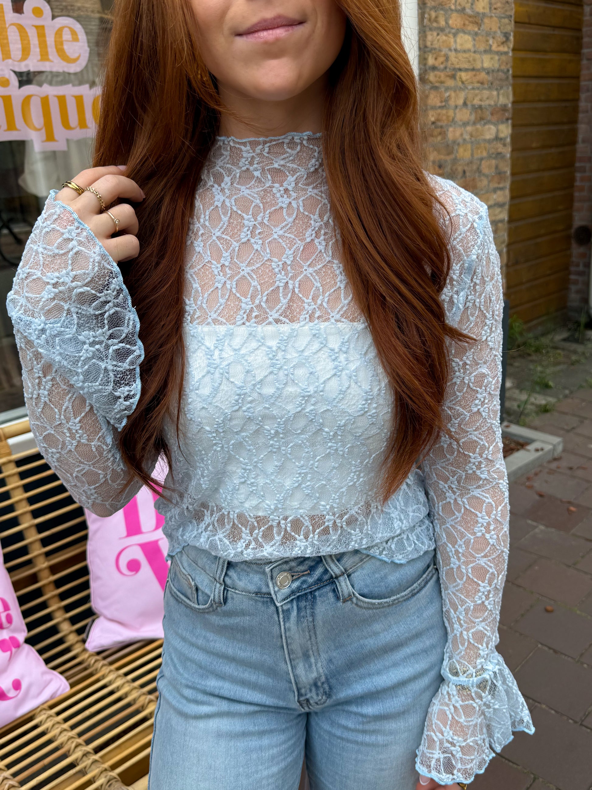 Deze romantische kanten top heeft lange mouwen, een subtiel opstaand kraagje en licht uitlopende mouwtjes voor een vrouwelijke touch. Gemaakt van verfijnd kant dat zowel elegant als veelzijdig is. Draag hem stijlvol onder een gilet, trui of blazer, of laat hem stralen op zichzelf voor een chique, tijdloze look.