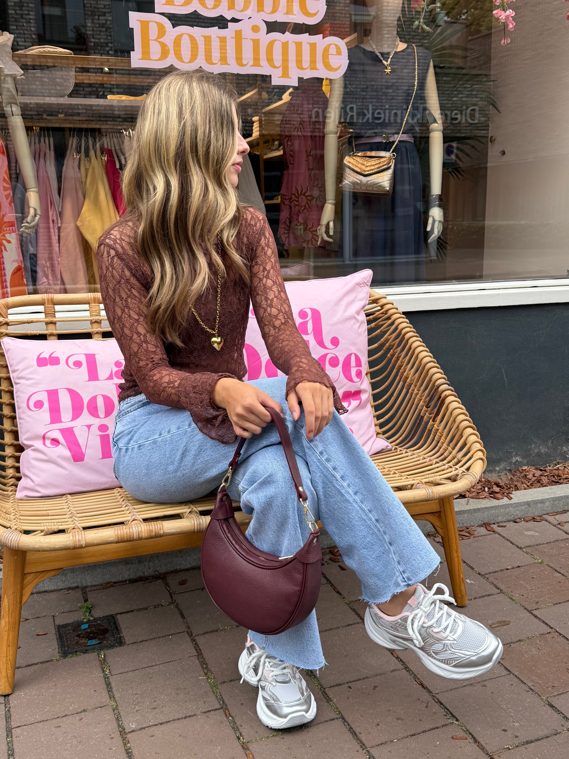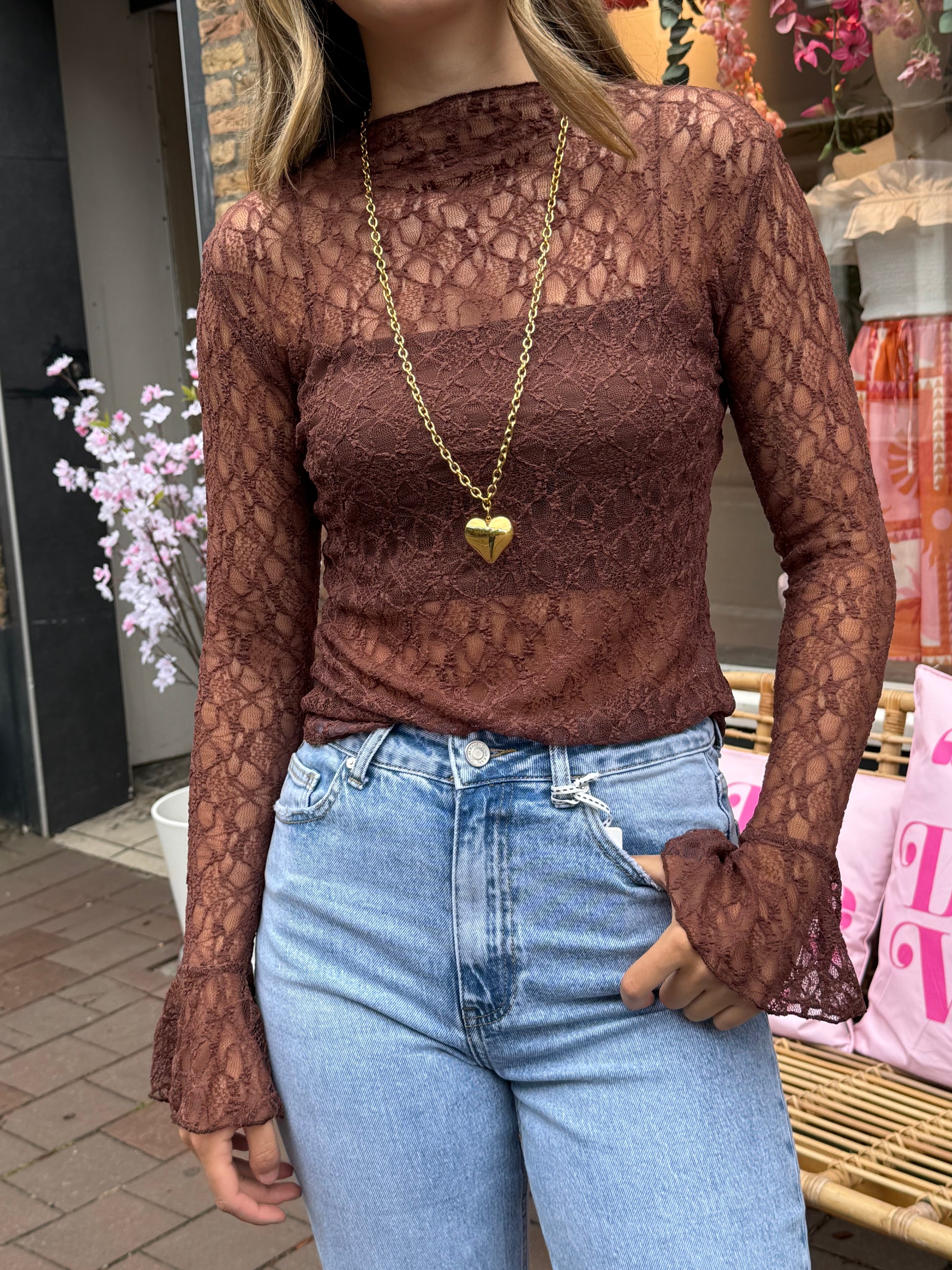 Deze romantische kanten top heeft lange mouwen, een subtiel opstaand kraagje en licht uitlopende mouwtjes voor een vrouwelijke touch. Gemaakt van verfijnd kant dat zowel elegant als veelzijdig is. Draag hem stijlvol onder een gilet, trui of blazer, of laat hem stralen op zichzelf voor een chique, tijdloze look.