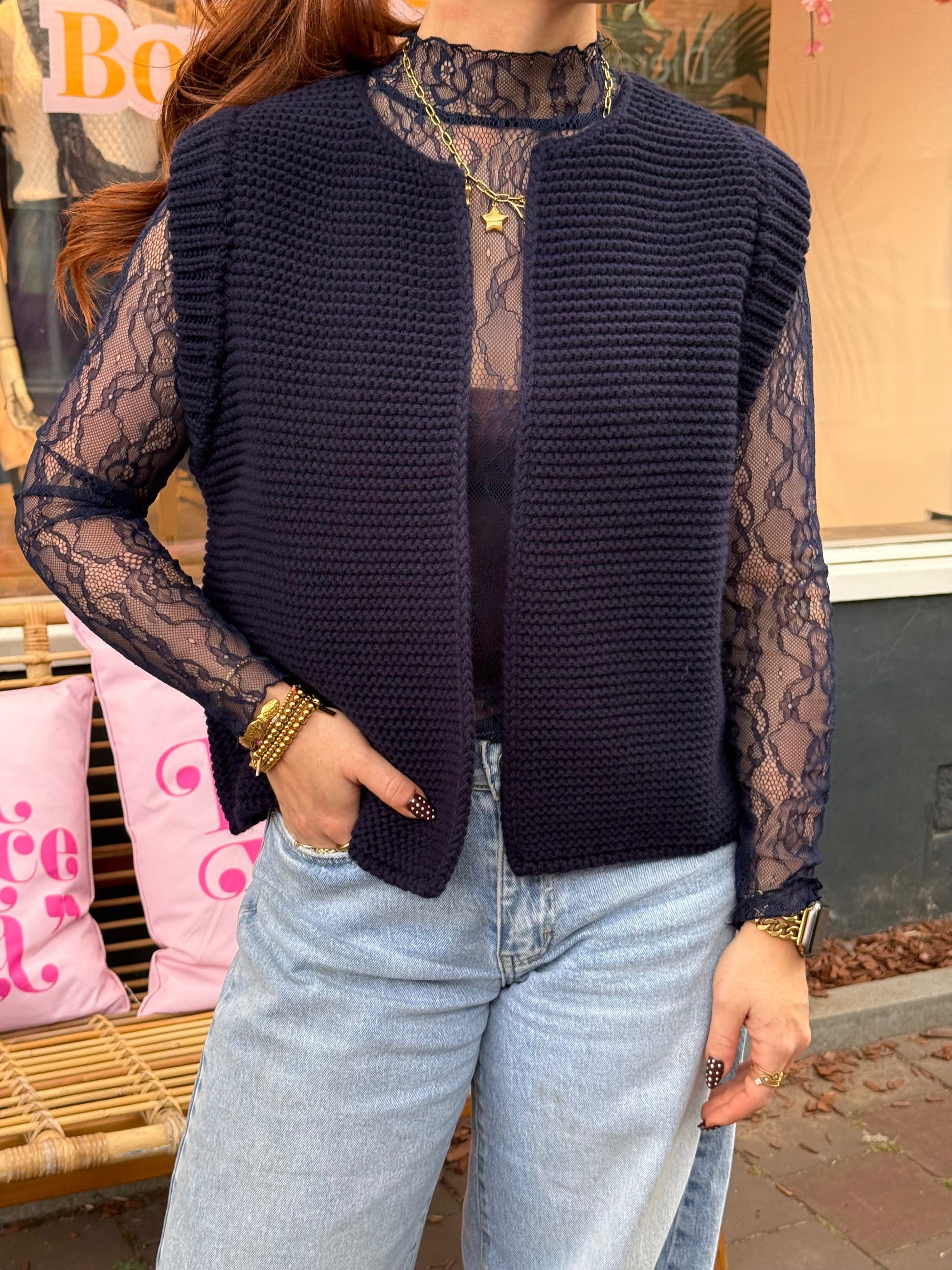 Deze kanten top is een echte eyecatcher dankzij het verfijnde motief en de vrouwelijke uitstraling. De navy kleur maakt hem stijlvol en makkelijk te combineren. Op de foto’s is de top gestyled met een gilet en jeans, een perfecte combinatie voor een elegante maar toch casual look. Draag hem solo voor een classy effect of gelaagd voor een speelse, modieuze twist.