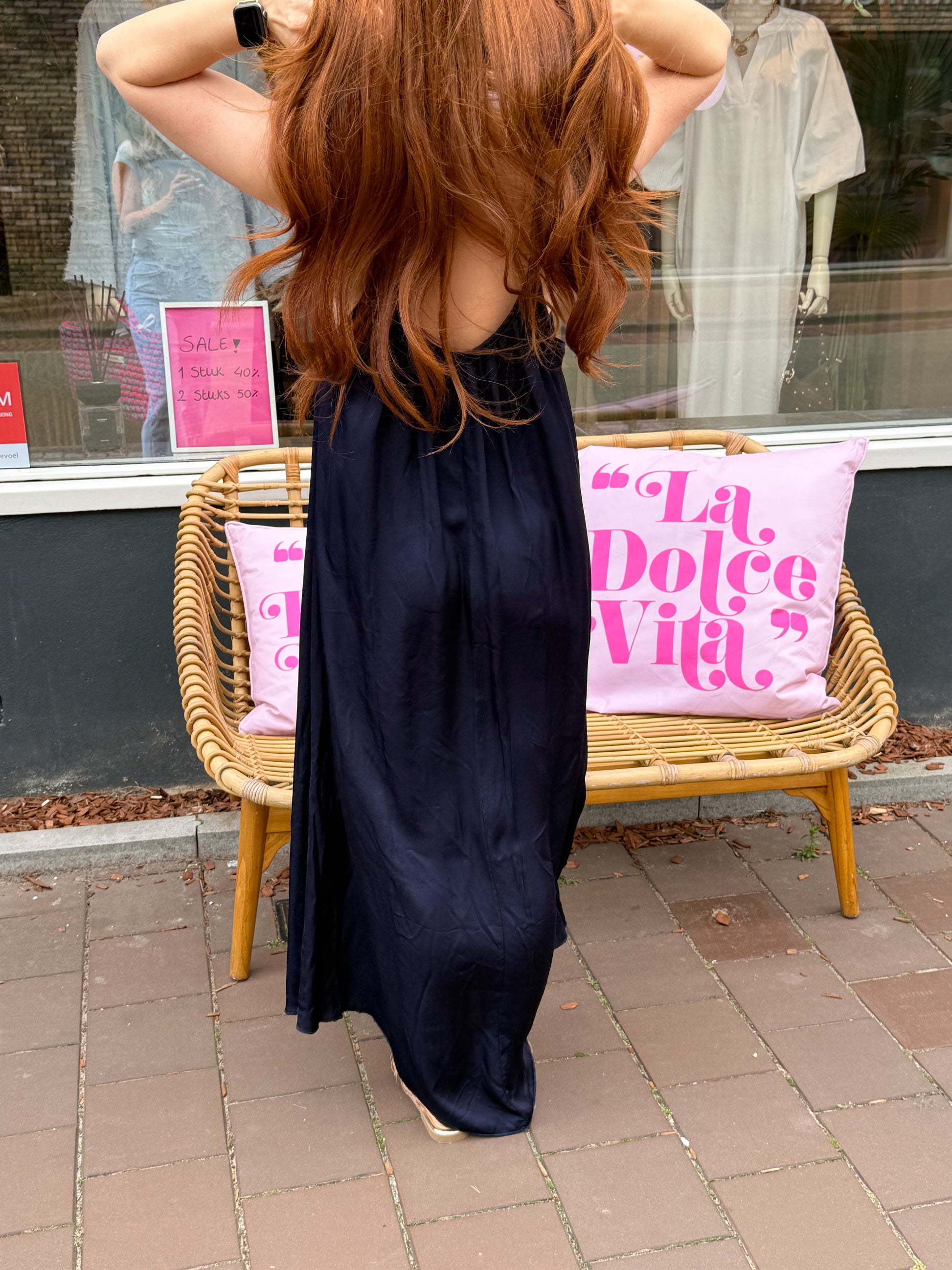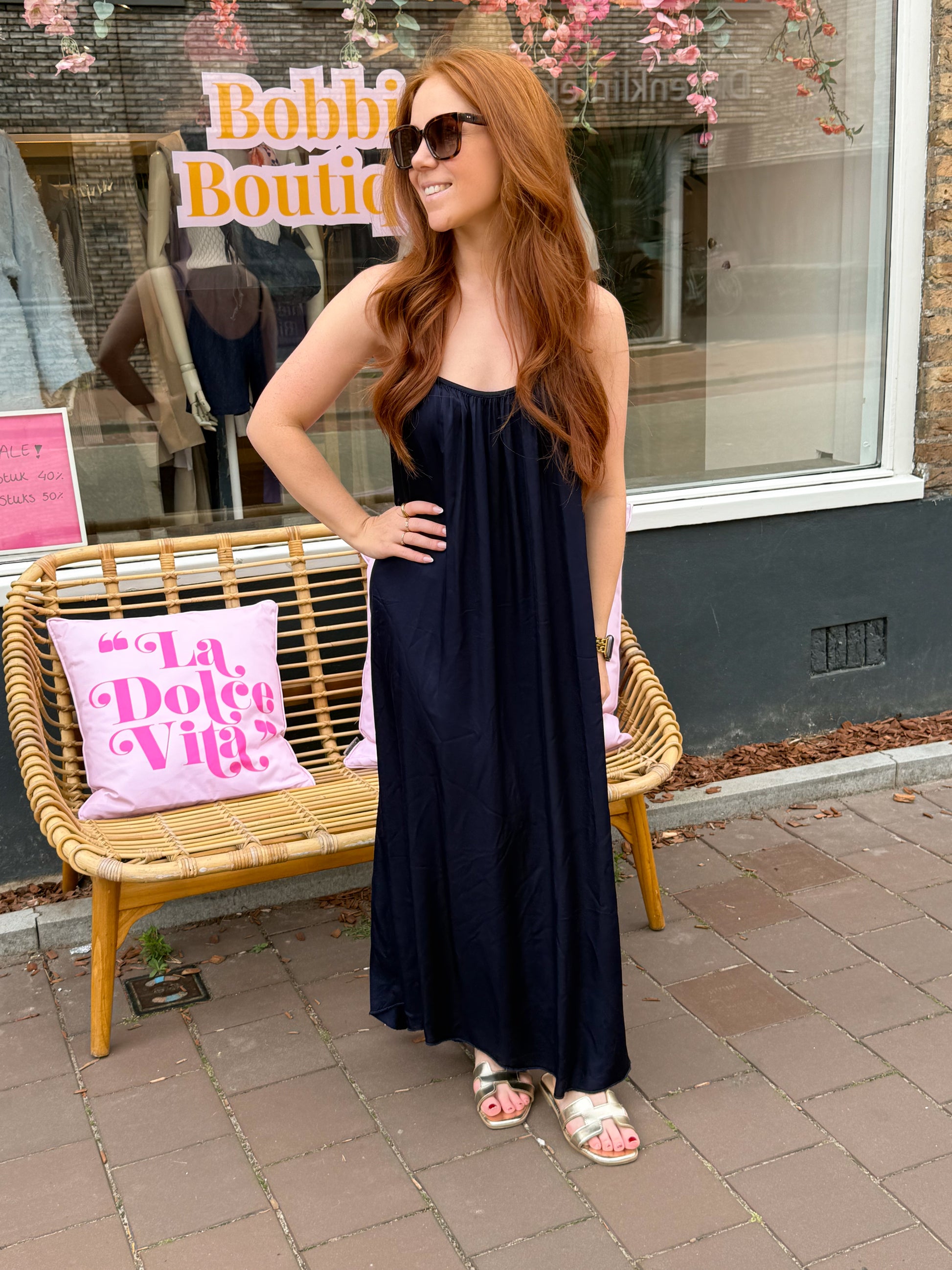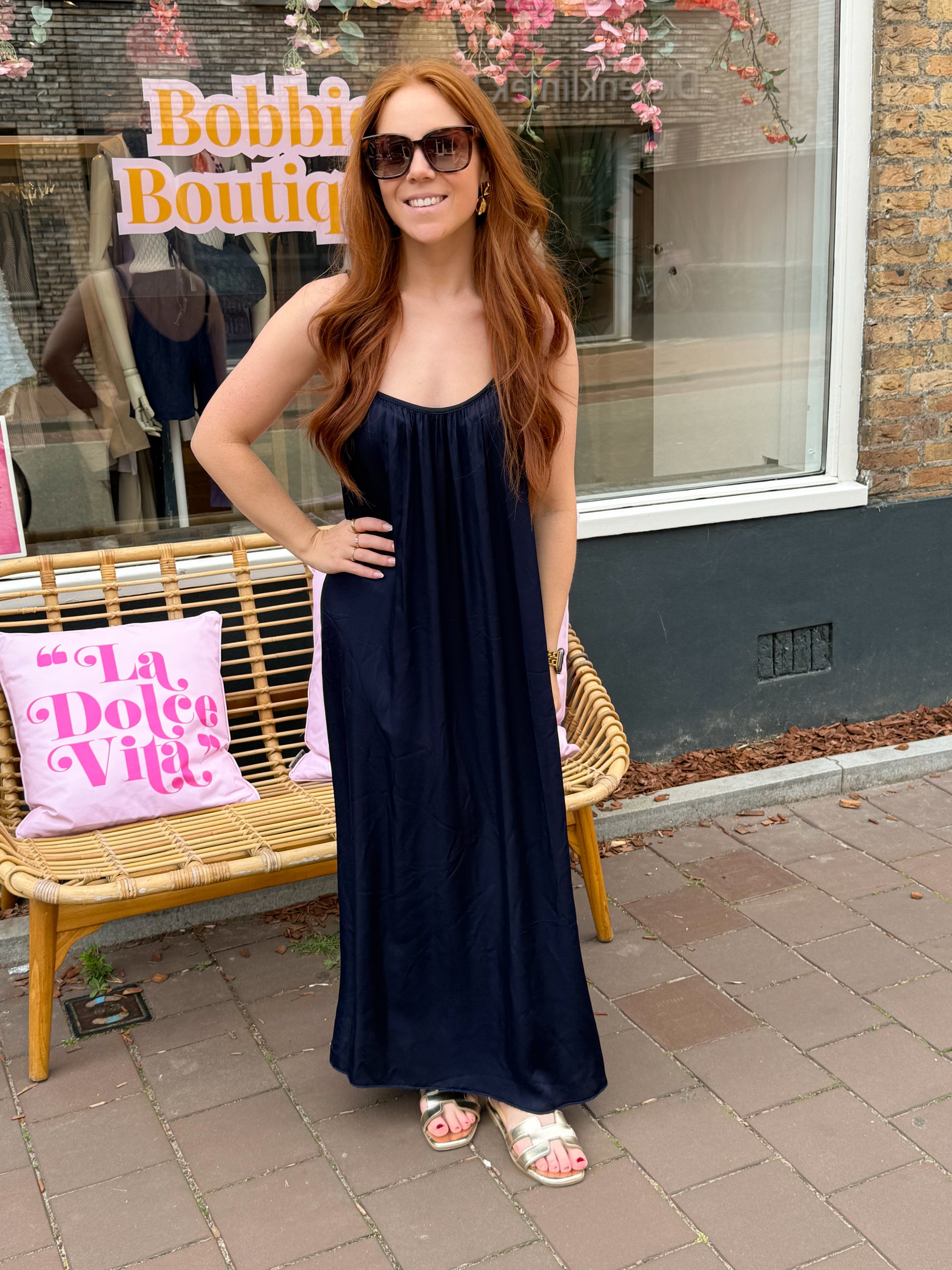 Deze donkerblauwe maxi-jurk is een perfecte mix van elegantie en comfort. De soepele, luchtige stof valt prachtig langs je silhouet, terwijl de fijne spaghettibandjes zorgen voor een vrouwelijke en zomerse uitstraling. Ideaal voor een avondje uit, een feestje of een zonnige dag. Tijdloos, stijlvol en moeiteloos chic!