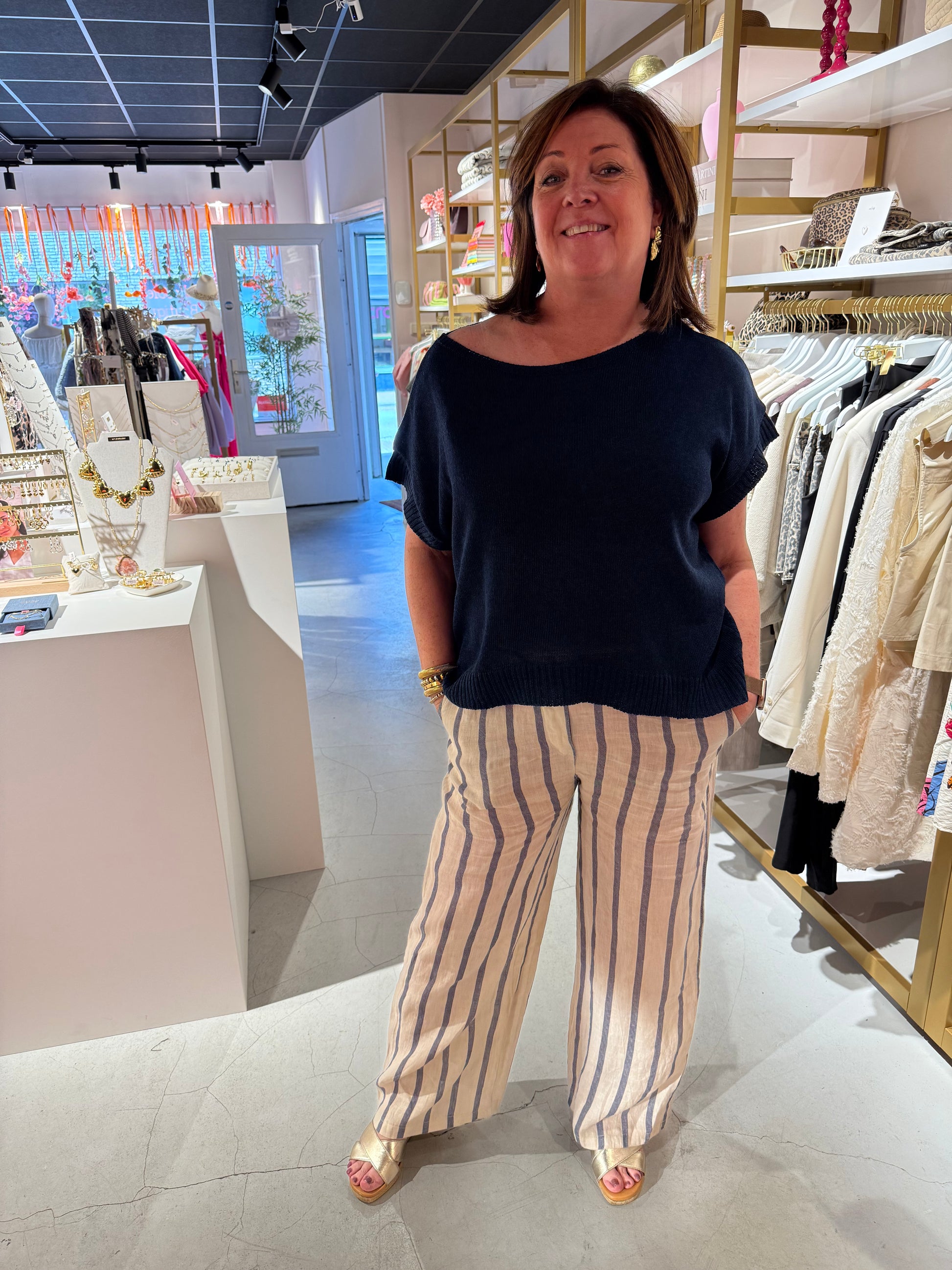 Deze witte linnen broek met dikke blauwe strepen is summer vibes all the way. De luchtige stof en wijde fit maken ‘m perfect voor warme dagen, terwijl de elastieke tailleband zorgt voor ultiem comfort. Combineer met een simpele top en je bent good to go, van strand tot stad.