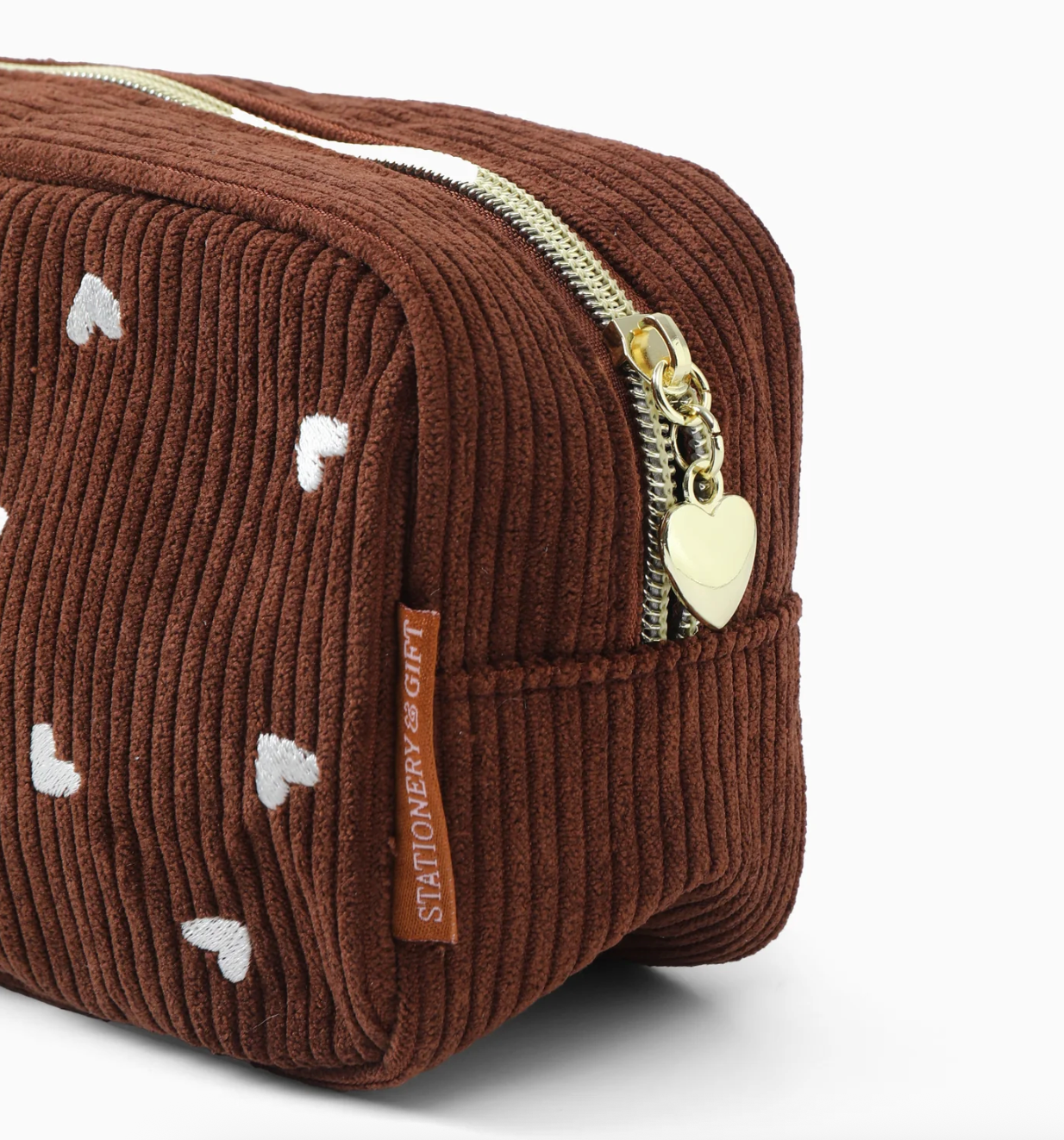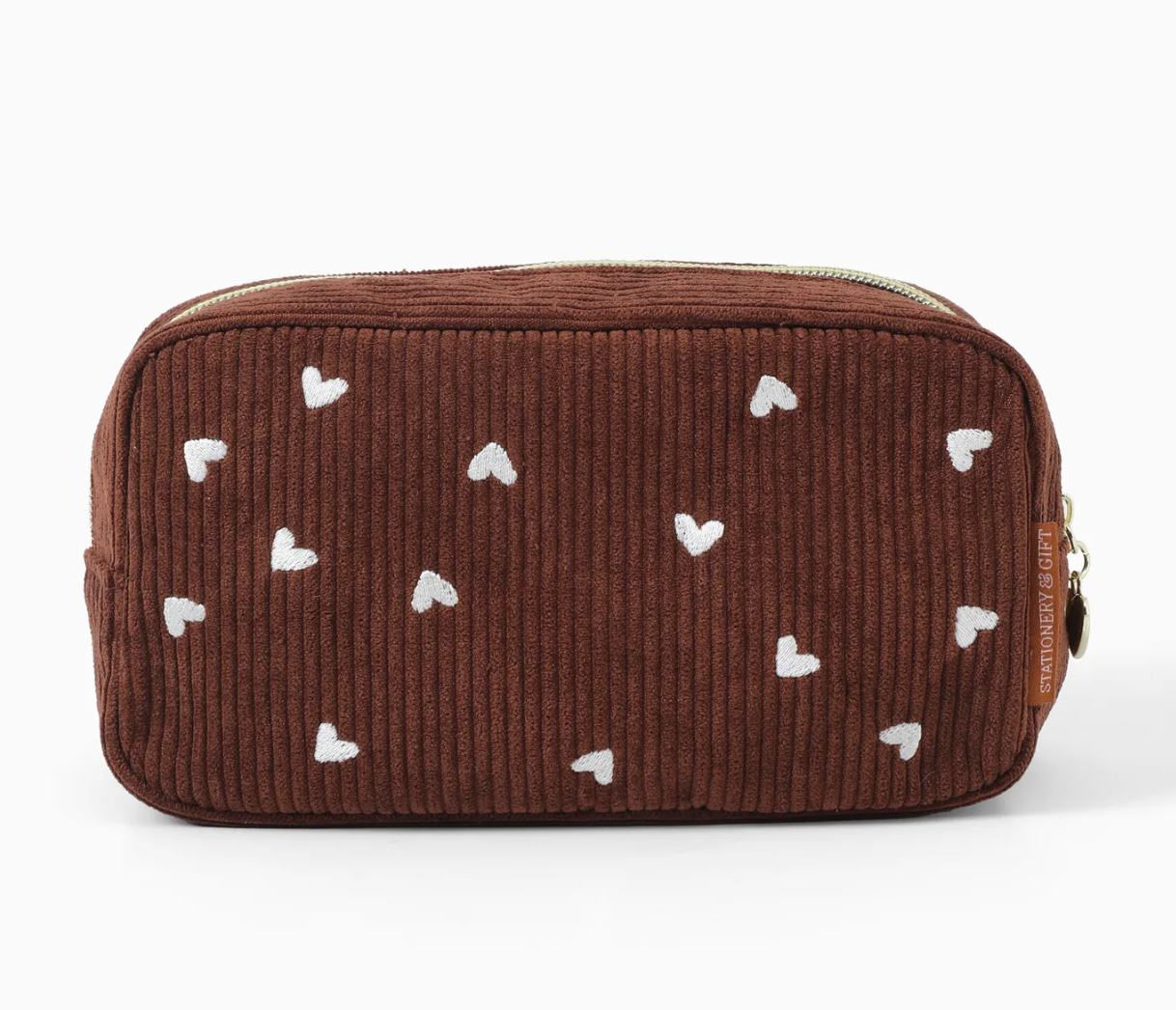 Hoe cute om deze in dezelfde stijl als je laptop hoes, iPad hoes en brillenhoesje door te voeren. Geborduurd hartjes in creme aan de voorkant en de achterkant met aan de rits een gouden hartje. Wij vinden dit zo ontzettend schattig!