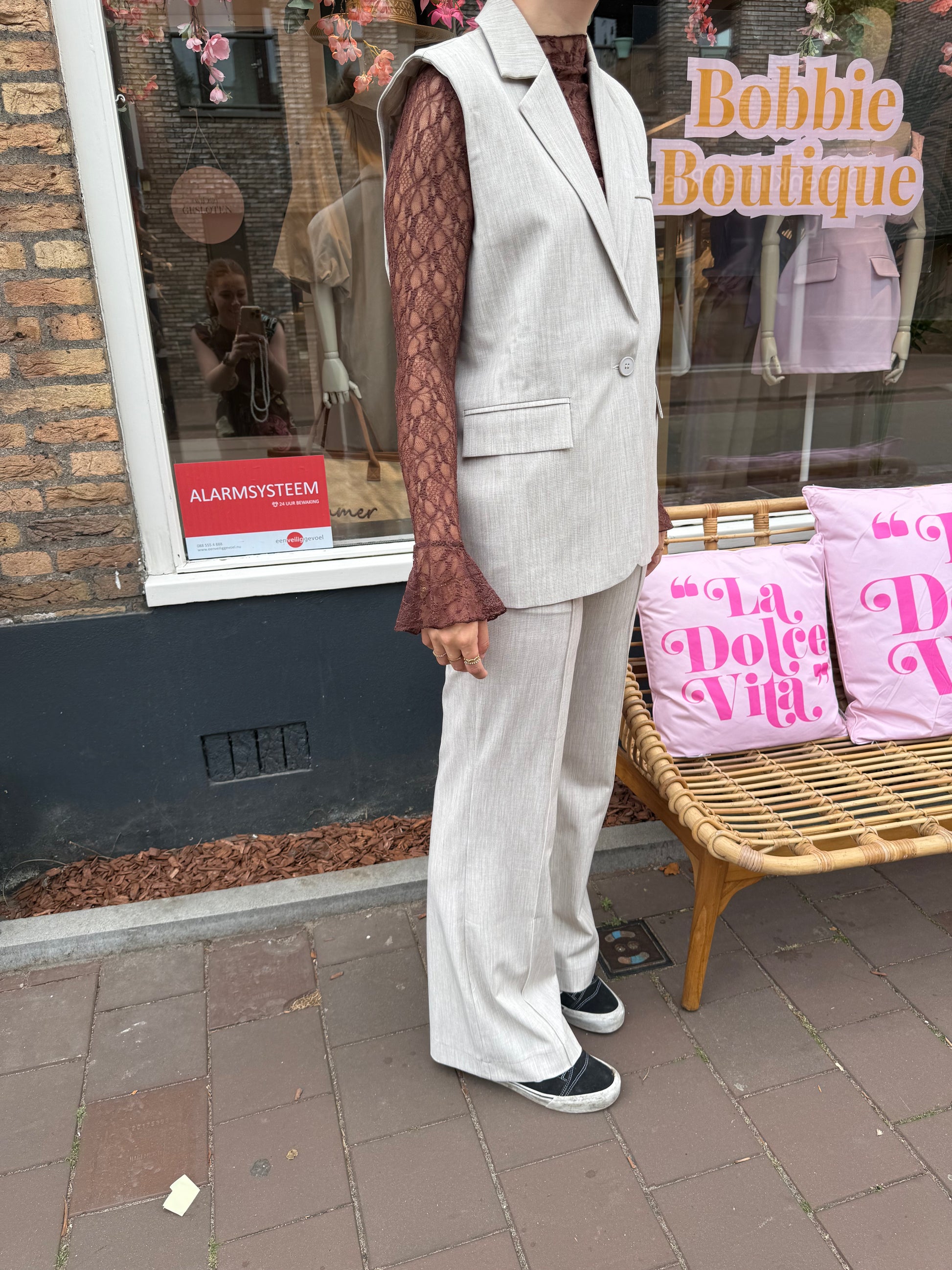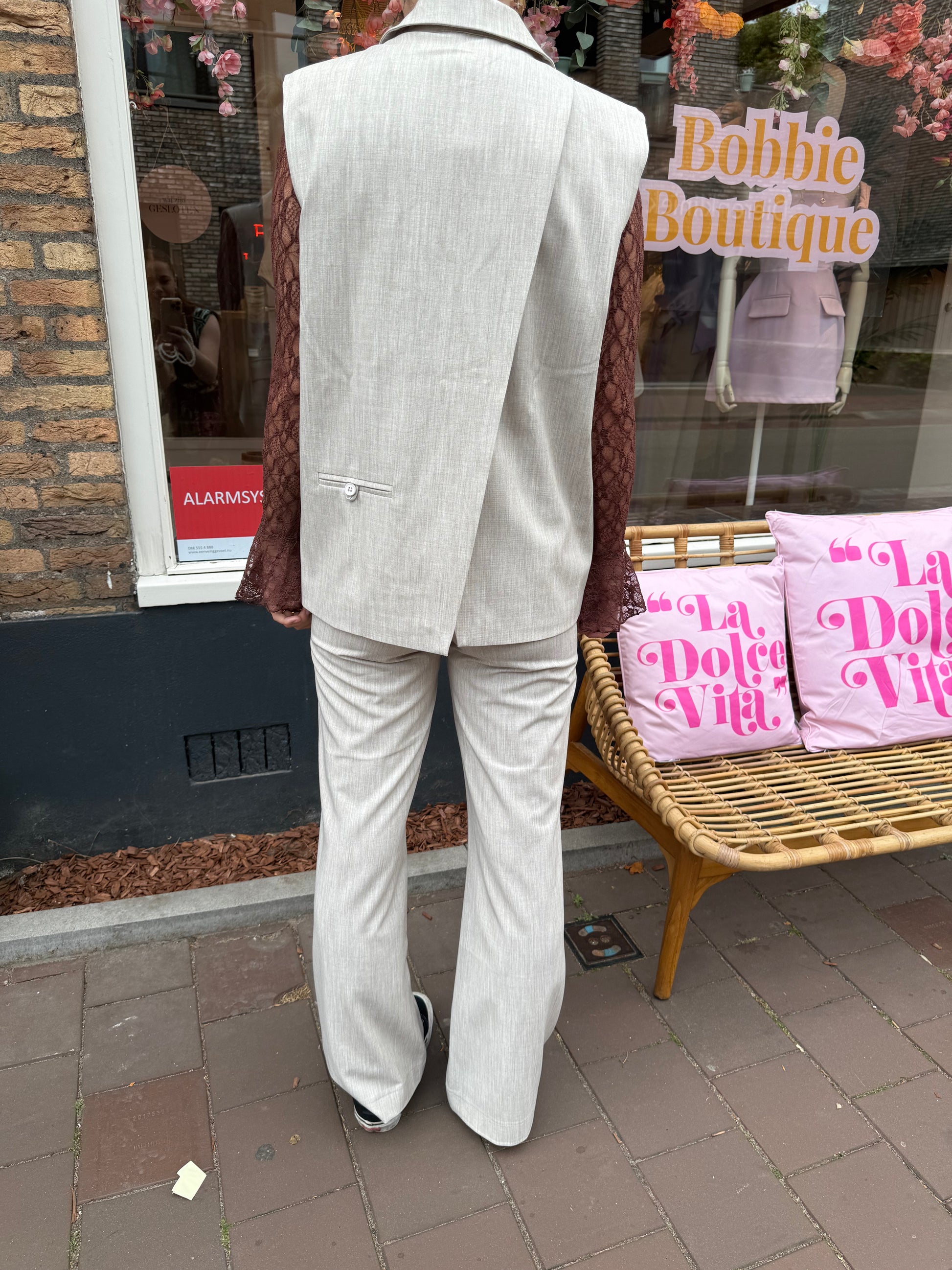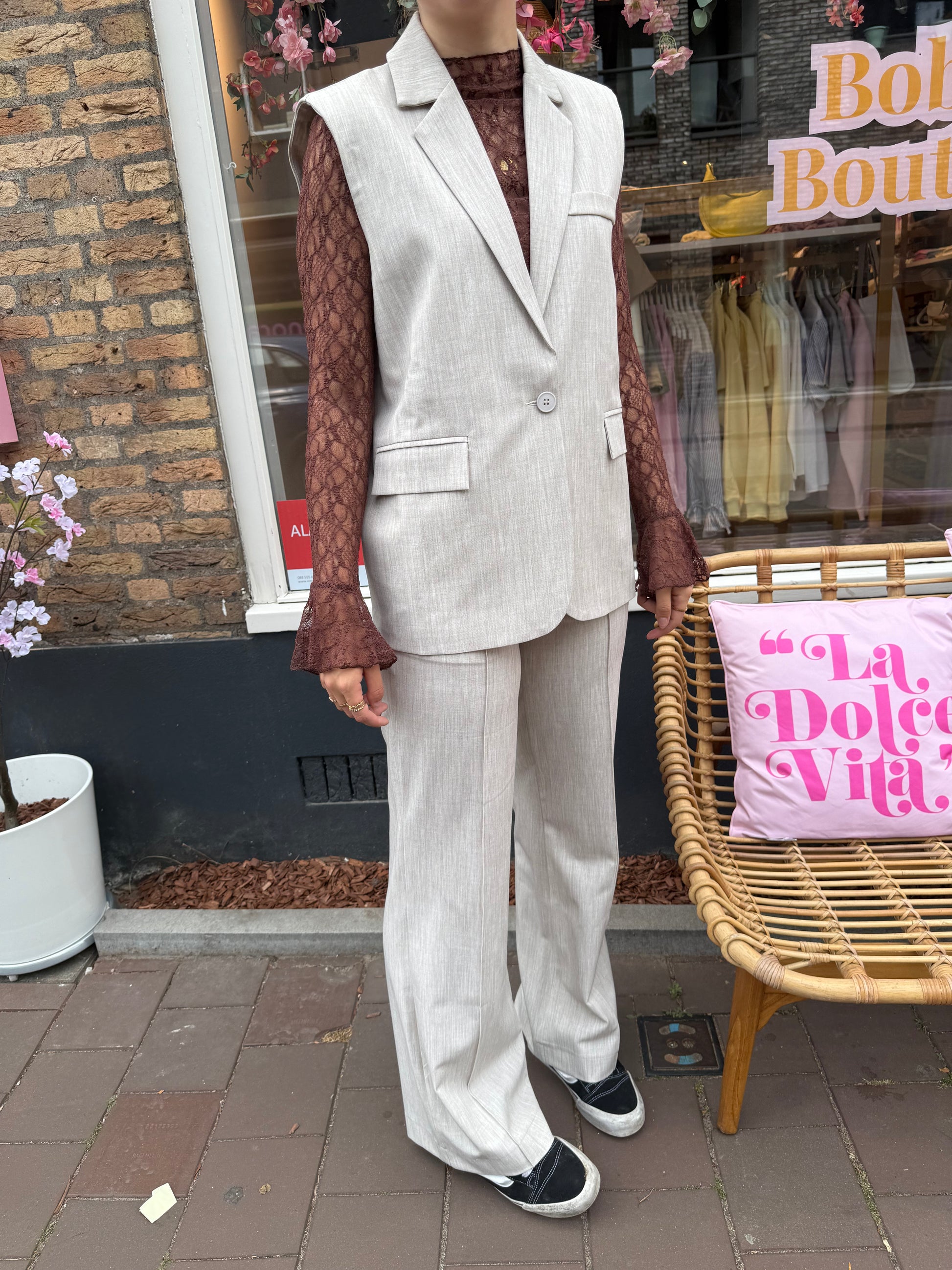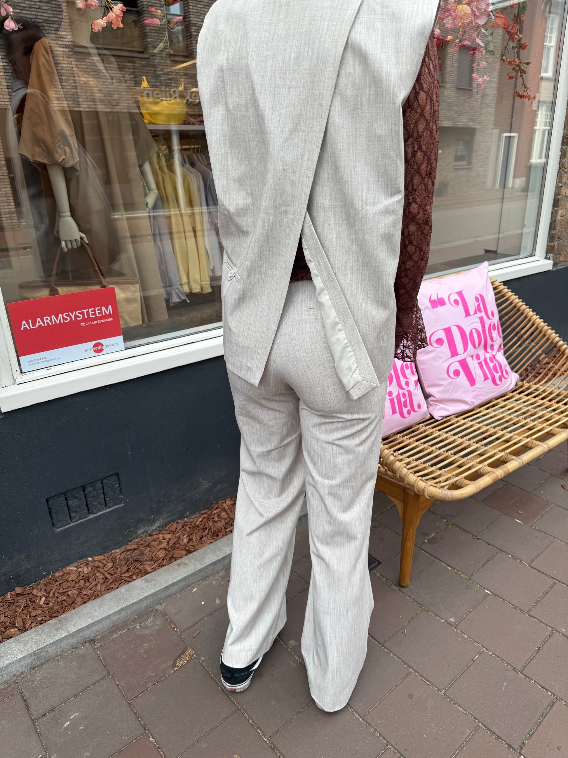Deze beige pantalon is jouw nieuwe go-to voor een classy maar comfy look. De rechte pijpen, lichte stretch en mooie fit zorgen voor een effortless silhouette. Combineer met het bijpassende gilet met split achter voor een power suit vibe waar je u tegen zegt.