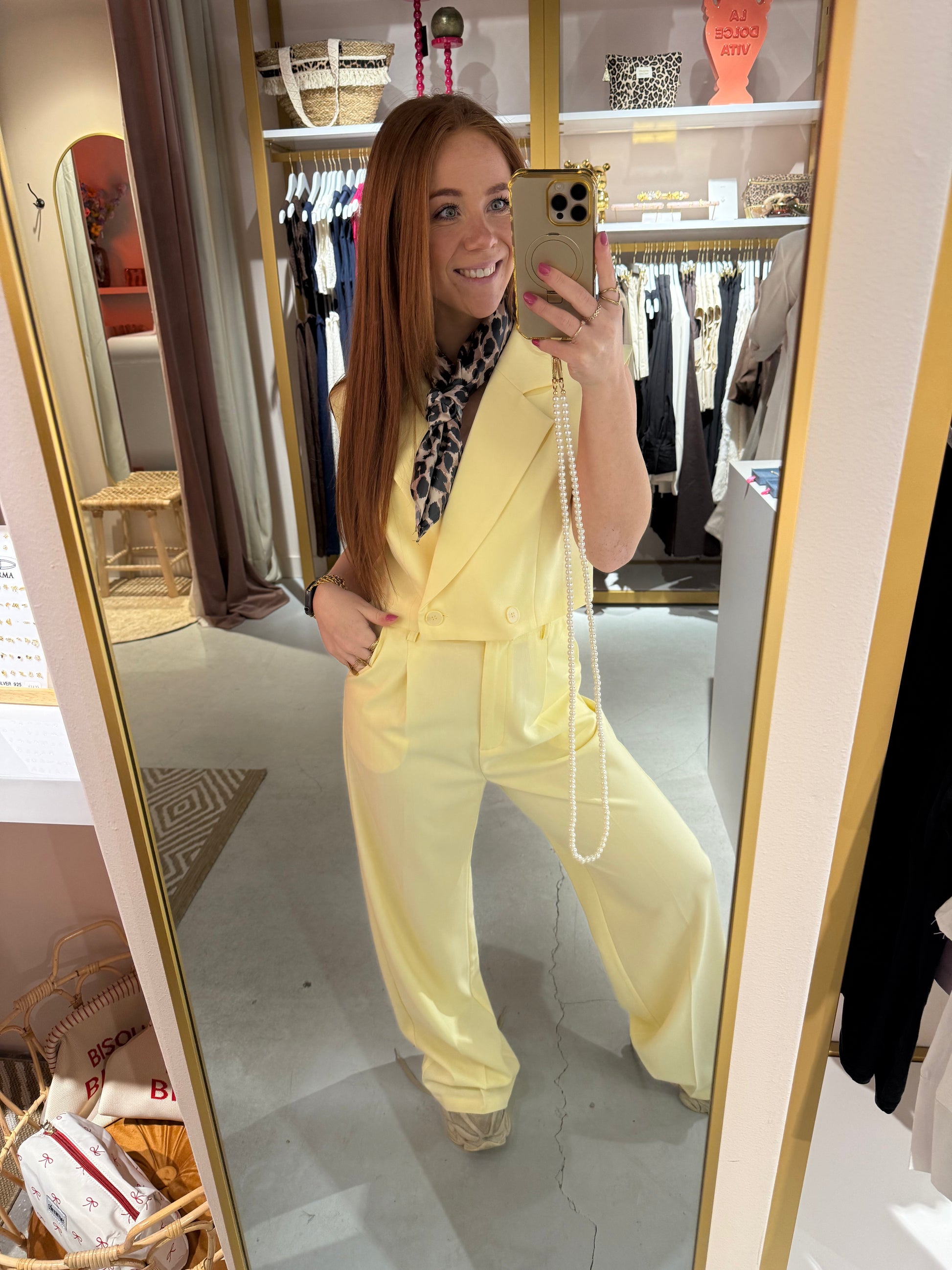 Deze butteryellow pantalon is stijlvol, krachtig en perfect voor wie een statement wil maken. De licht gele kleur geeft ‘m een zomerse uitstraling, terwijl de rechte pijpen en hoge taille zorgen voor een elegante, flatterende pasvorm. De stevige stof met lichte stretch maakt dat hij heerlijk zit én mooi in model blijft, of je ‘m nu casual draagt met sneakers of chic met hakken. Combineer ‘m met het bijpassende gilet voor een complete, on-trend set die direct in het oog springt.
