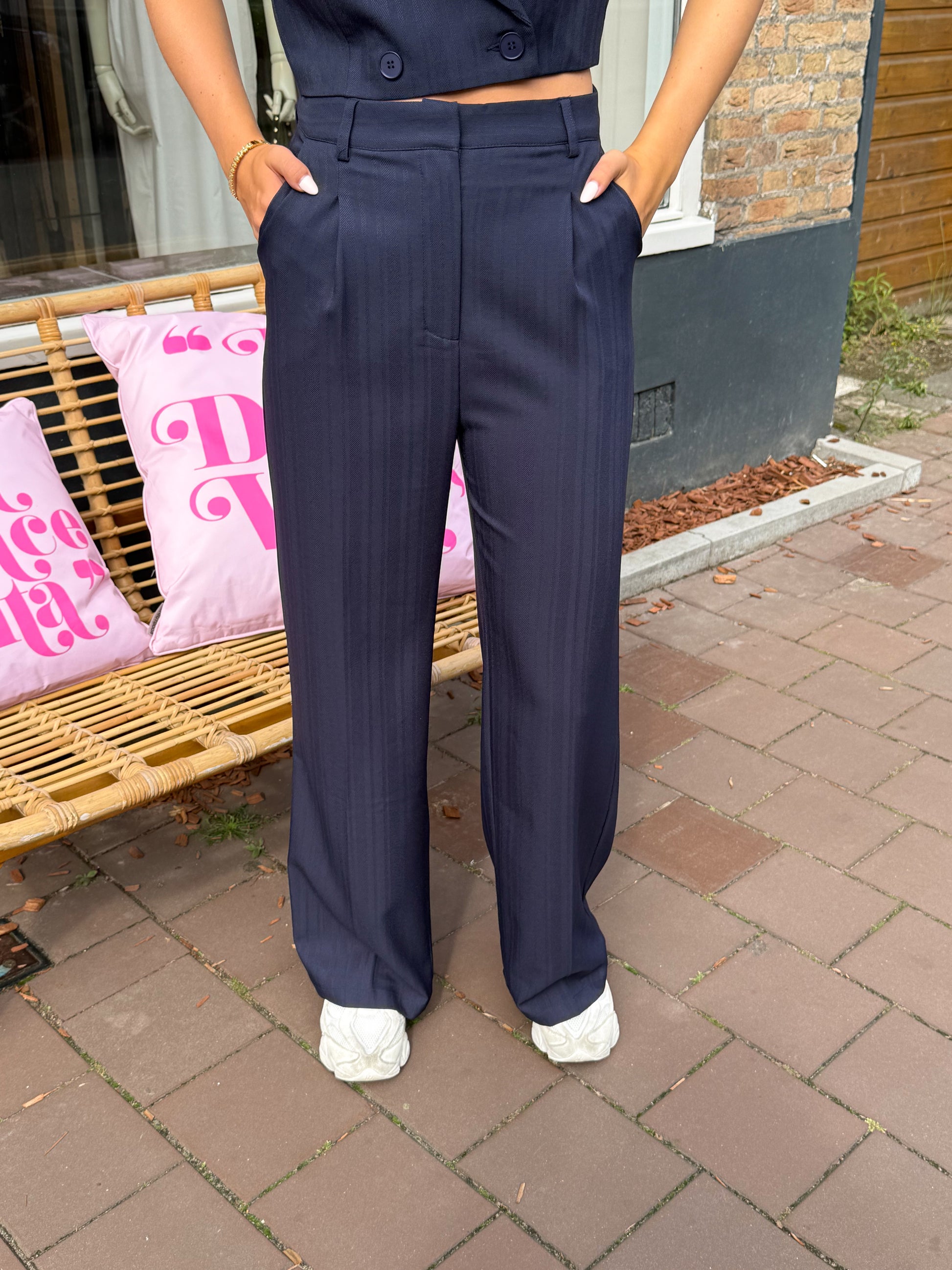 Deze navy pantalon is stijlvol, krachtig en perfect voor wie een statement wil maken. De diepe kleur geeft ‘m een luxe uitstraling, terwijl de rechte pijpen en hoge taille zorgen voor een elegante, flatterende pasvorm. De stevige stof met lichte stretch maakt dat hij heerlijk zit én mooi in model blijft, of je ‘m nu casual draagt met sneakers of chic met hakken. Combineer ‘m met het bijpassende gilet voor een complete, on-trend set die direct in het oog springt..