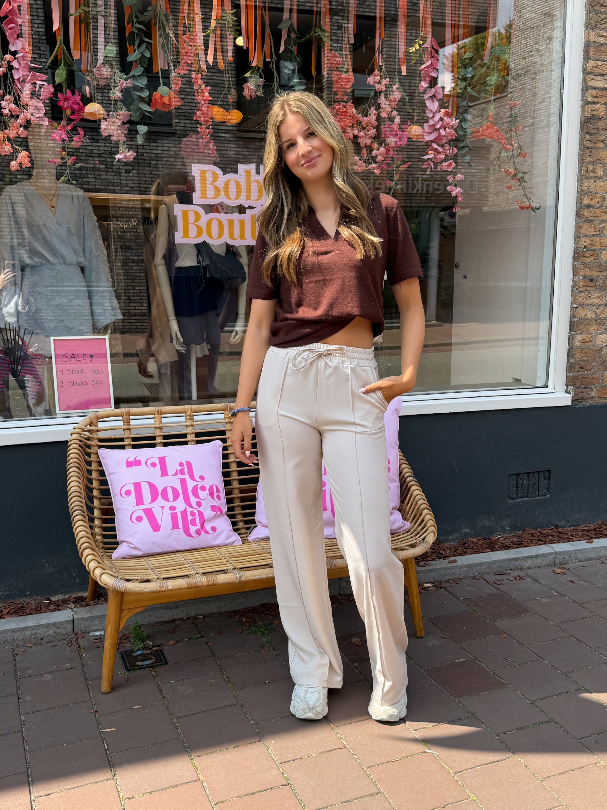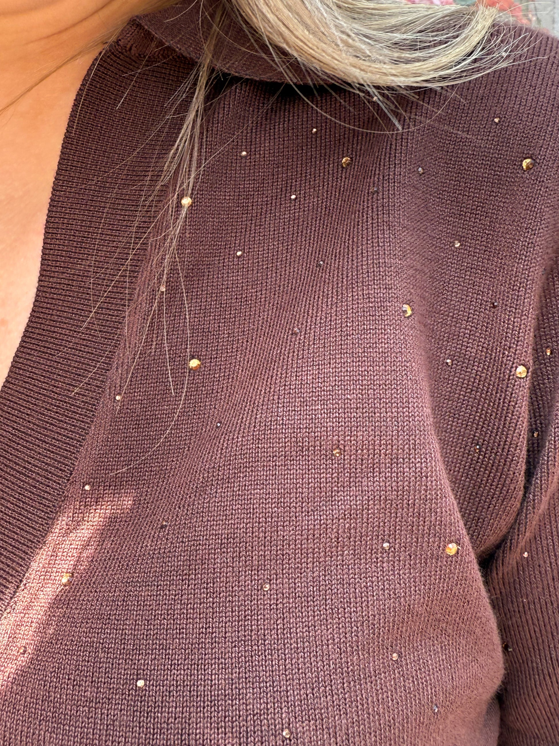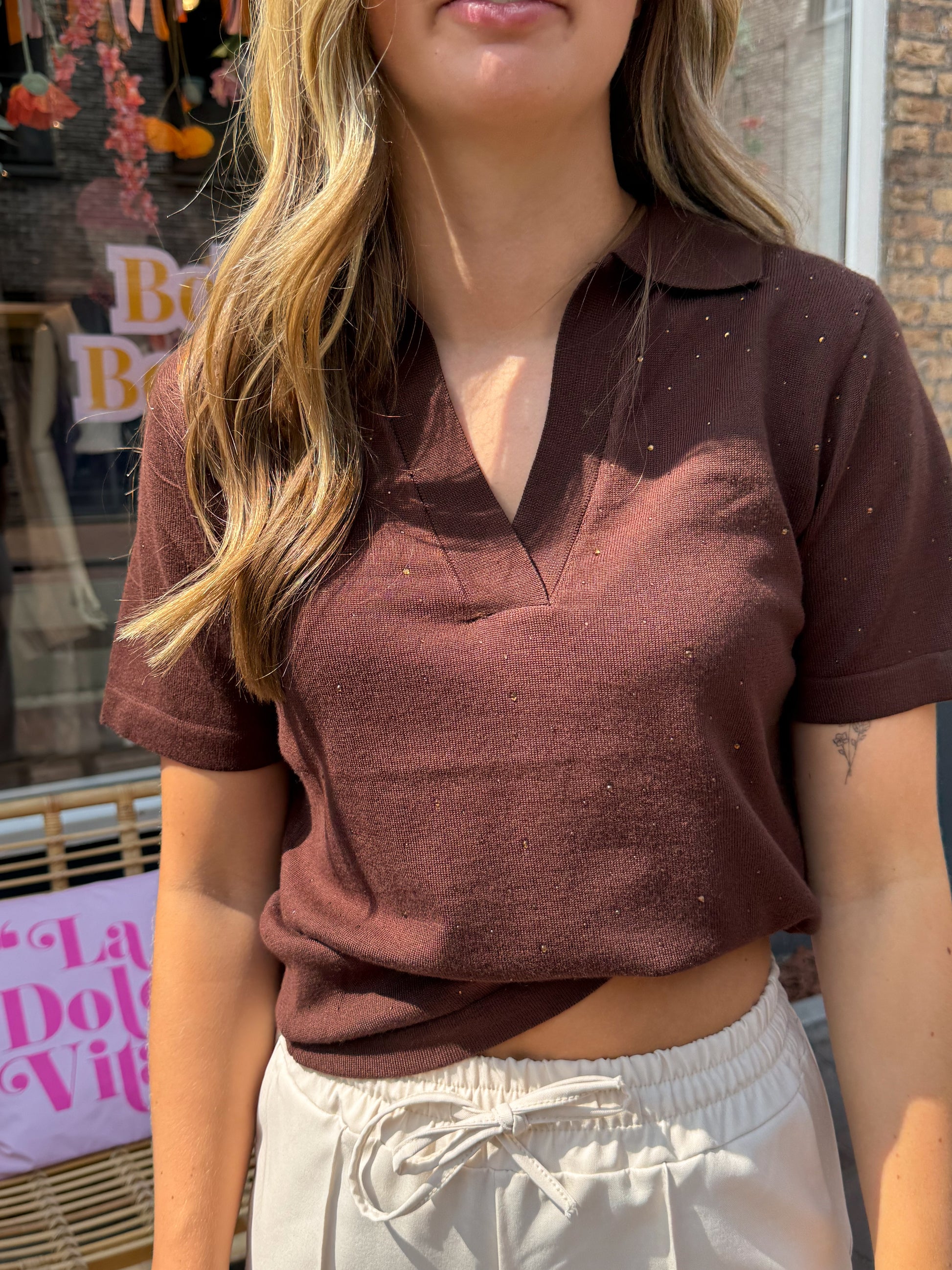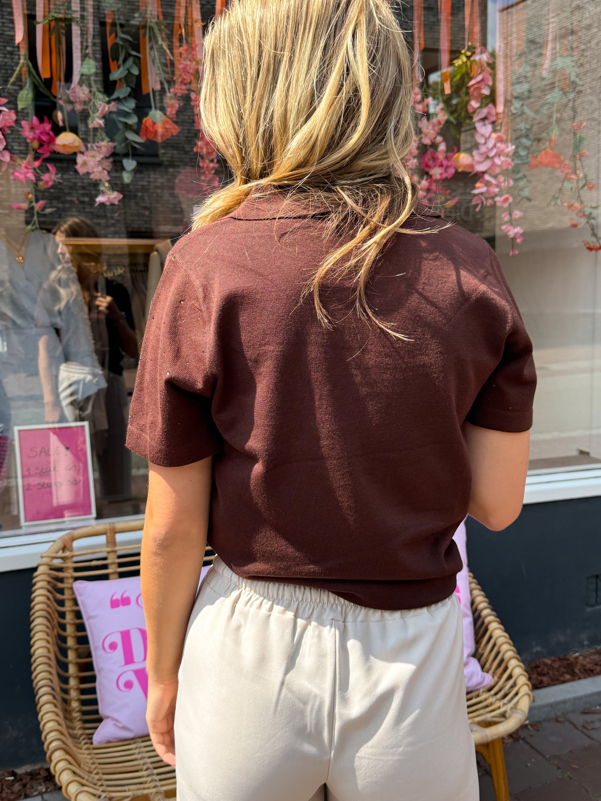 Dit polo T-shirt in een warme choco kleur combineert een klassieke pasvorm met een subtiele glamour dankzij de strass steentjes op de kraag en knoopsluiting. Gemaakt van zacht, comfortabel materiaal, ideaal voor een stijlvolle en chique casual look.
