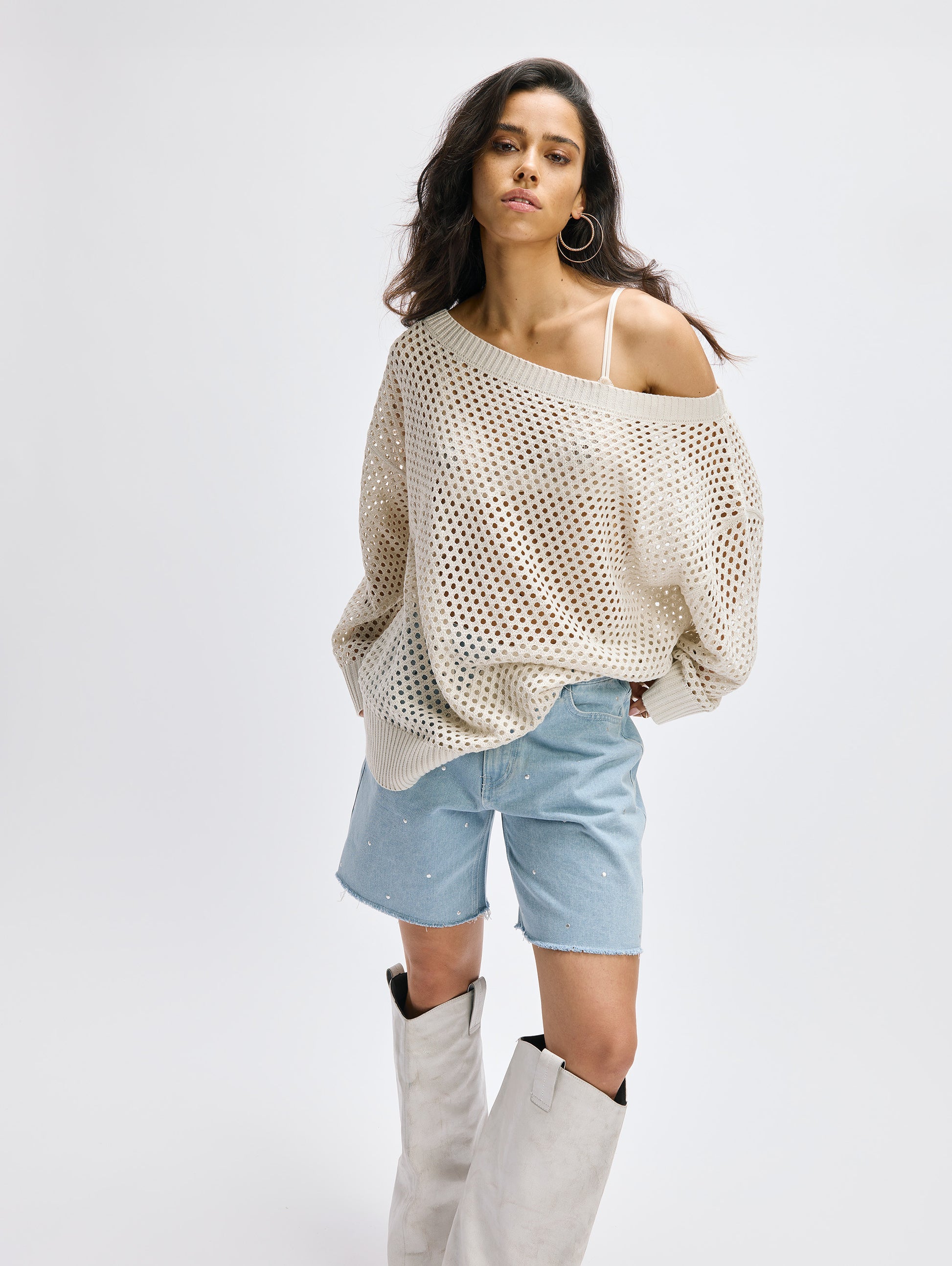 Deze opengebreide trui is een echte musthave voor elk seizoen. Dankzij de brede halslijn kun je hem op meerdere manieren dragen – nonchalant off shoulder of juist klassiek over beide schouders. De subtiele lurex draad door het hele design geeft een vleugje sparkle, waardoor de trui zowel casual als chic te stylen is. Perfect met een jeans voor een relaxte look, of met een rok en laarsjes voor een trendy outfit.