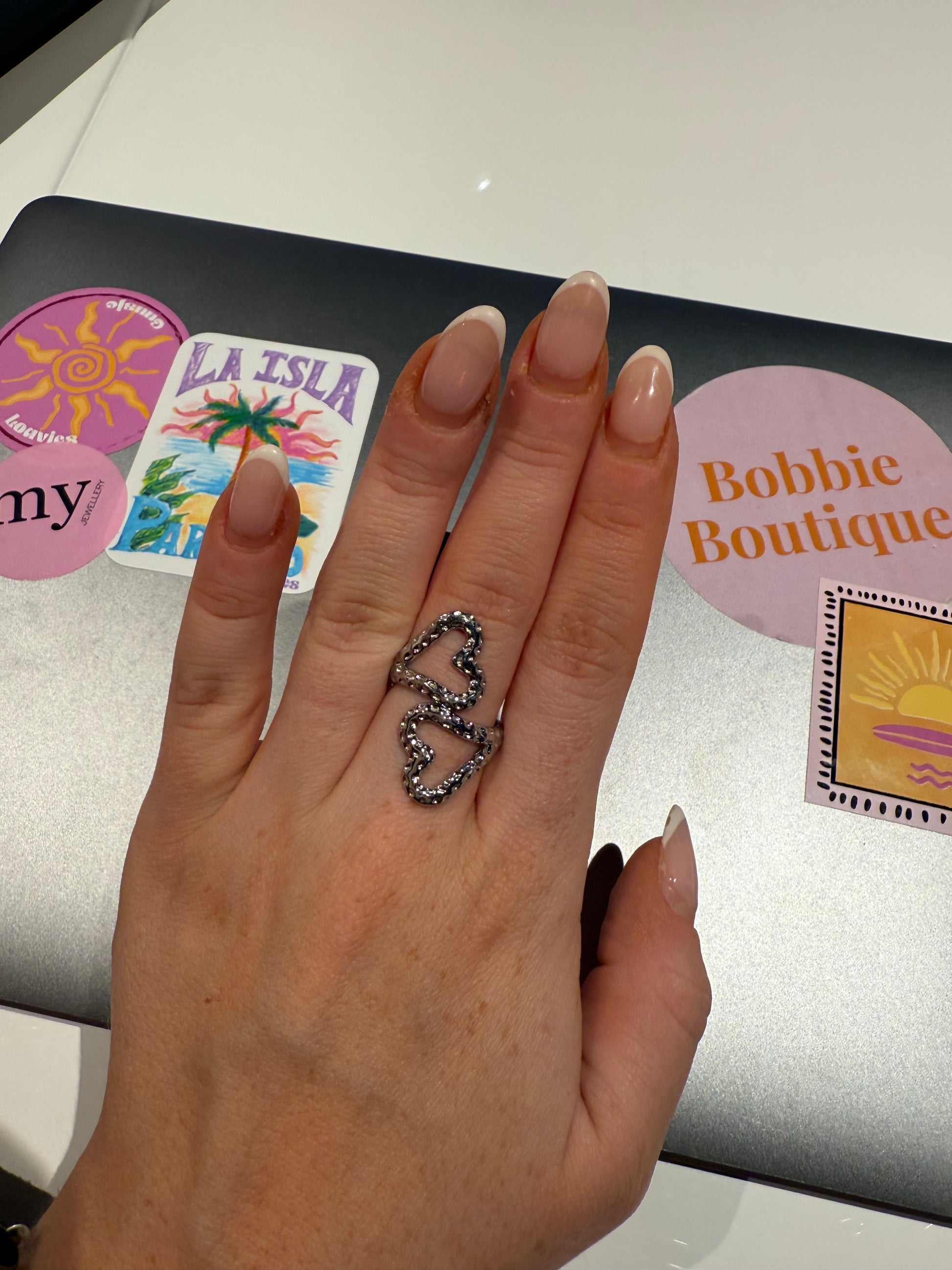 Laat je liefdevolle kant zien met deze verstelbare ring met twee open hartjes, elk aan een andere kant van je vinger. Het minimalistische en elegante ontwerp maakt deze ring perfect voor dagelijks gebruik, terwijl het subtiele hartjesdetail een romantische touch toevoegt. Verstelbaar zodat hij altijd perfect past, solo te dragen of te combineren met andere ringen voor een trendy look.