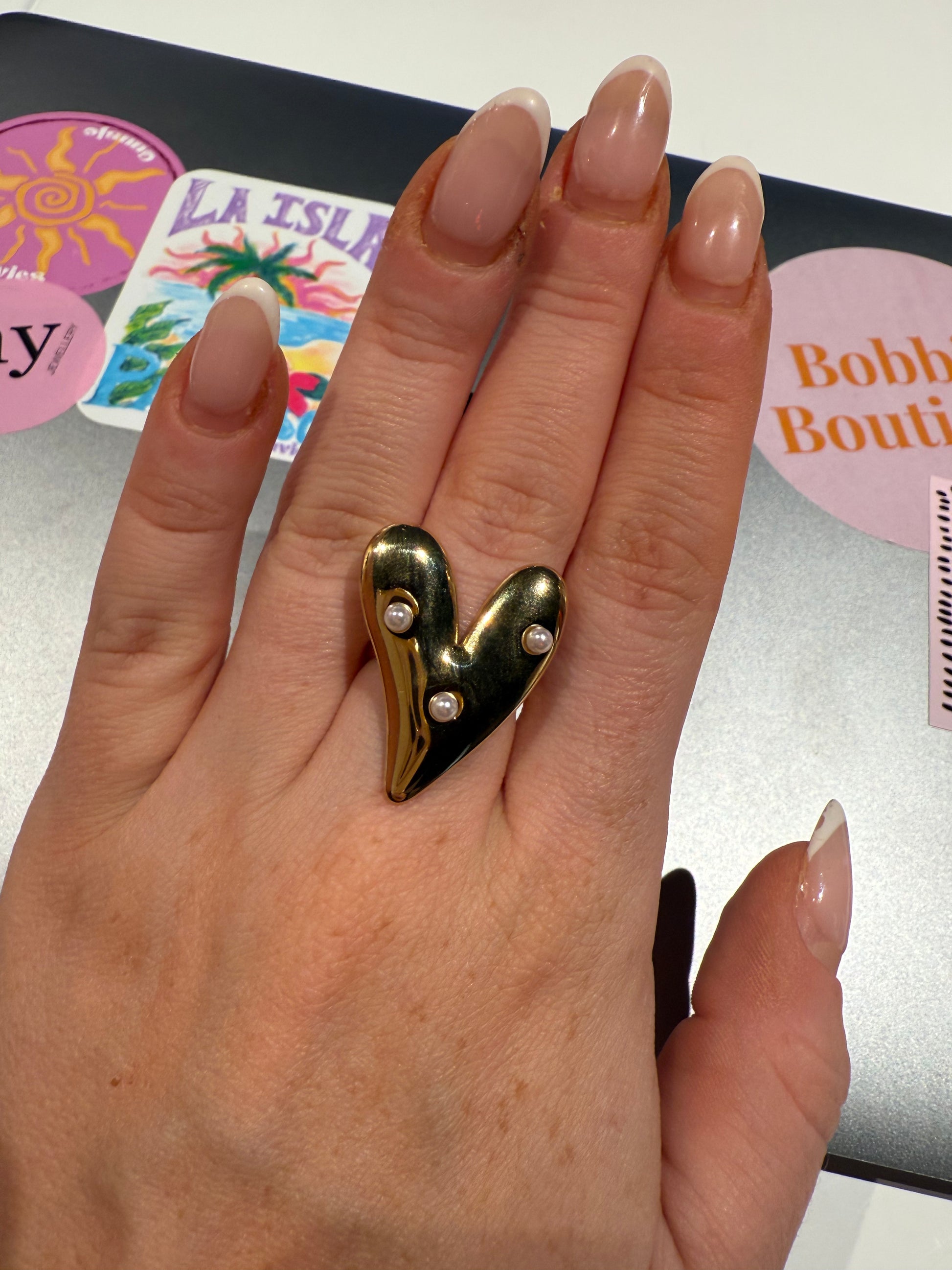 Maak een elegant statement met deze gouden ring, voorzien van een groot hart en subtiele pareldetails. Het speelse hart gecombineerd met de verfijnde parels geeft een vrouwelijke en luxe uitstraling. Perfect om solo te dragen als statement. De ring is verstelbaar.