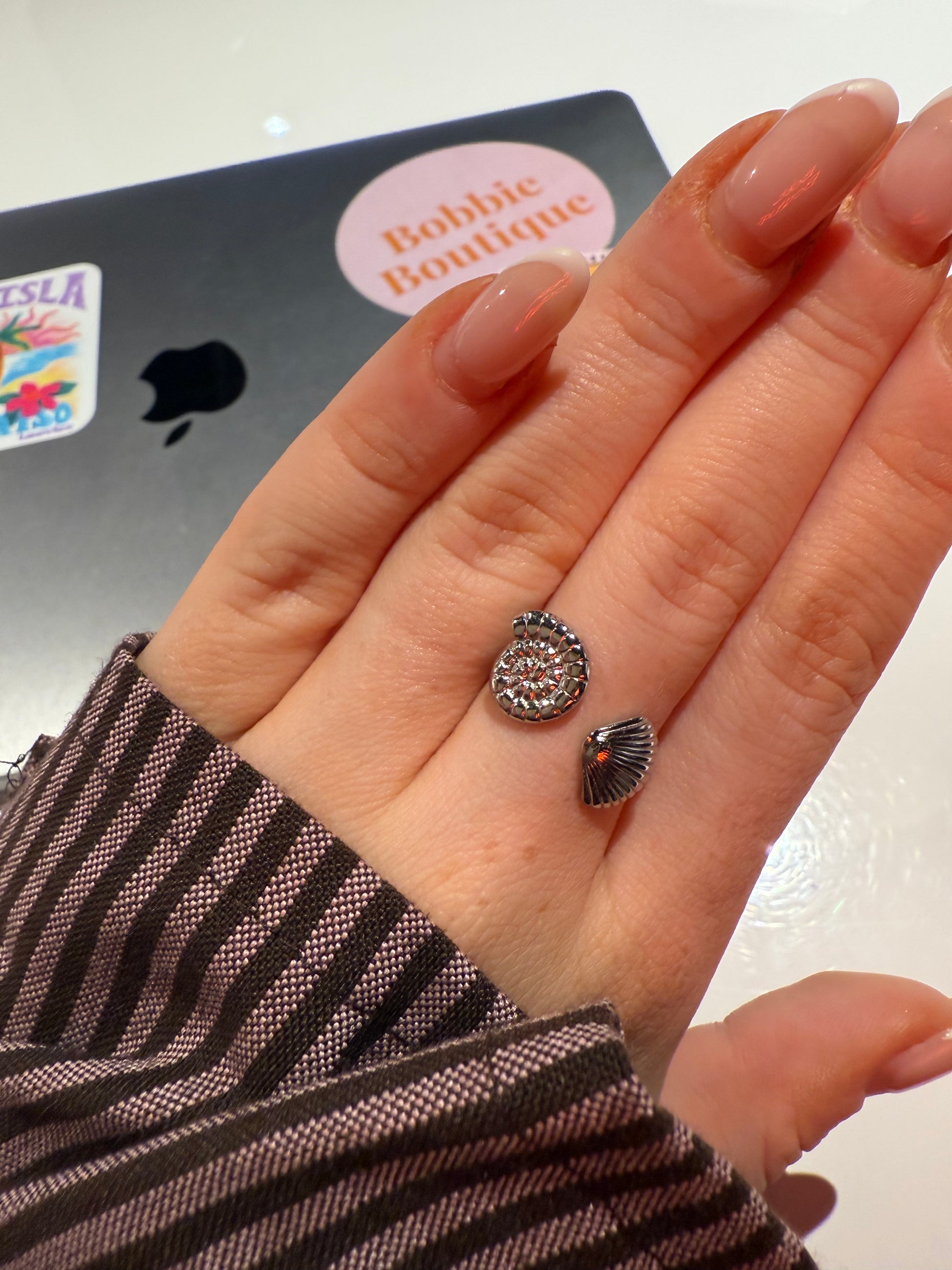 Vang de zomerse vibes met deze charmante ring met twee kleine schelpjes aan de uiteinden. Het subtiele, speelse ontwerp zit bovenop de vinger en geeft een vrolijke, beachy touch aan elke outfit. Perfect om solo te dragen of te combineren met andere ringen voor een trendy stacked look.