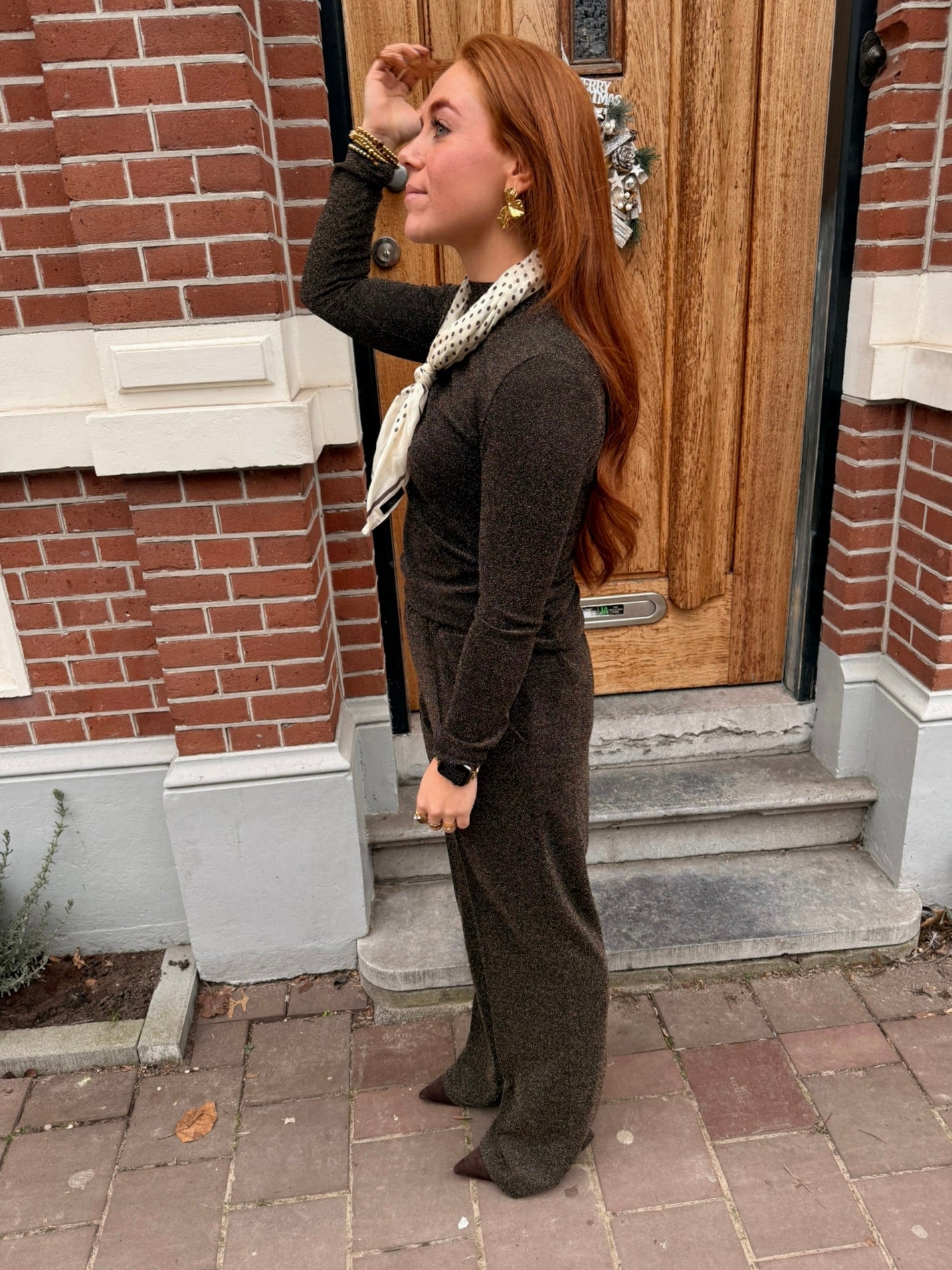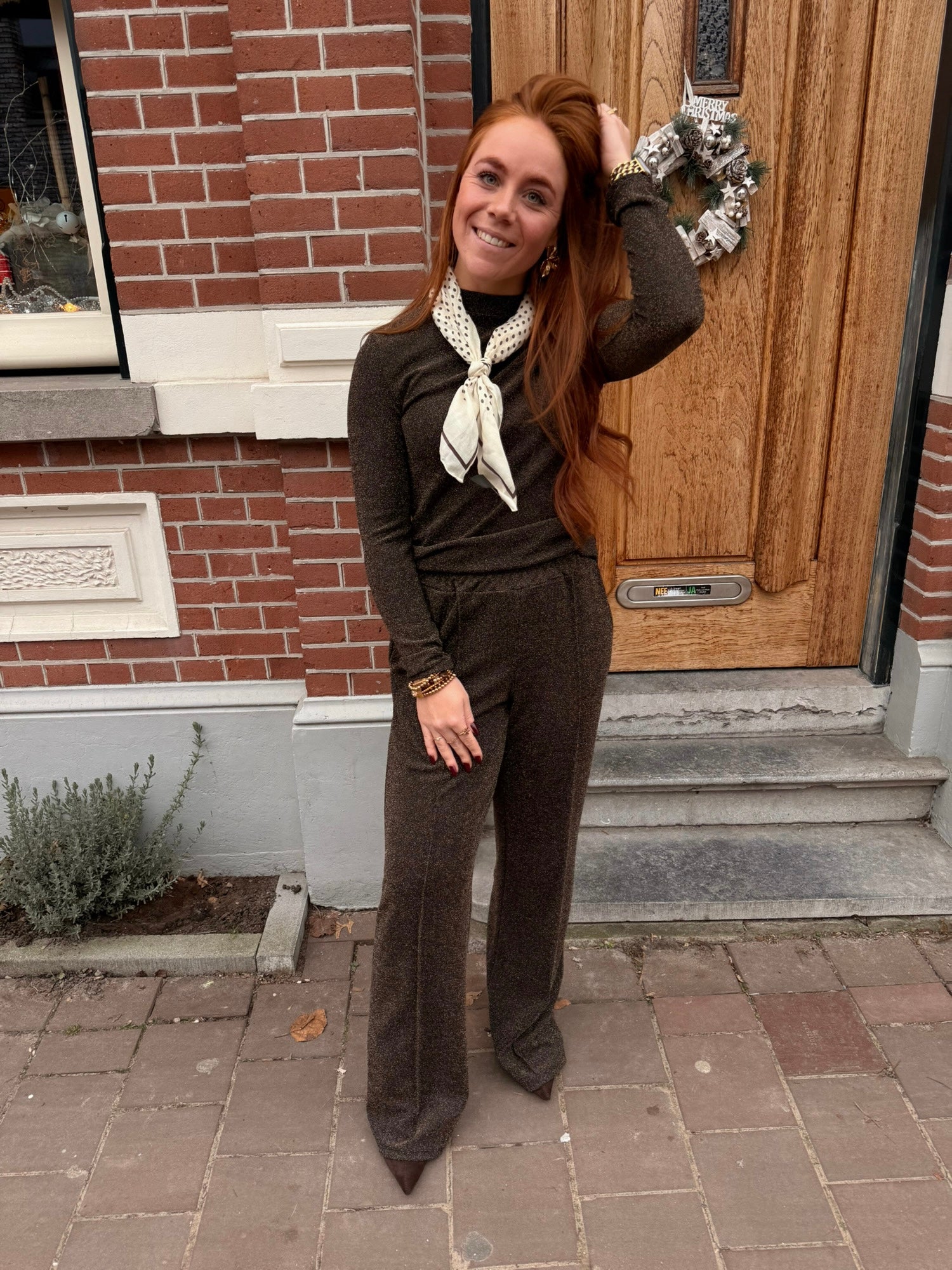 • Stylingtip: Draag ‘m als set met de broek voor een full glam look, of combineer met een zwarte pantalon voor een chic contrast.