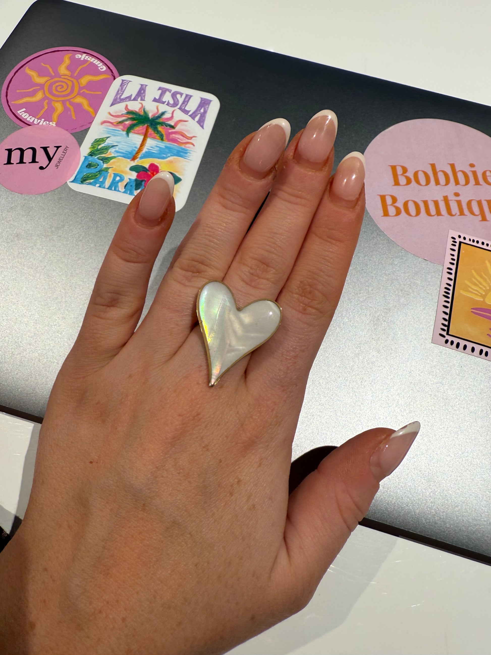 Maak een bold statement met deze grote hartvormige ring met een subtiele parelachtige glans. Verkrijgbaar in goud en zilver, straalt deze ring elegantie en vrouwelijkheid uit. Perfect om solo te dragen voor een opvallende touch of te combineren met andere ringen voor een trendy stacked effect. Een must-have voor iedereen die van opvallende sieraden houdt!