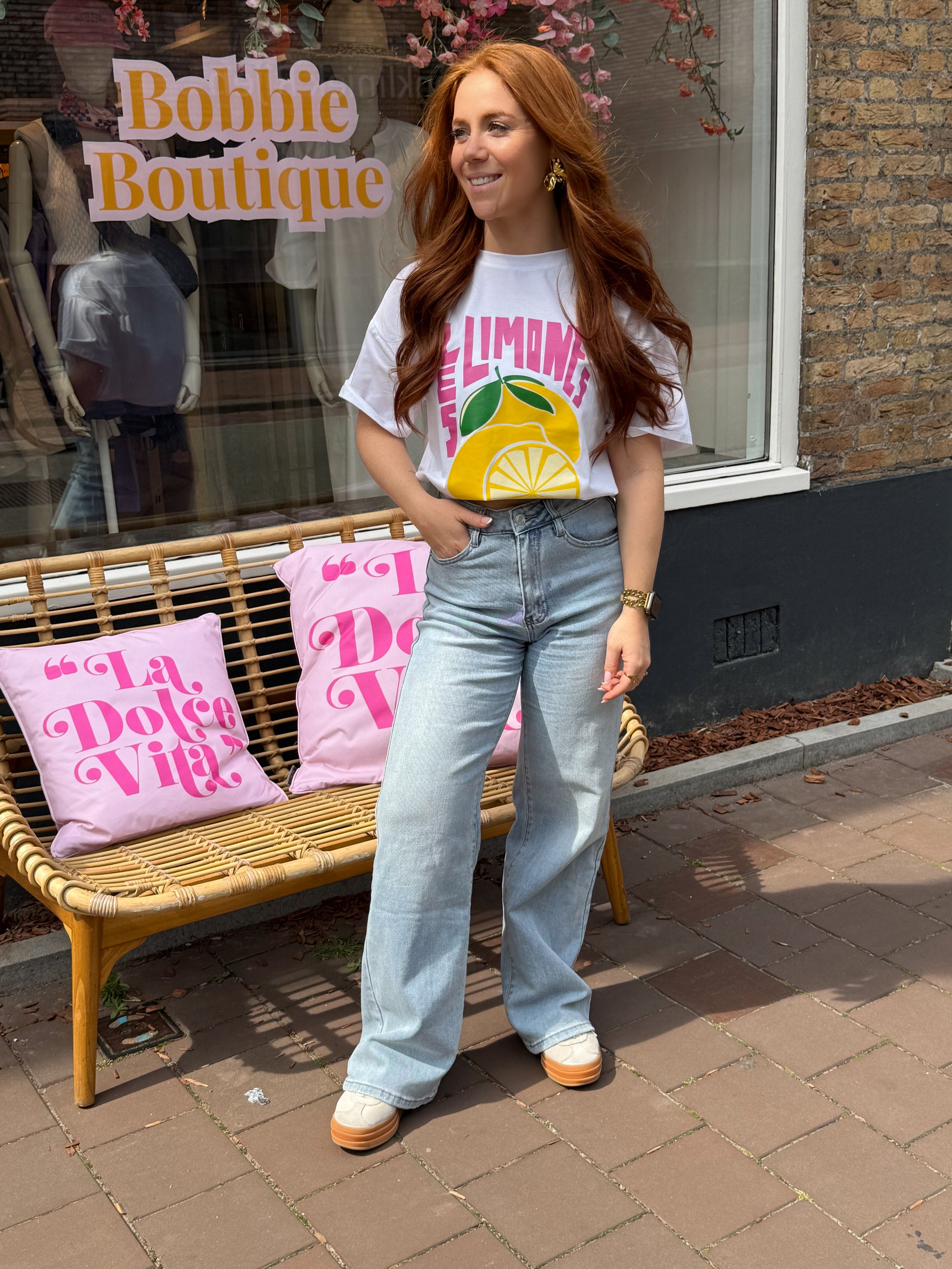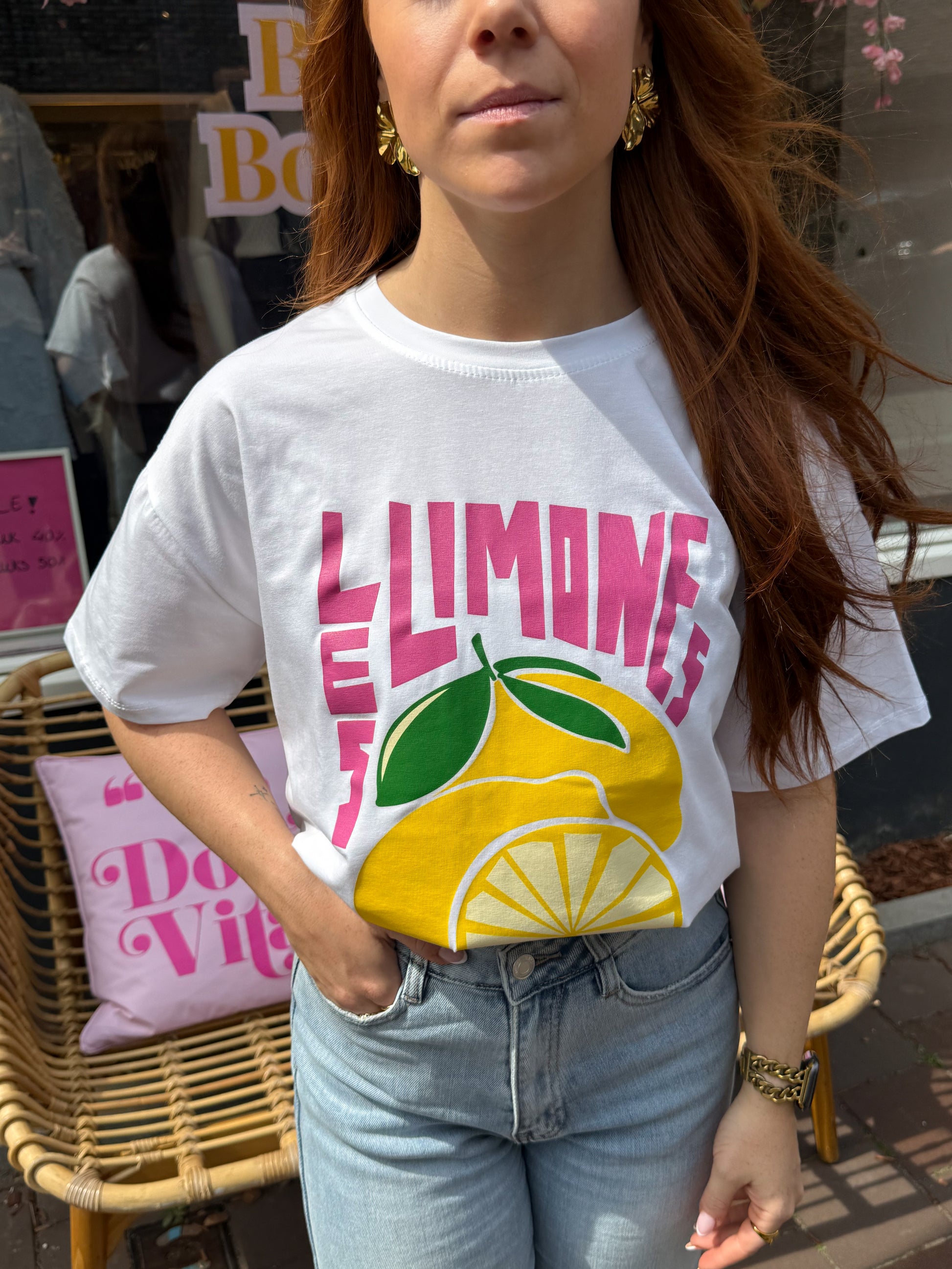 Dit T-shirt in een frisse witte kleur heeft een comfortabele pasvorm en een vrolijke roze print op de voorzijde met de tekst “Limones” en citroenen. Gemaakt van zacht, comfortabel materiaal, ideaal voor een casual en zomerse look. Combineer met jeans, rokjes of shorts voor een moeiteloze outfit.