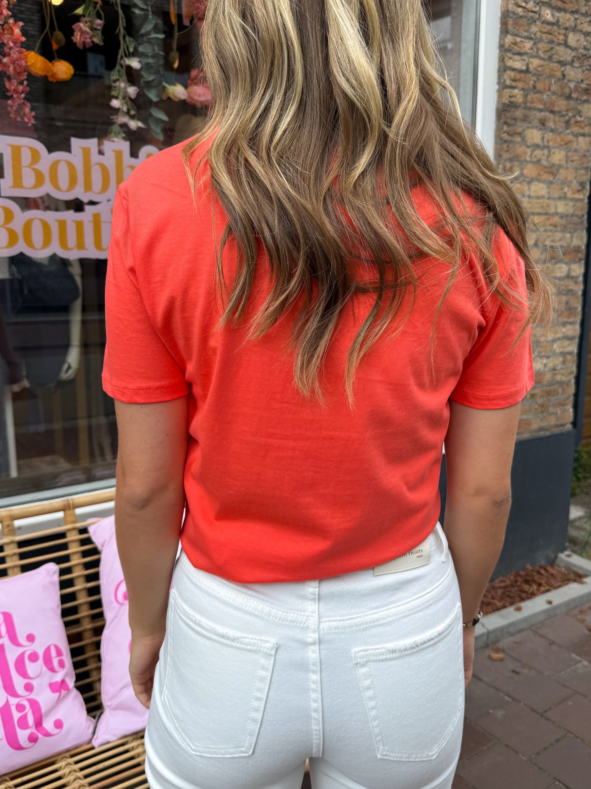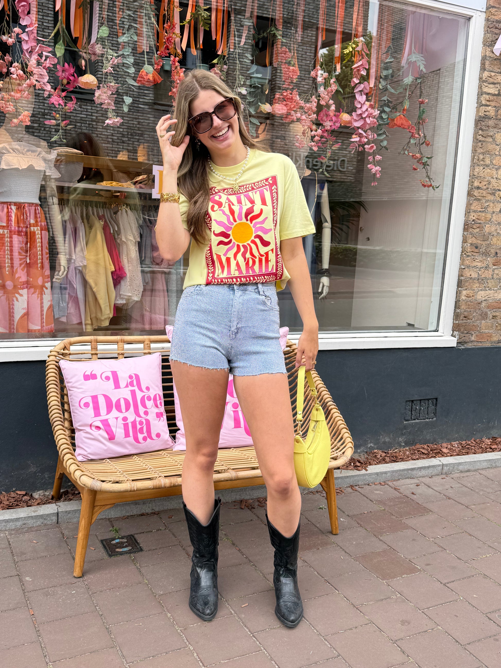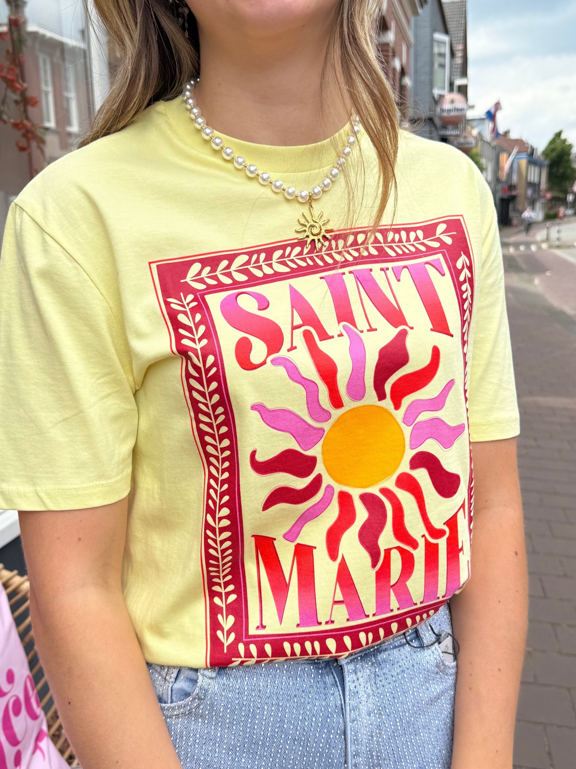 Dit T-shirt brengt instant zomer vibes in je outfit. De kleurrijke "SAINT MARIE" print met zon in het midden maakt 'm een echte eyecatcher, perfect voor zonnige dagen of gewoon wanneer je wat extra kleur kunt gebruiken. Gemaakt van een zachte katoenen stof die lekker luchtig zit. Draag 'm casual op een denim short of combineer 'm met een rokje voor een speelse look. Verkrijgbaar in fris geel en fel oranje!