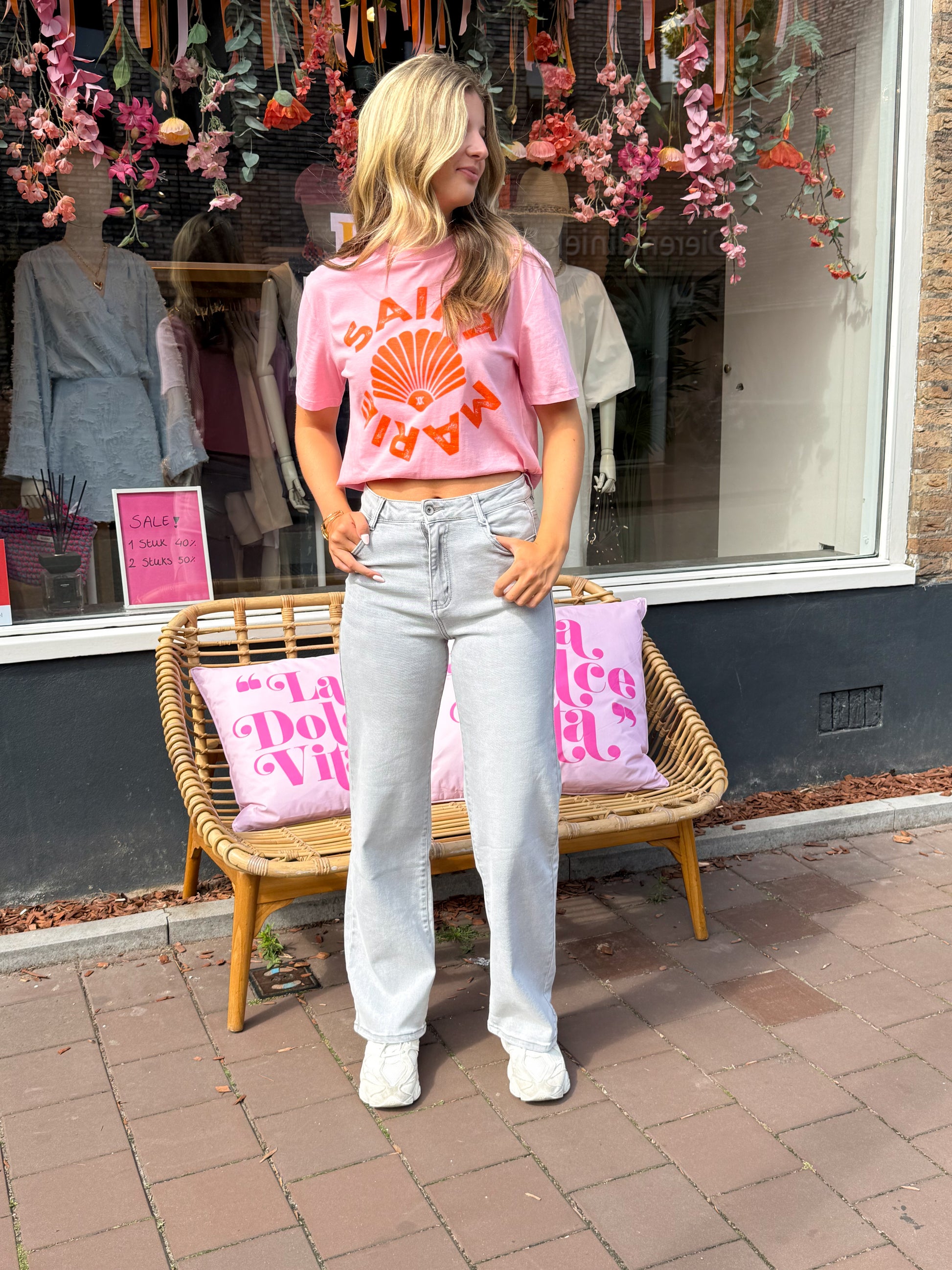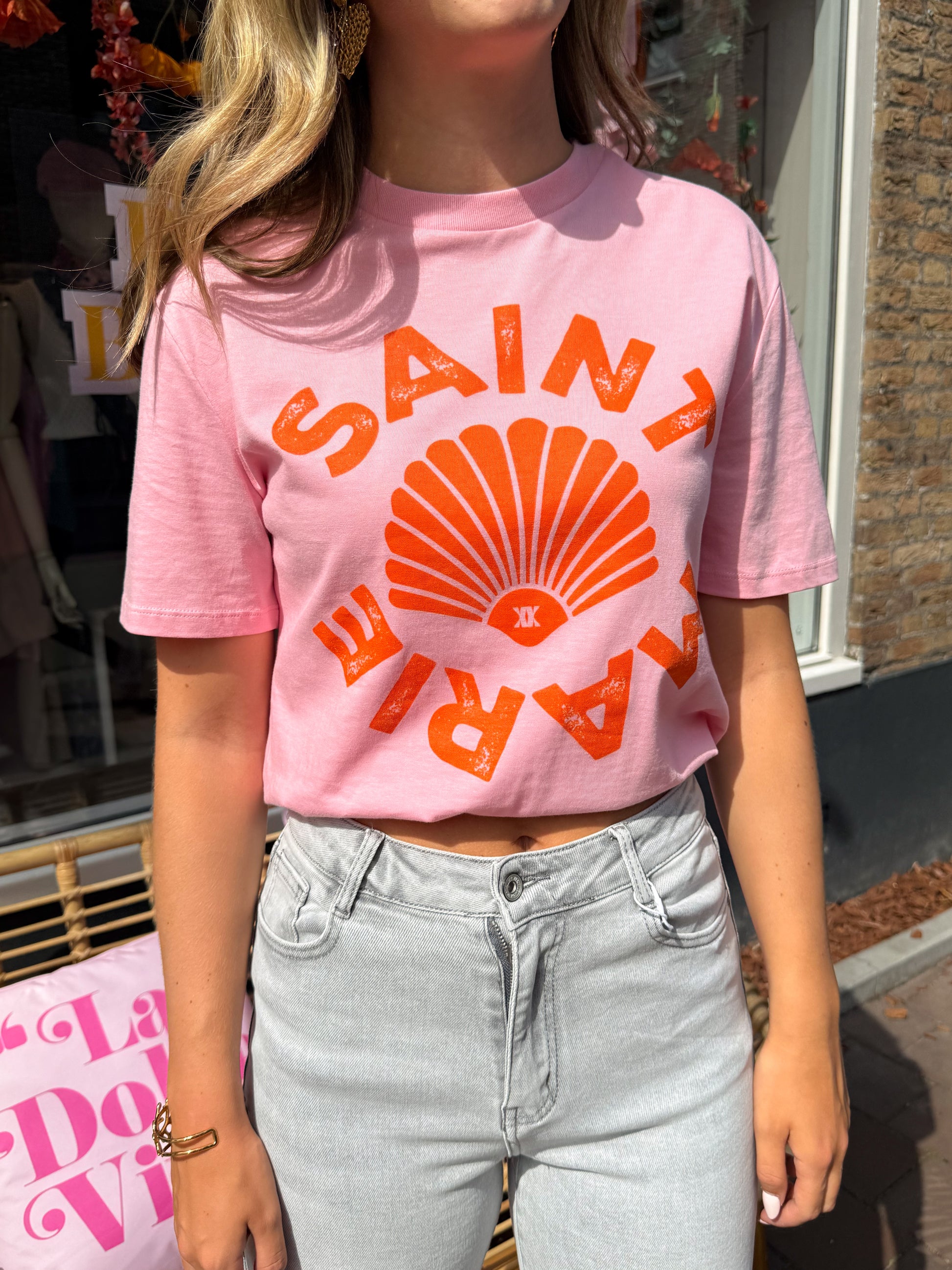 Dit T-shirt in een zachte roze kleur heeft een comfortabele pasvorm en een opvallende oranje print met de tekst Saint Marie en een schelp. Gemaakt van zacht, comfortabel materiaal, ideaal voor een casual en zomerse look. Combineer met jeans, rokjes of shorts voor een moeiteloze outfit.