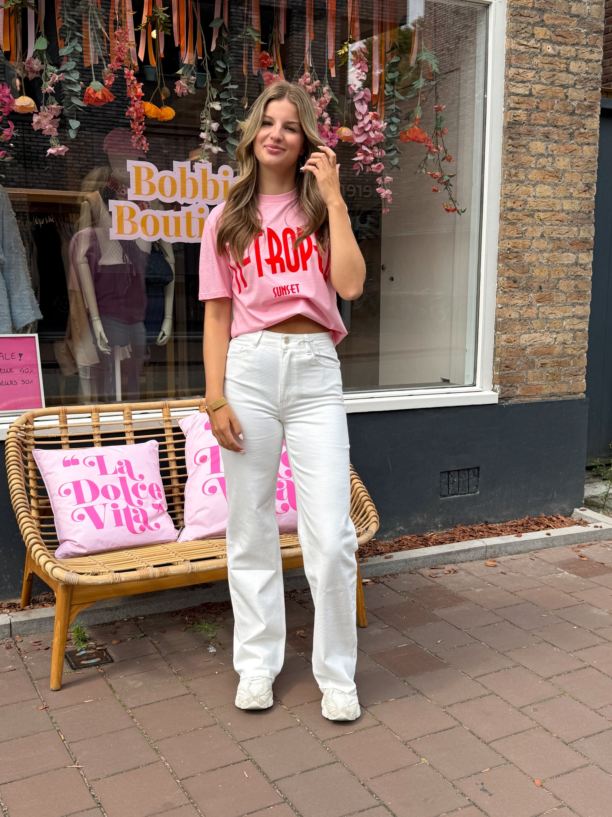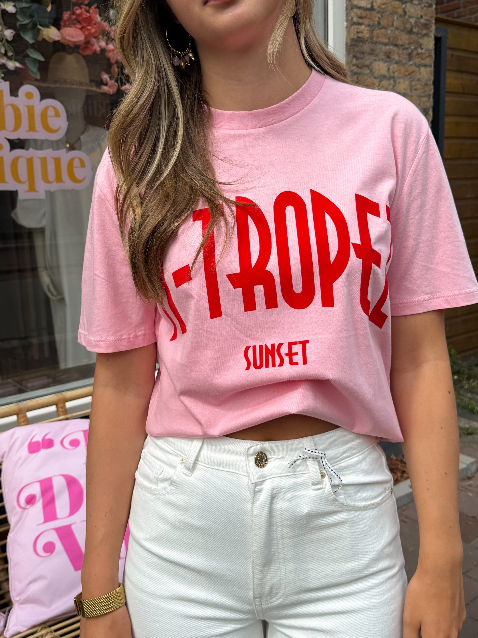 Dit T-shirt in een zachte roze tint heeft een comfortabele pasvorm en een casual uitstraling. Op de voorzijde staat in opvallende rode letters “St Tropez”, wat een speelse en trendy touch geeft. Perfect te combineren met jeans, rokjes of shorts voor een moeiteloze, stijlvolle look.