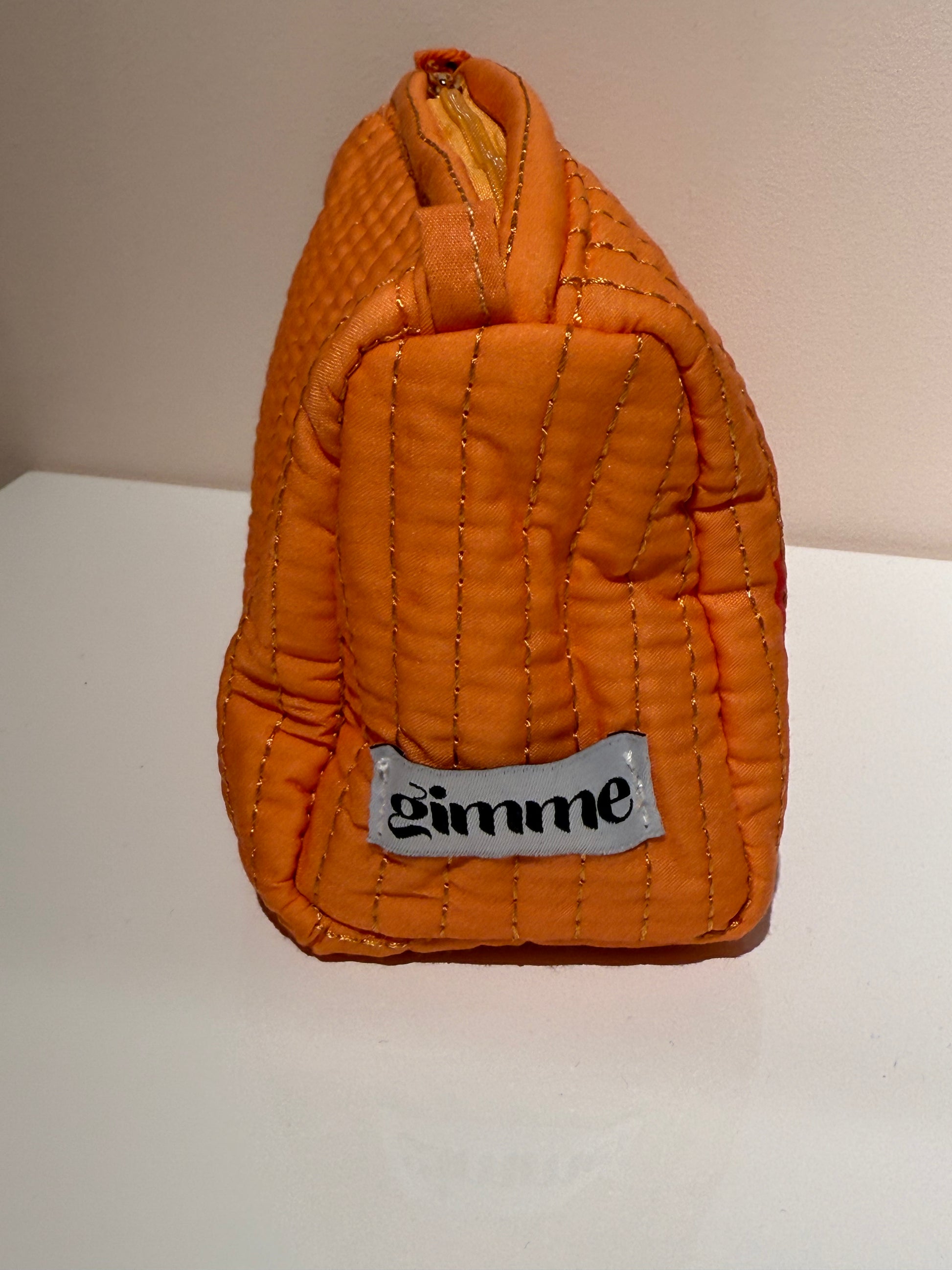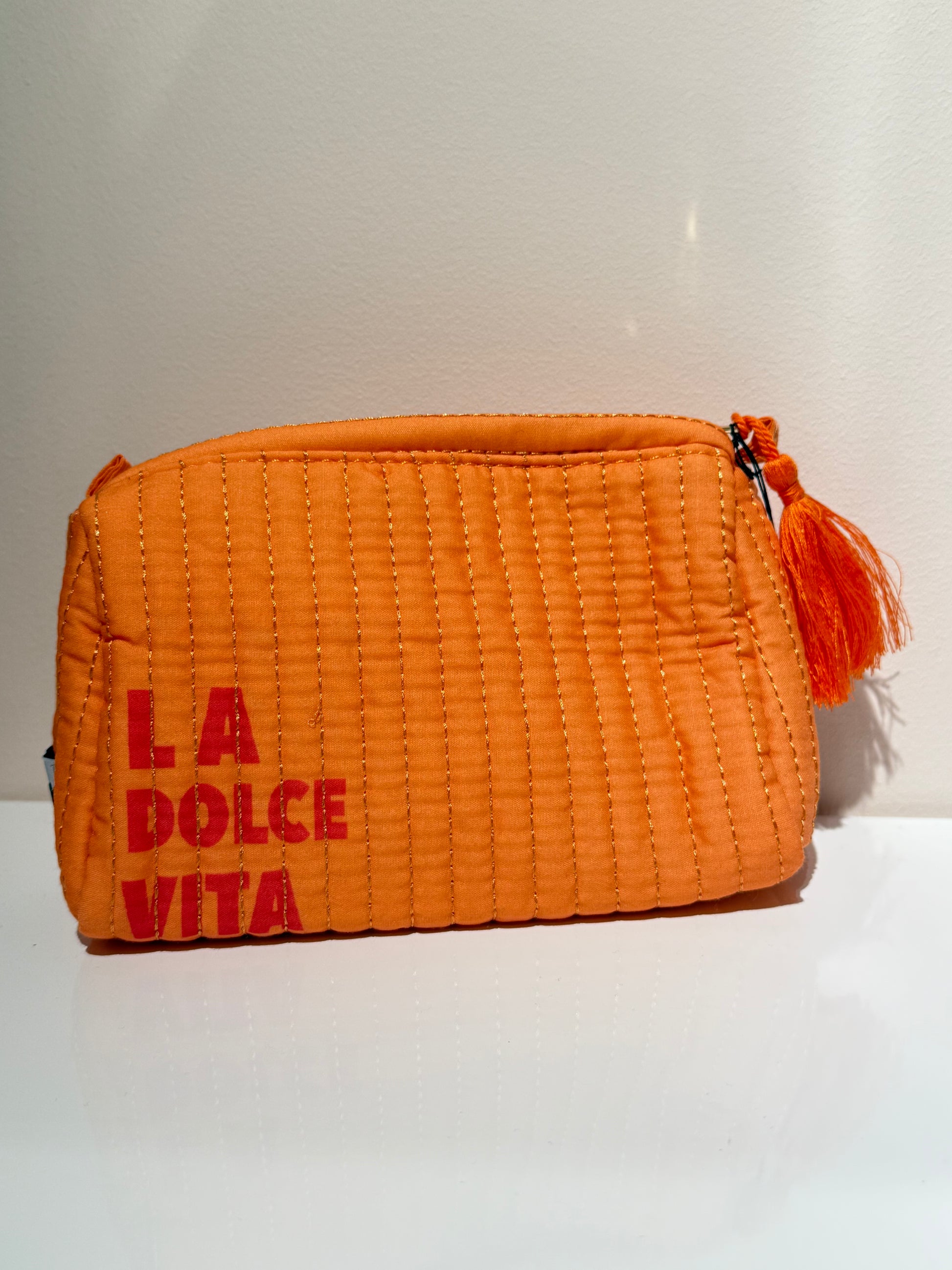 Breng een vleugje Italiaanse zomer naar je dagelijkse routine met deze vrolijke oranje toilettas, voorzien van de tekst La Dolce Vita in speelse roze letters. Ideaal voor make-up, verzorgingsproducten of kleine essentials, en makkelijk mee te nemen in je tas of op reis. Praktisch én stijlvol!