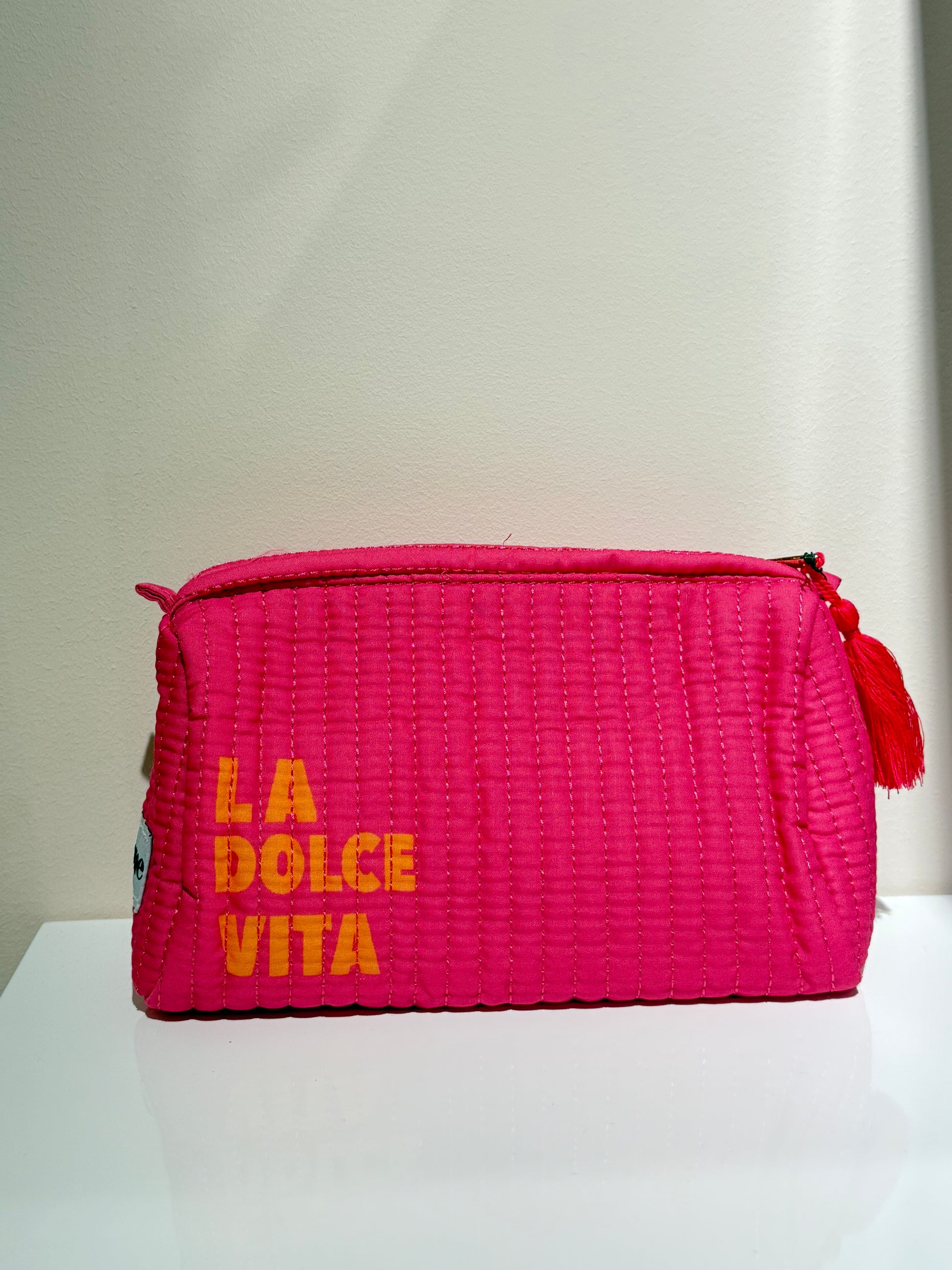 Voeg een vrolijke touch toe aan je dagelijkse routine met deze roze toilettas, voorzien van de tekst La Dolce Vita in opvallende oranje letters. Perfect voor make-up, verzorgingsproducten of kleine essentials, en handig mee te nemen op reis of in je tas. Een praktisch en stijlvol accessoire dat niet mag ontbreken!