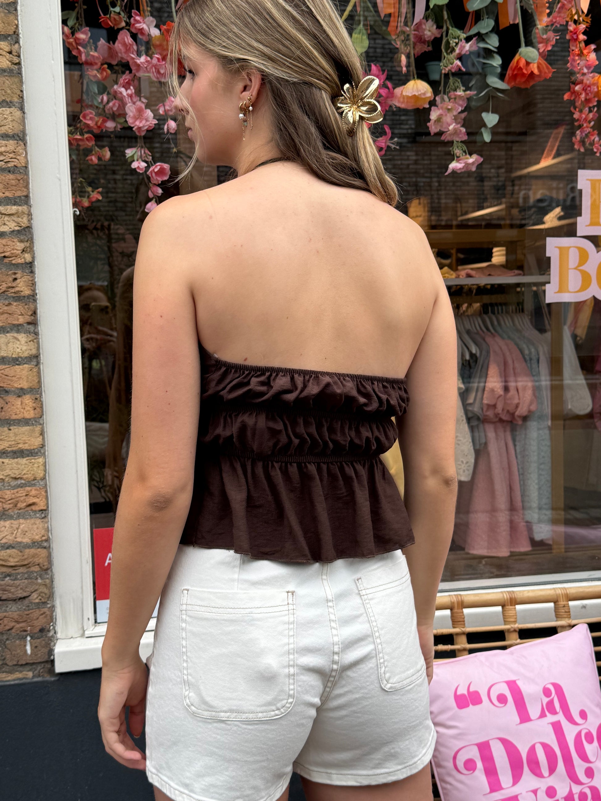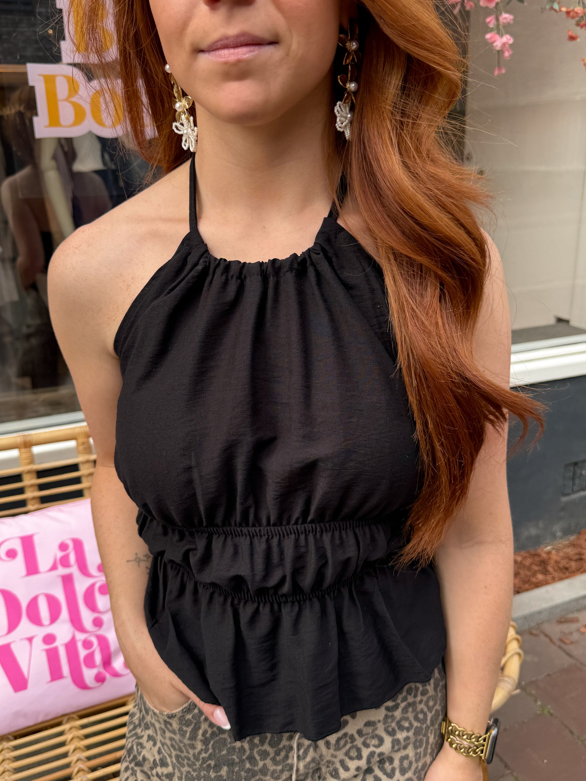 Deze elegante haltertop is gemaakt van een luchtige, fijn geweven stof die heerlijk zacht aanvoelt. In de taille zit een subtiel gesmokt detail voor een mooie, vrouwelijke pasvorm. De hals sluit met een speels strikje in de nek en de open rug geeft een zomerse, chique touch. Perfect voor een avondje uit of een stijlvolle zomerdag, zowel te combineren met een rok als met een mooie pantalon.