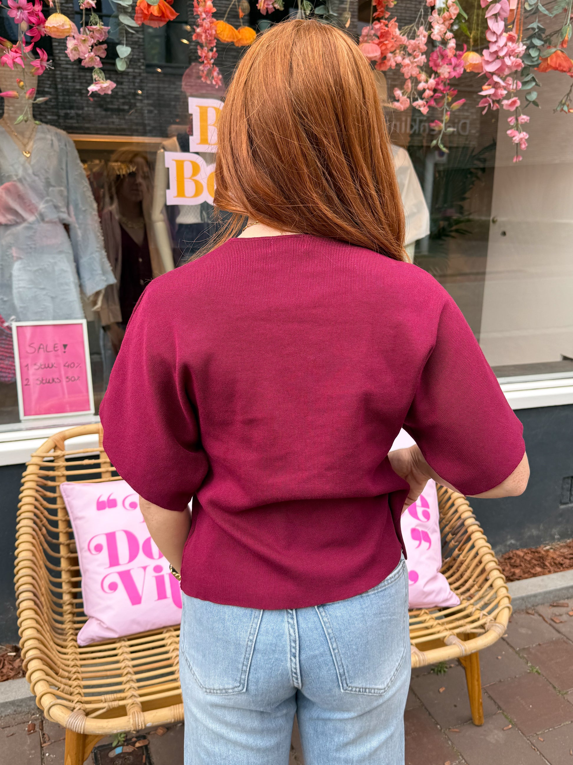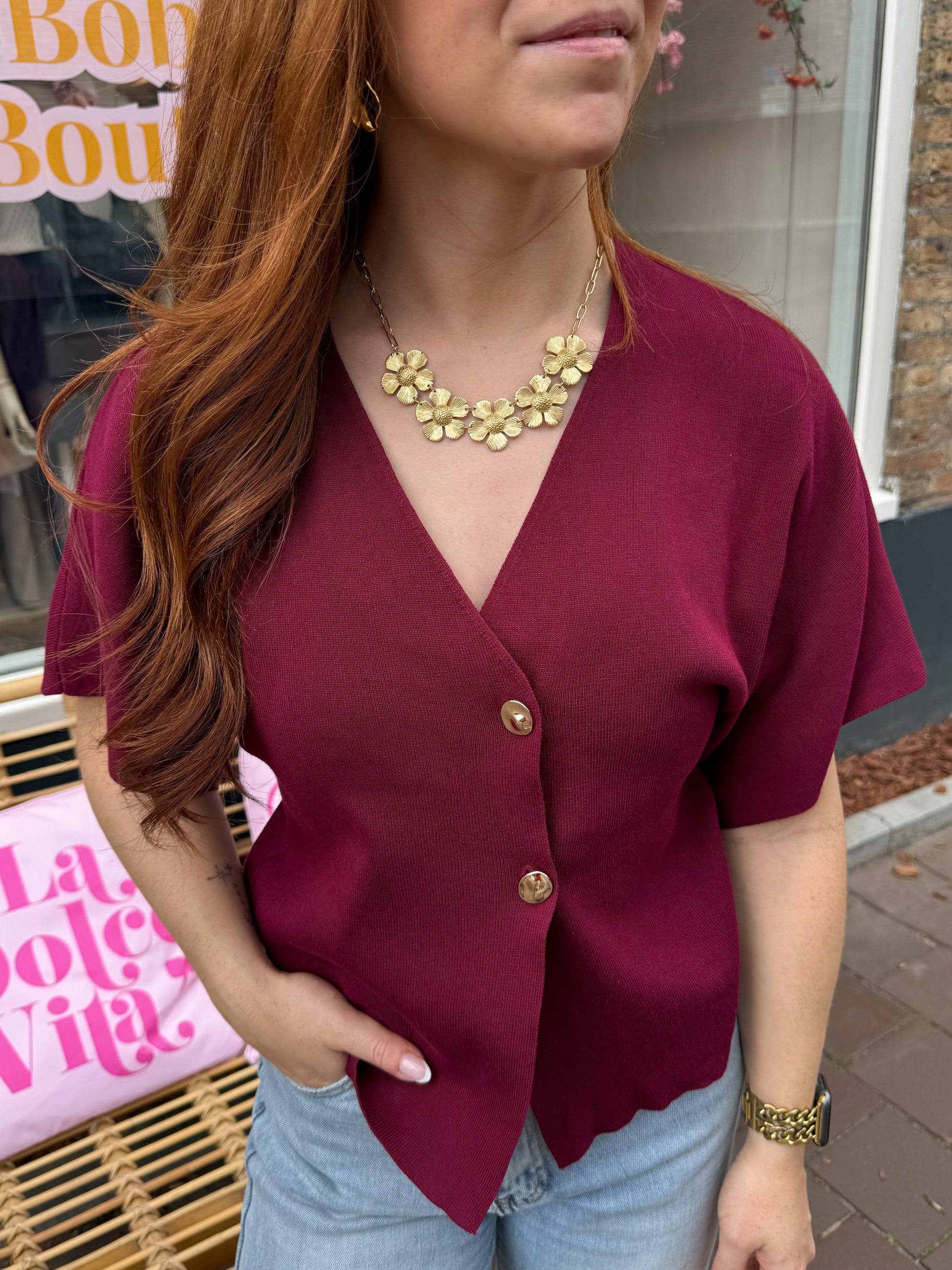 Deze bordeauxrode top met korte mouwen is classy met een comfy twist. De wat dikkere stof en gouden knopen aan de voorkant geven ‘m een luxe look, terwijl de aangesloten fit mooi in vorm blijft. Perfect om je outfit net dat beetje extra te geven, van diner tot day out.