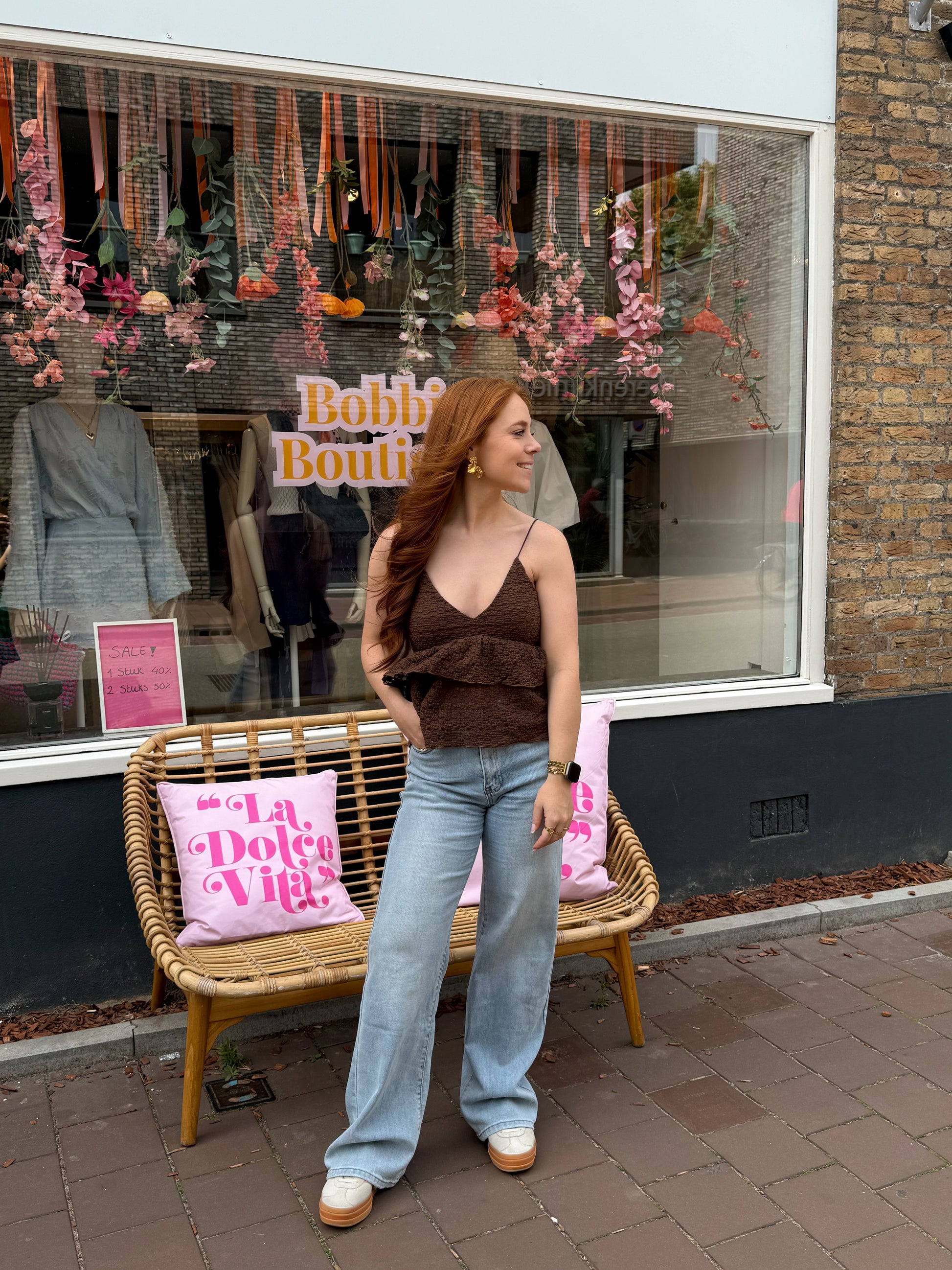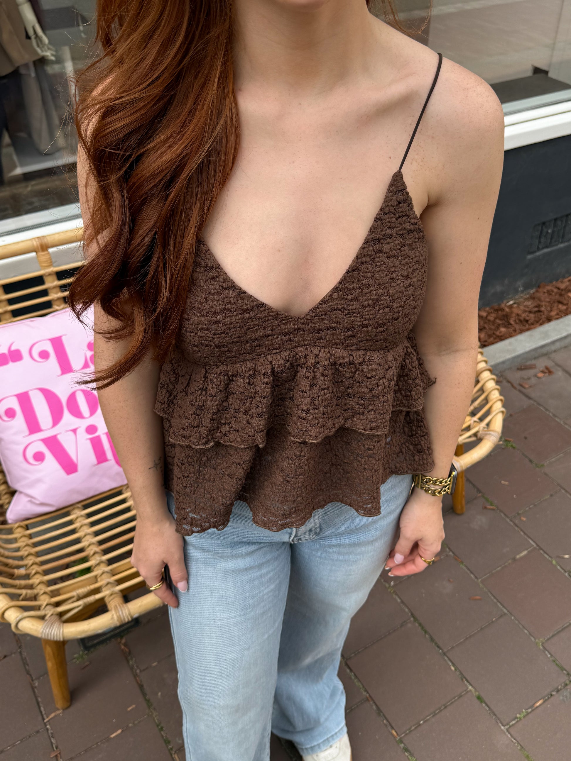Deze top is cute, comfy en super easy te stylen. De stretchy, gestructureerde stof en de speelse ruffle geven ‘m een vrouwelijke touch, terwijl de fijne bandjes zorgen voor een luchtige fit. Verkrijgbaar in choco en zwart allebei net zo leuk. Perfect op een jeans, rok of onder een blazer.