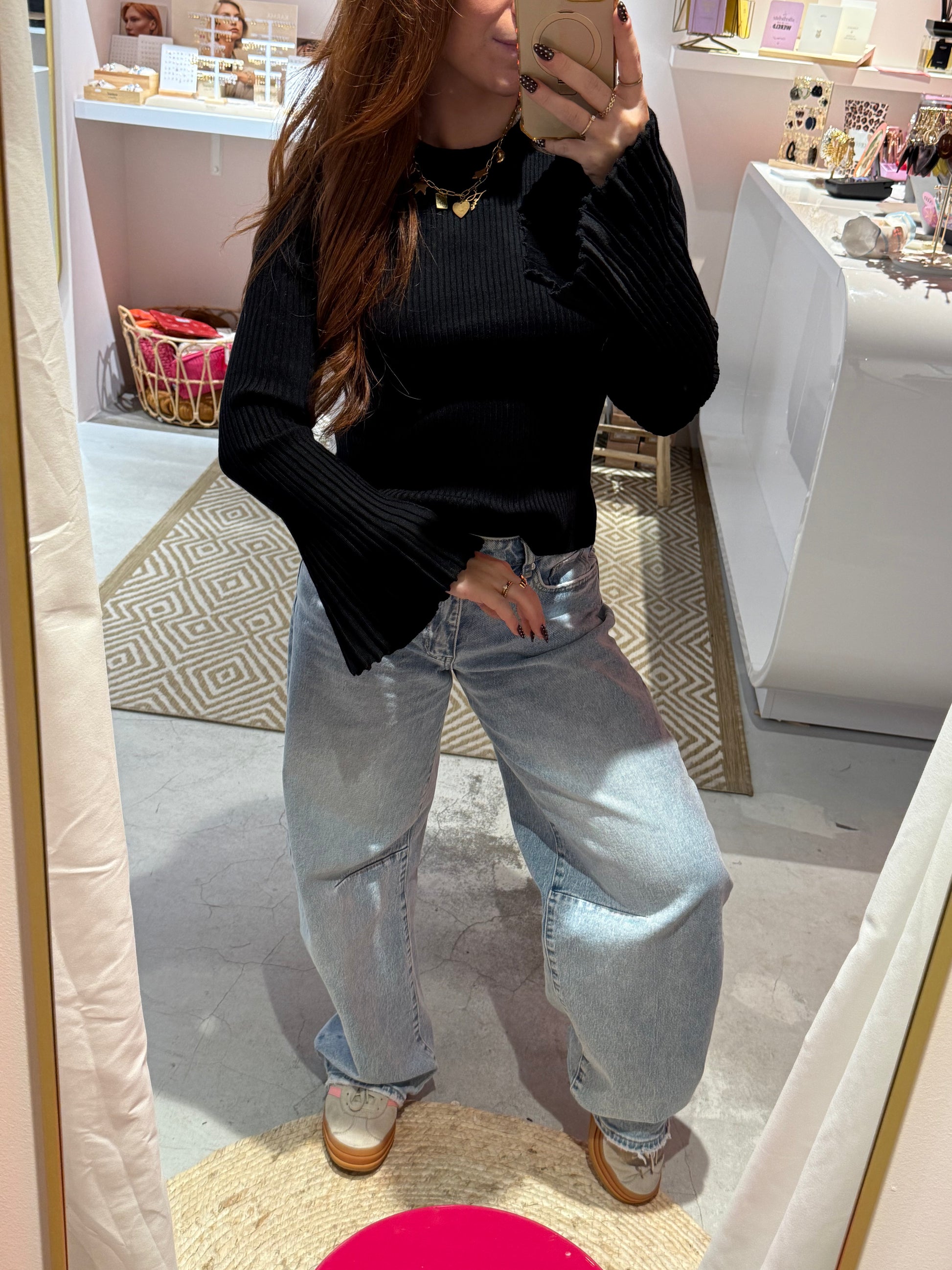 Deze top is een veelzijdige musthave met een vrouwelijke touch. Gemaakt van zachte ribbelstof, heeft hij lange mouwen die elegant wijd uitlopen voor een speels effect. Perfect te combineren met jeans, rokjes of onder een gilet of blazer voor een stijlvolle, gelaagde look.