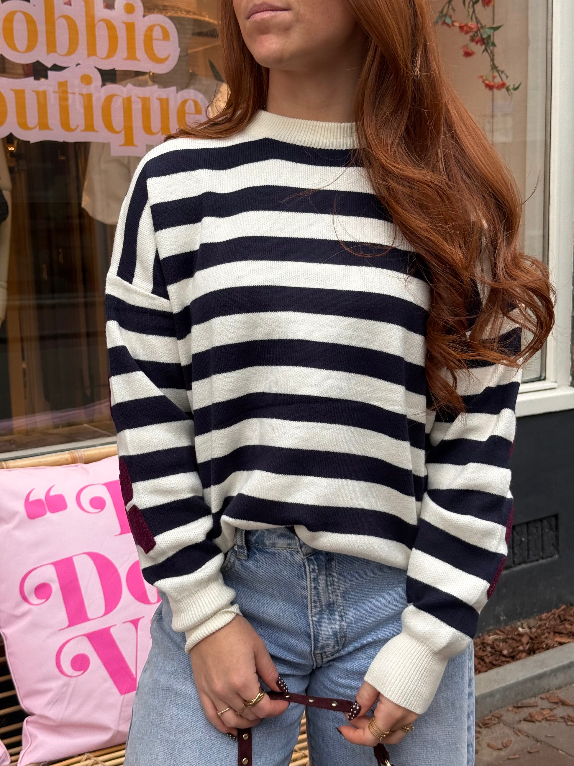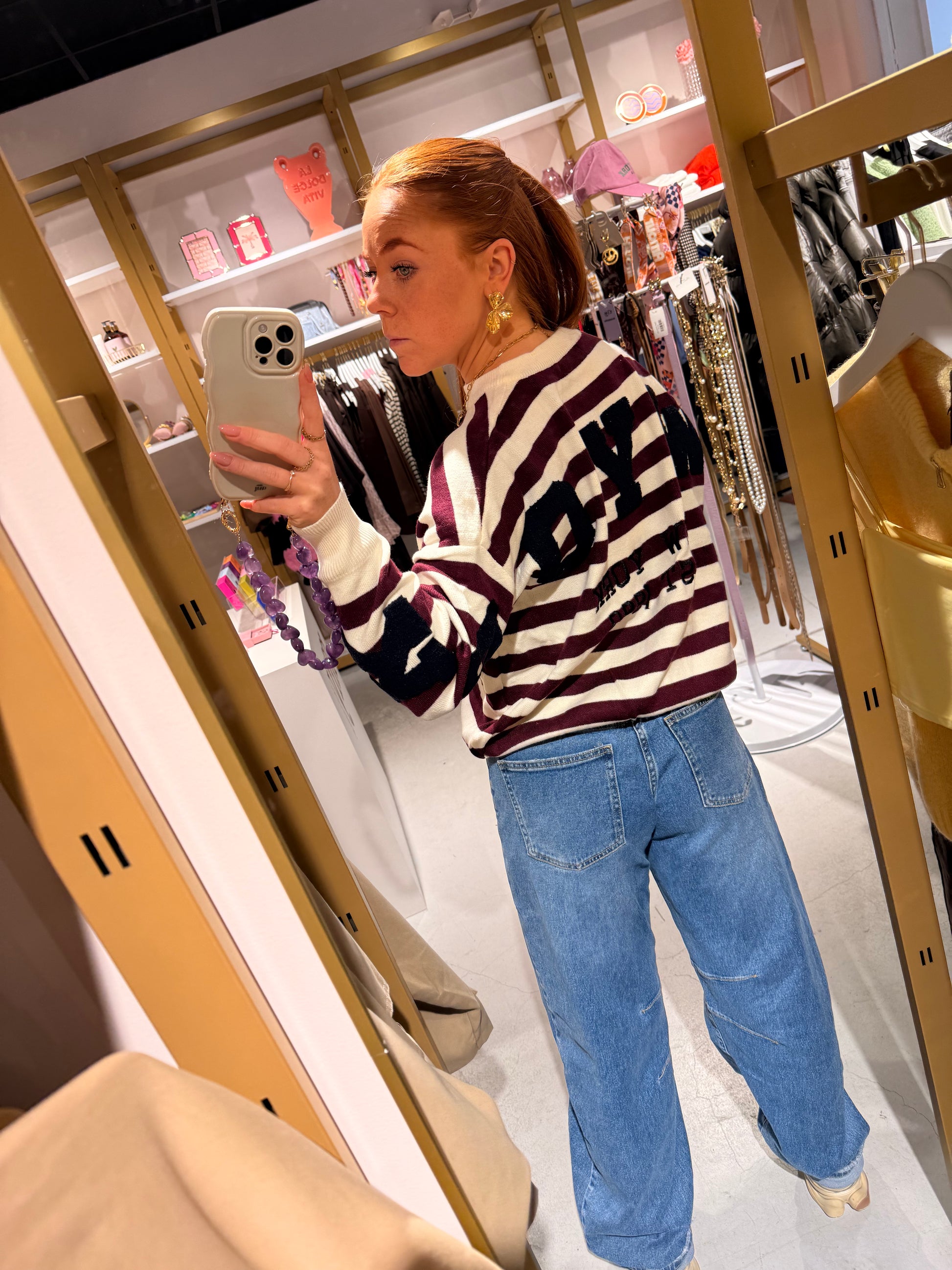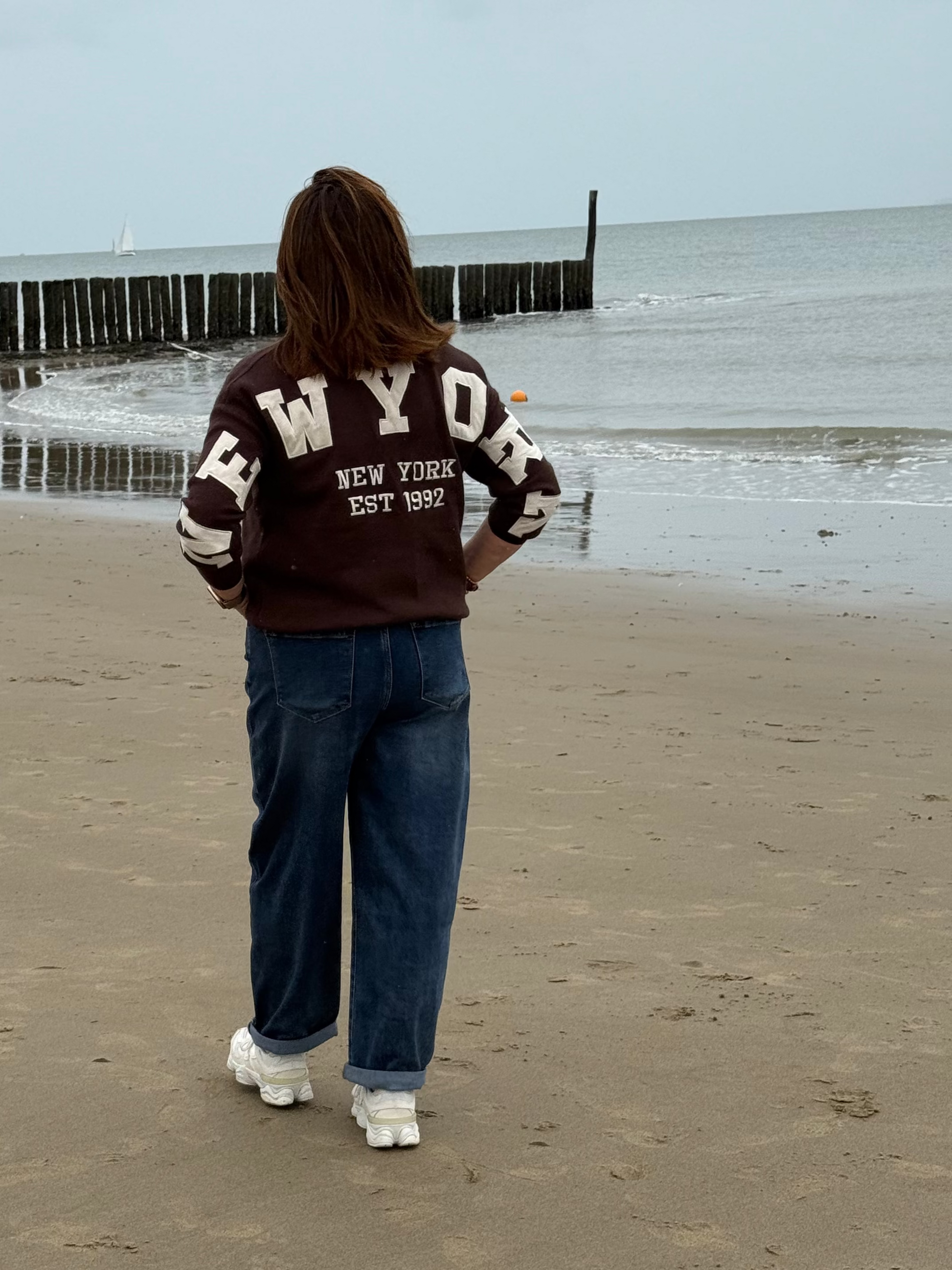 Deze zachte sweater is een comfy musthave met een stijlvolle twist. Uitgevoerd in navy, bordeaux & bruin met witte strepen en afgewerkt met een opvallende backprint met de tekst New York. Perfect om casual te dragen met jeans of te combineren in een sporty-chic look. Een trui die comfort en fashion moeiteloos samenbrengt.