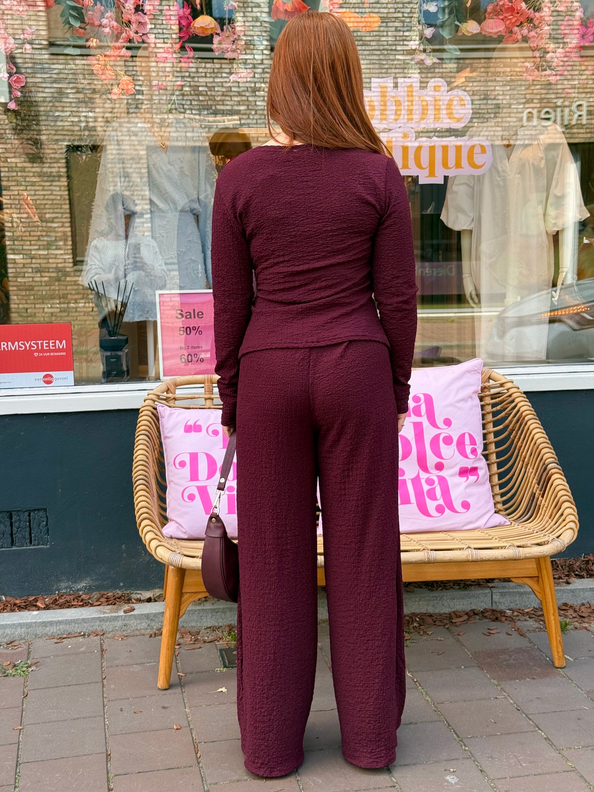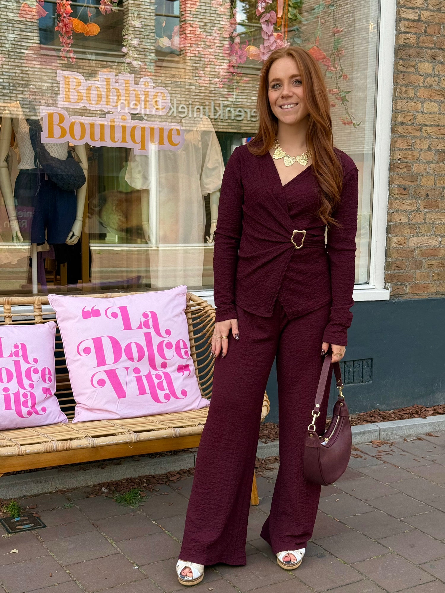 Deze stijlvolle two-piece set in een warme bordeauxkleur is gemaakt van een fijne, stretchy stof die heerlijk mee rekt voor optimaal draagcomfort. De top heeft een mooie overslag met subtiel gouden detail, terwijl de broek praktische zakken heeft voor een casual-chic touch. Perfect om samen te dragen voor een complete look, maar ook leuk te combineren met andere items uit je garderobe voor een speelse twist.