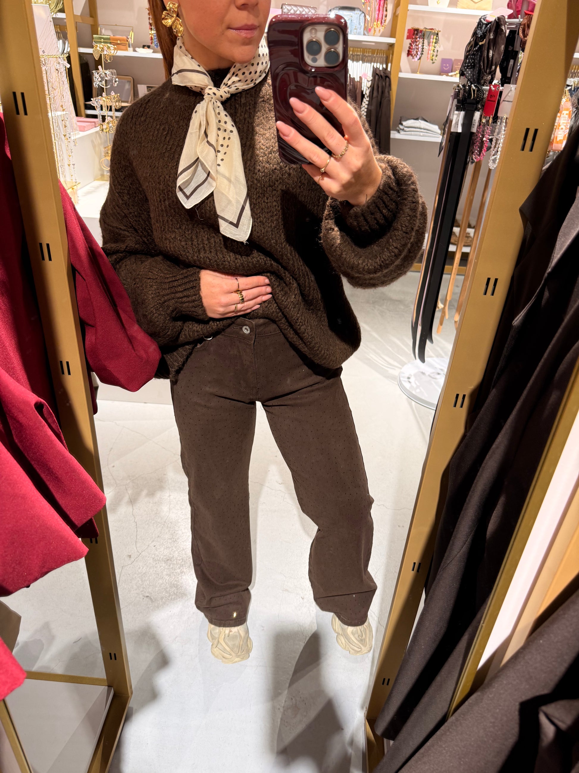 Een echte musthave voor je garderobe! Deze bruine wide leg jeans met strass steentjes combineert comfort met stijl en geeft elke outfit een trendy, moderne look. De hoge taille en wijde pijpen zorgen voor een flatterend silhouet dat zowel casual als chic gedragen kan worden. Style ‘m met een basic top en sneakers voor een relaxte everyday look, of draag ‘m met een blouse en laarsjes voor een classy touch. Met deze jeans zit je altijd goed!